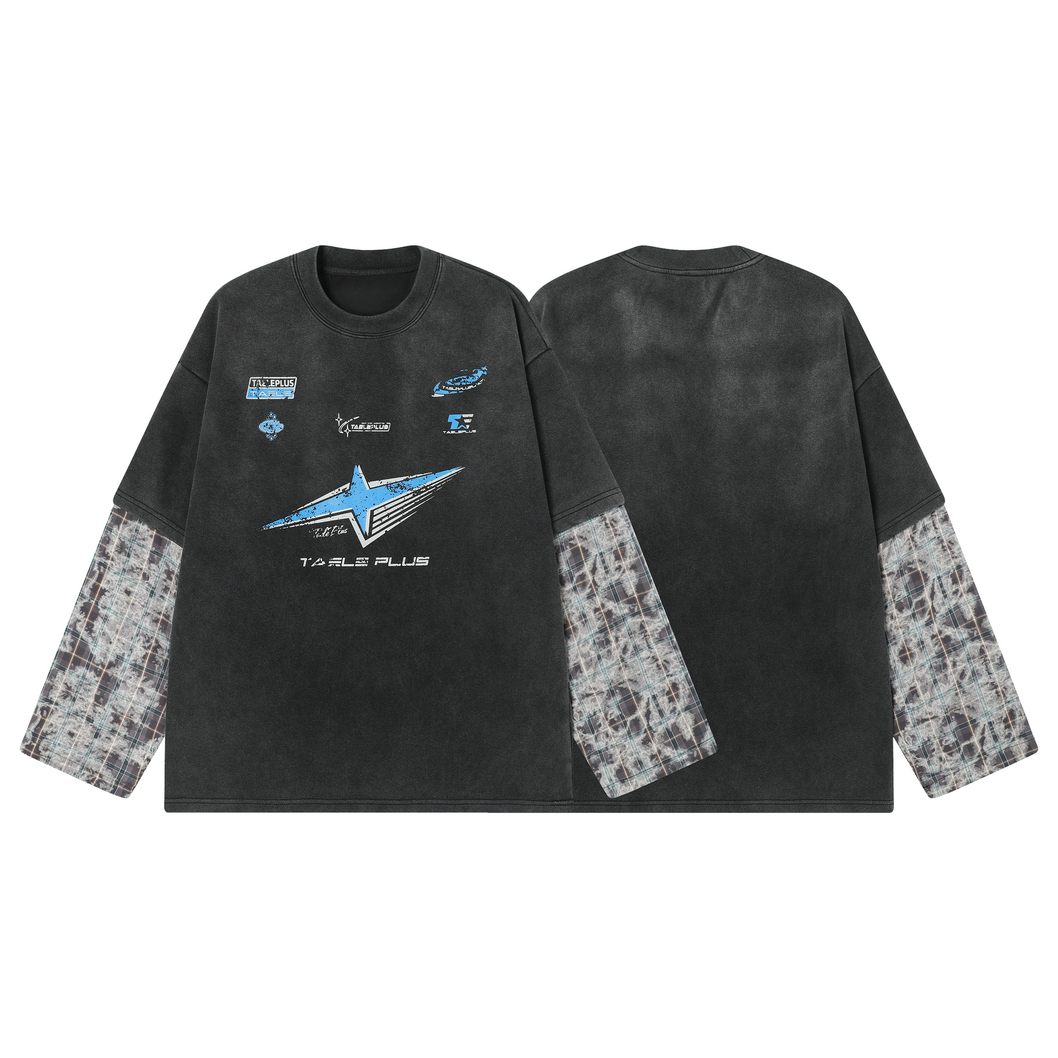 Clothing details: Washed vintage effect, layered long-sleeve illusion, bold front graphic print, crew neck, relaxed fit.