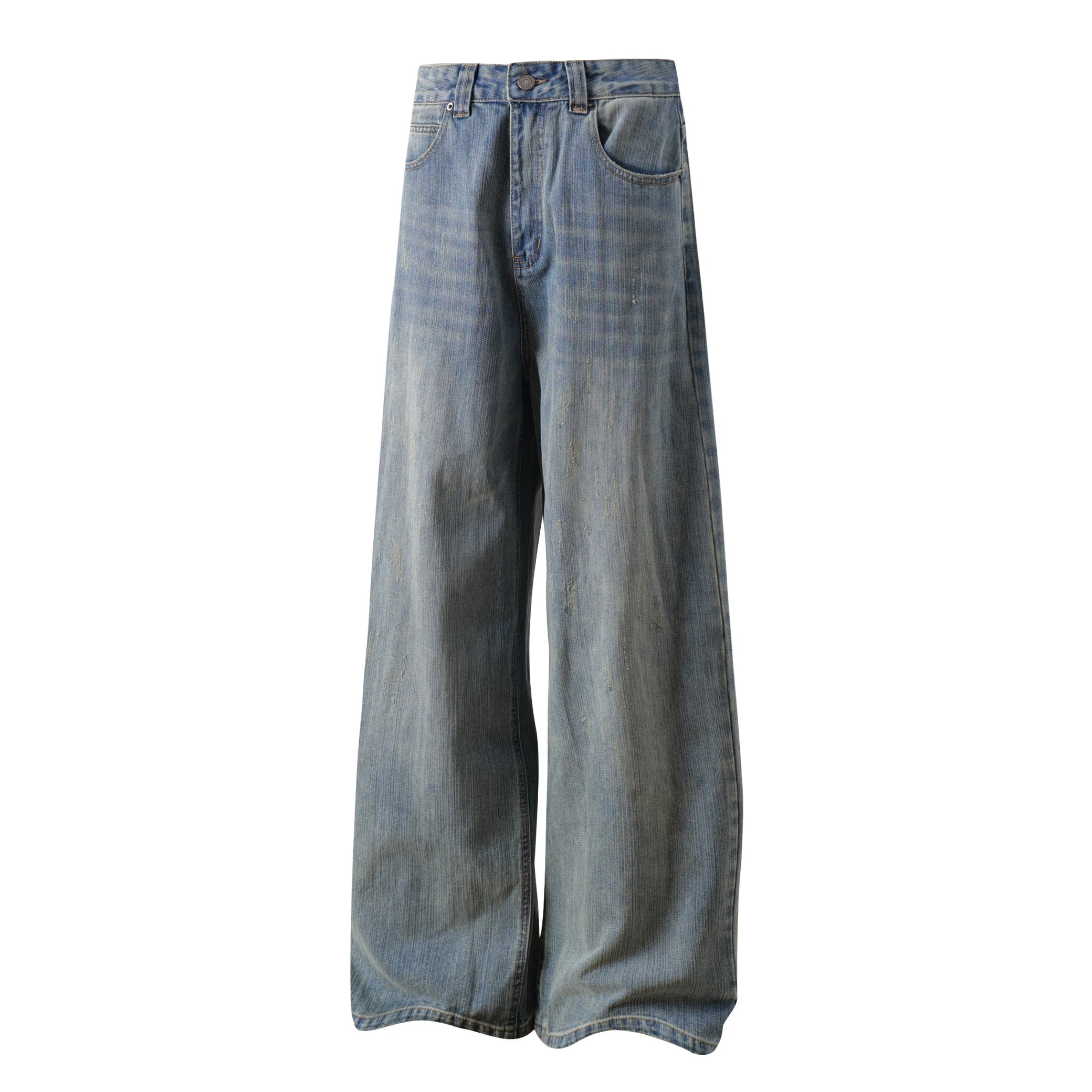 Clothing details: Balloon Wide-Leg Silhouette, Vintage Light Wash, Whisker & Fade Details, Five-Pocket Design, Structured Waistband, Retro Streetwear Fit