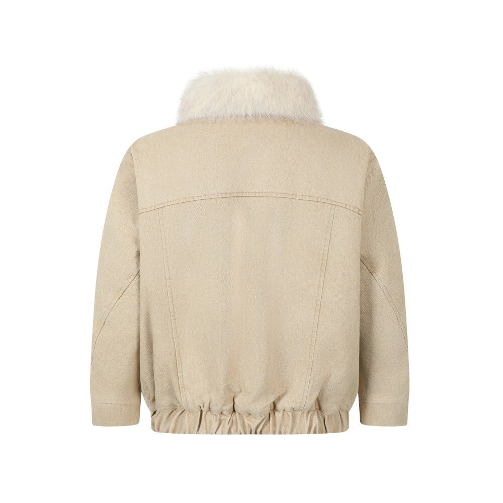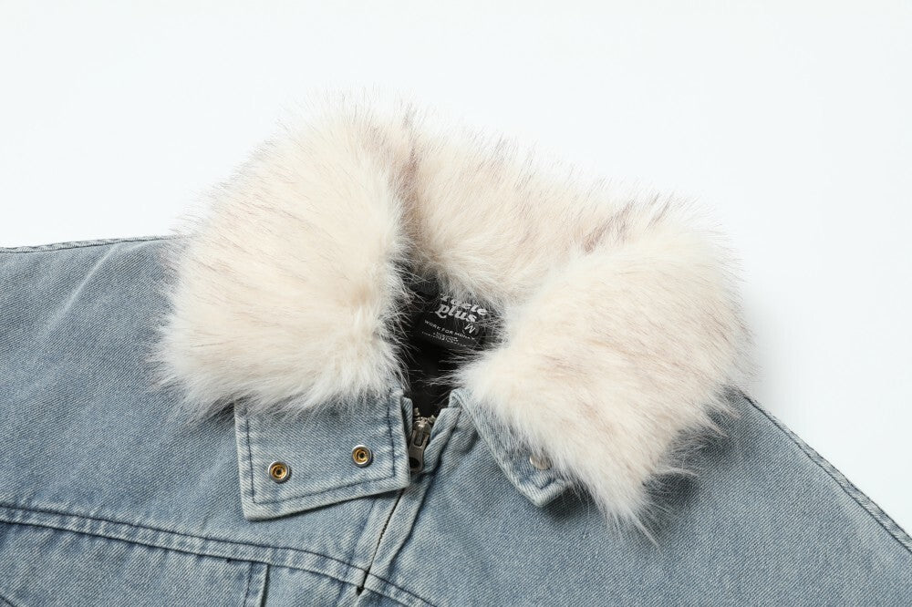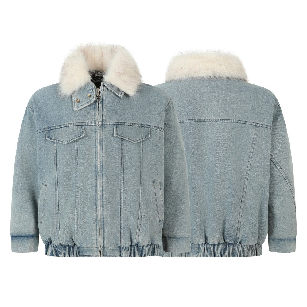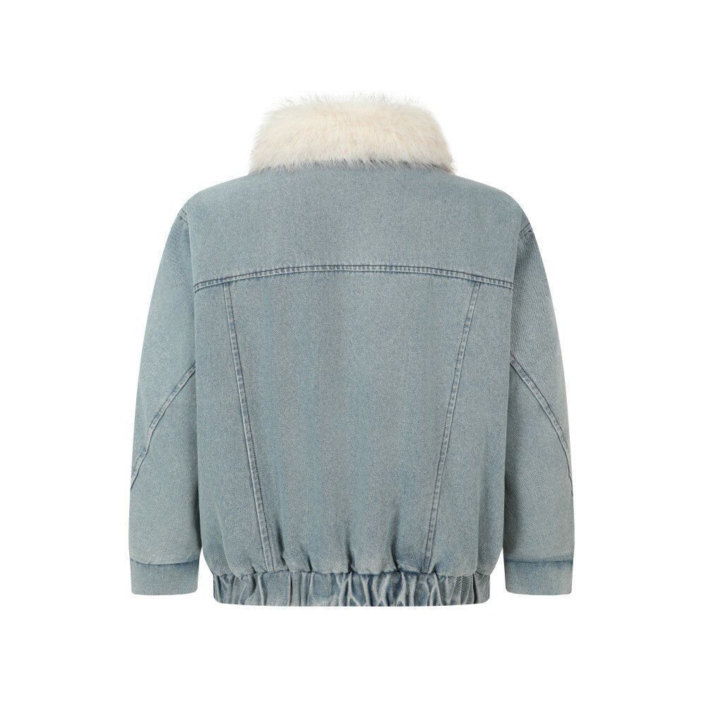 High-Street Detachable Fur Collar Washed Denim Padded Jacket