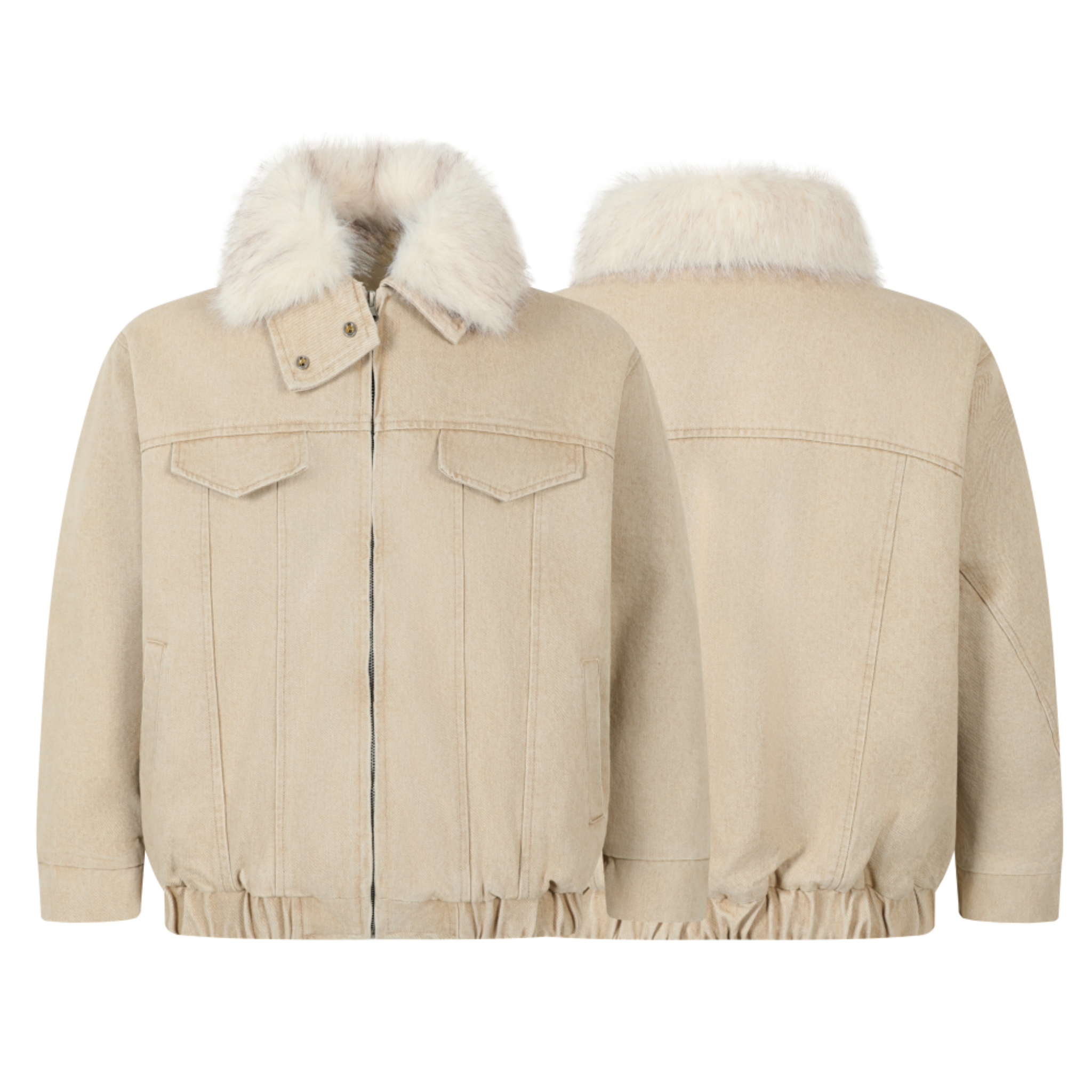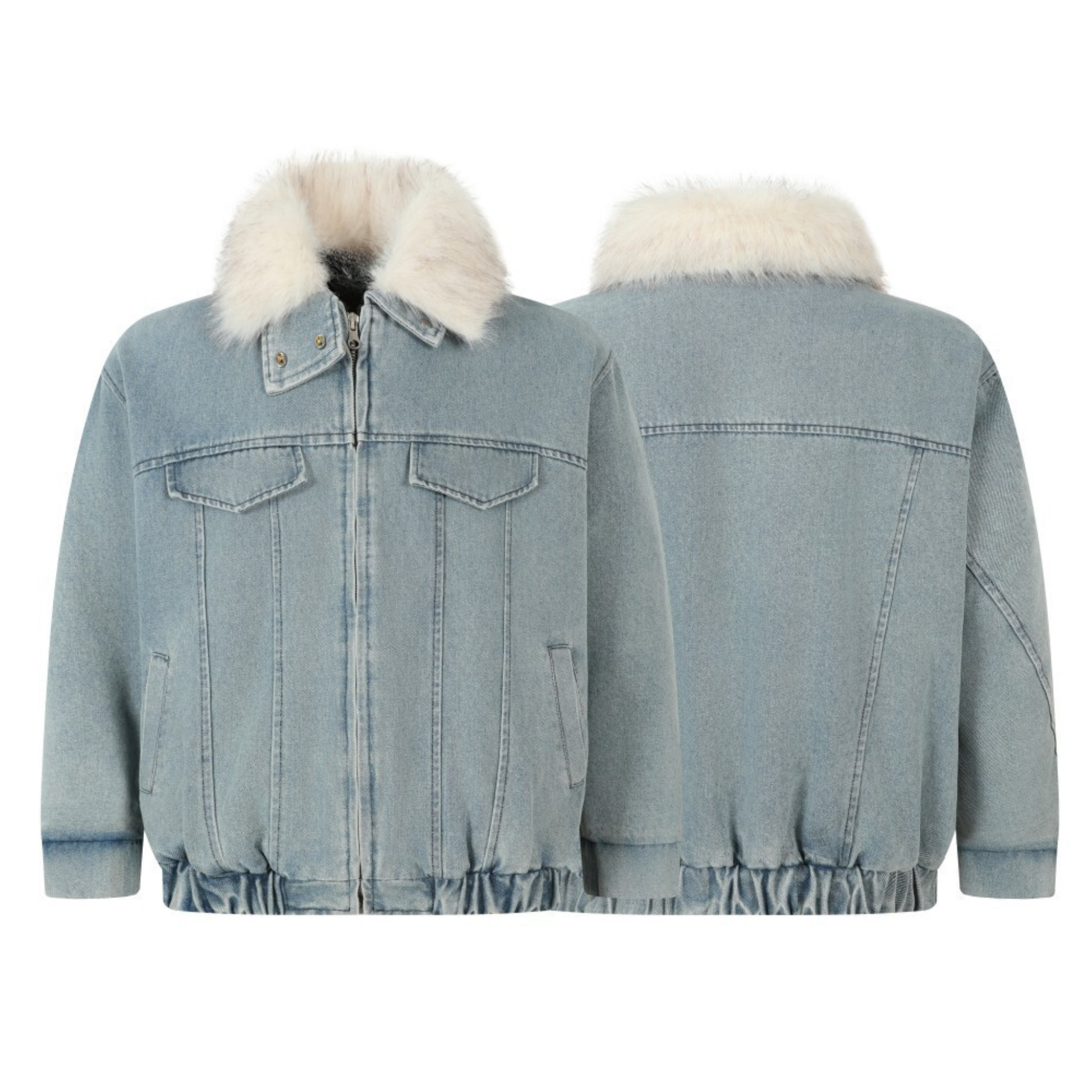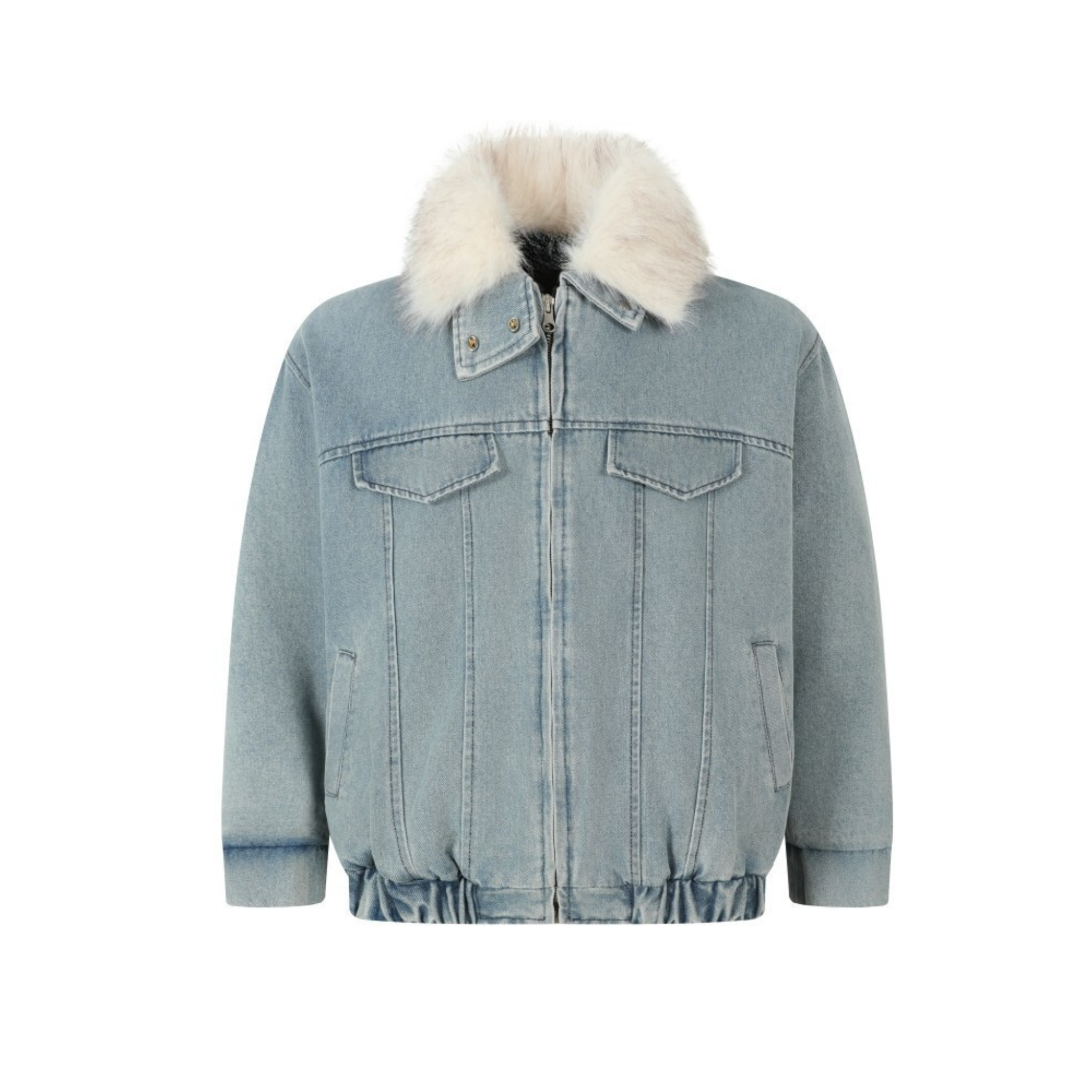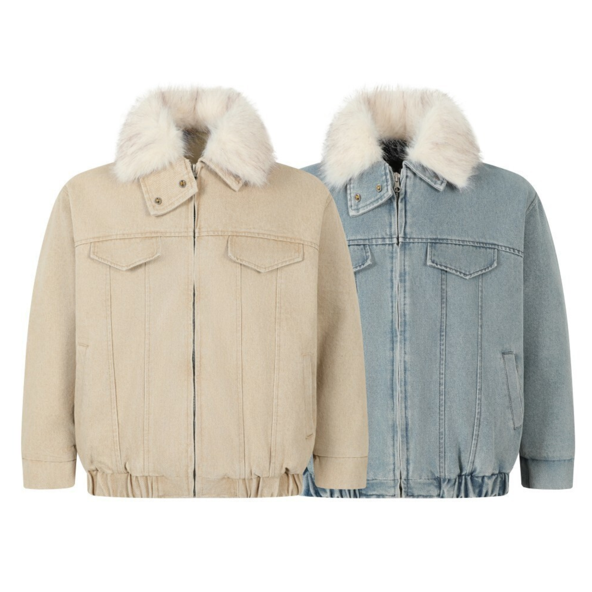 The Omirad Faux Fur Collar Denim Jacket brings a fresh streetwear twist to a timeless silhouette. Made from a premium cotton-poly blend, it features a detachable faux fur collar for versatile styling — switch between a clean denim look or a bold winter-ready statement. The structured stitching, snap-button details, and elastic hem create a perfect blend of ruggedness and modern edge.