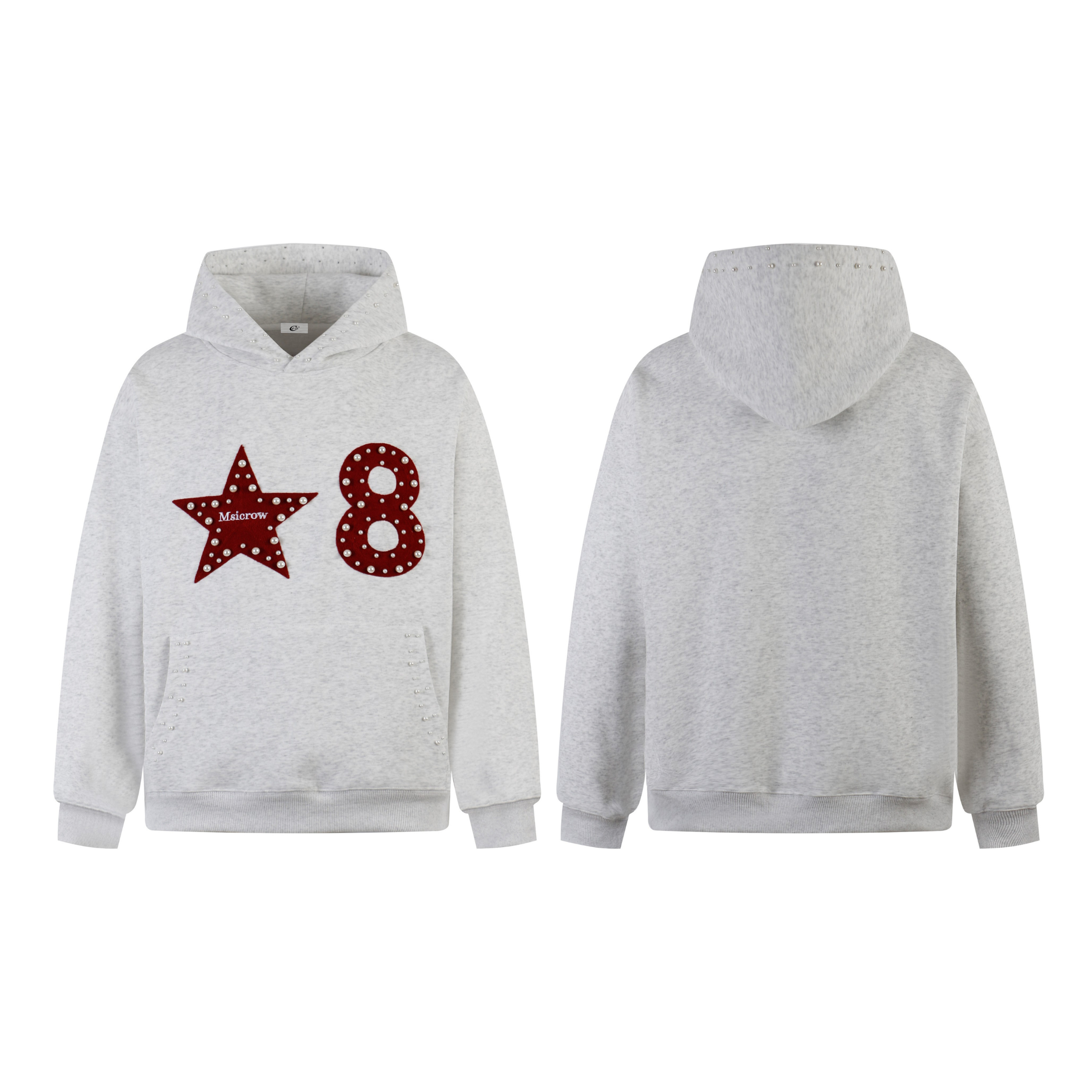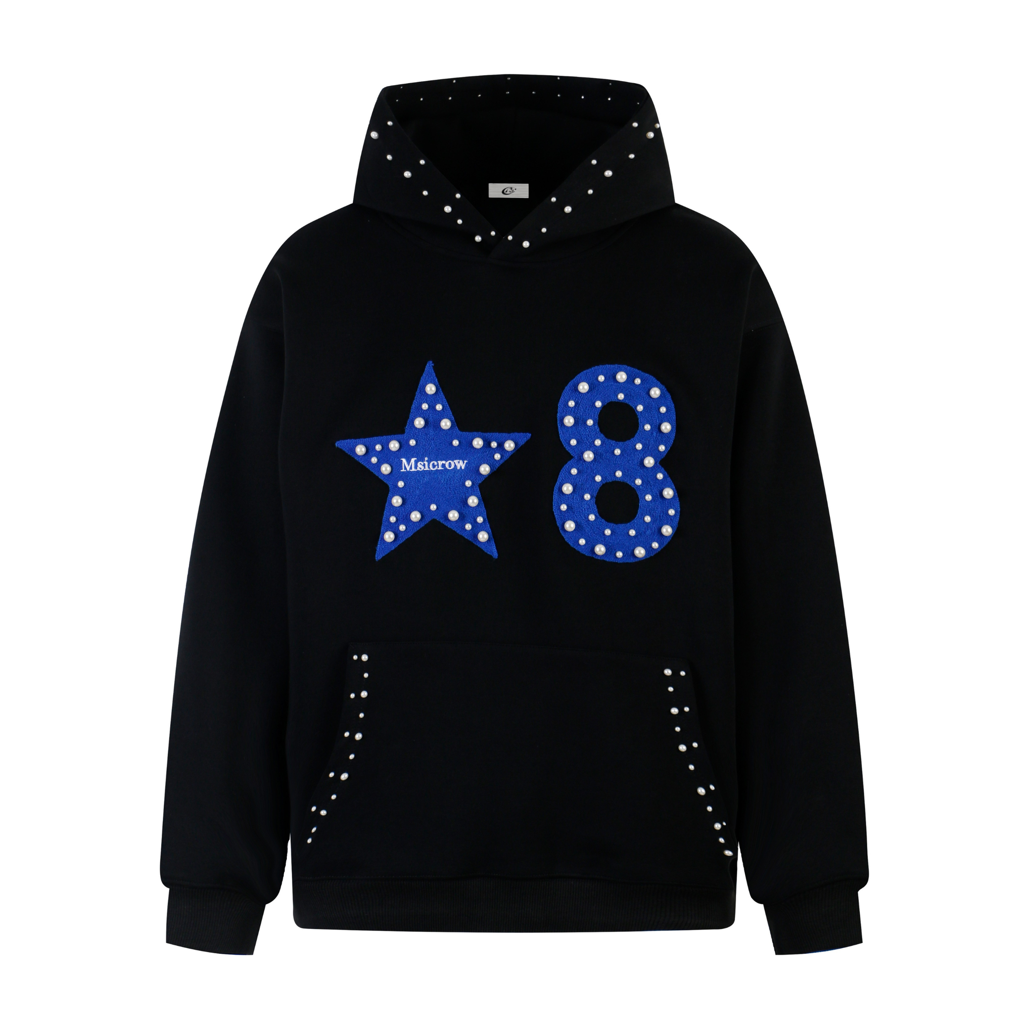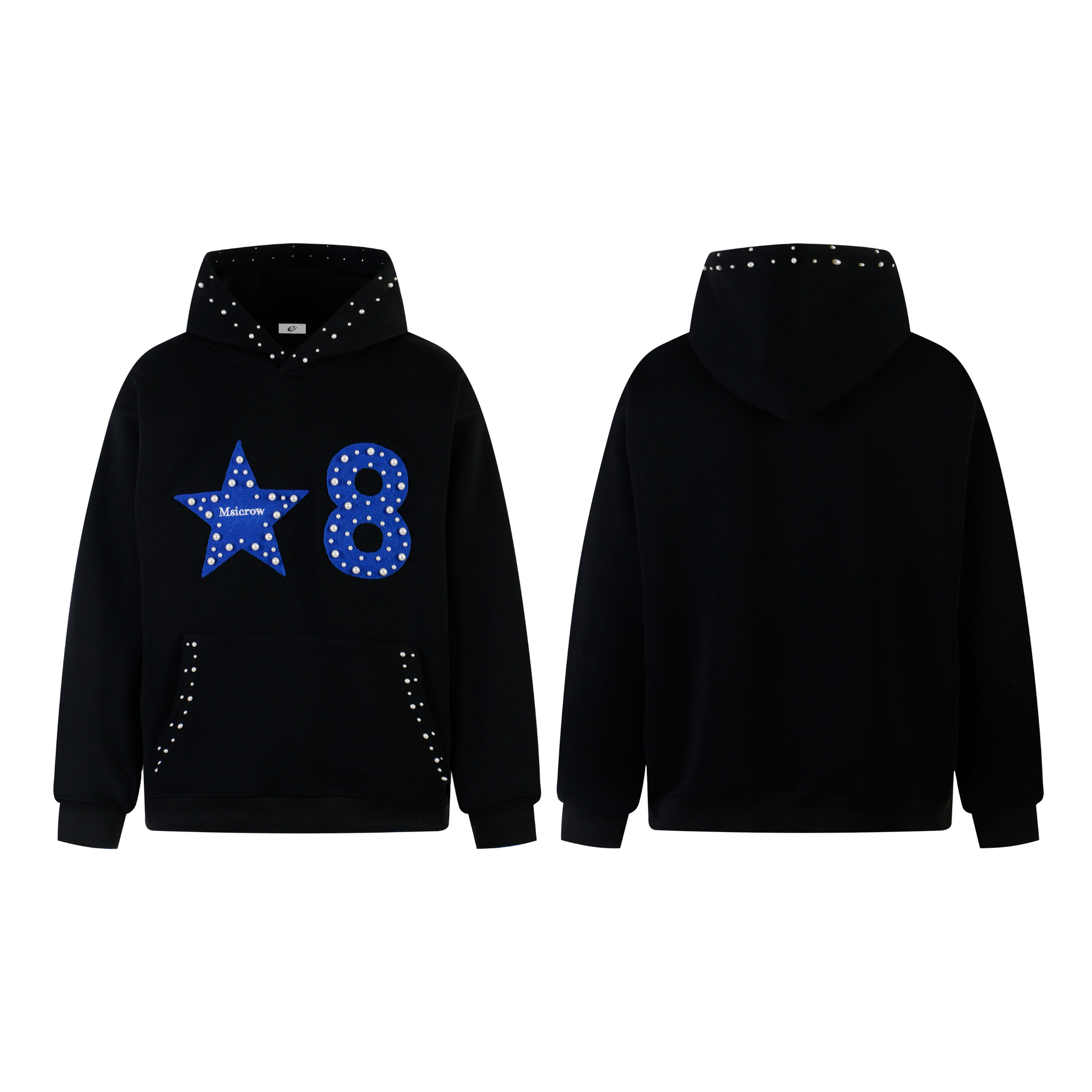 The Omirad Star & Number Hoodie brings playful retro vibes with oversized appliqué detailing. The bold star-and-eight motif on the chest gives a vintage sportswear edge, while metallic stud accents around the pockets and hood add a touch of street-style attitude. Crafted from a soft cotton-poly blend, this hoodie balances comfort, structure, and standout aesthetics.