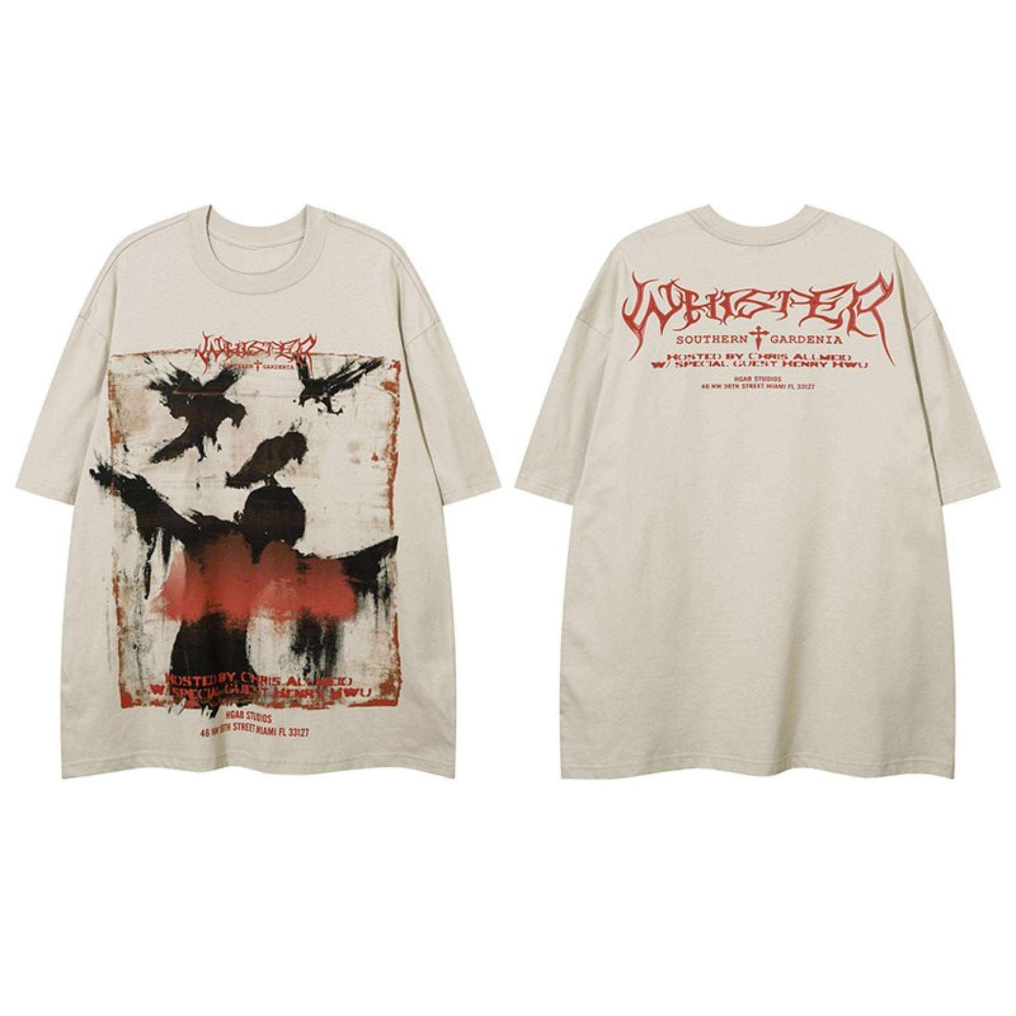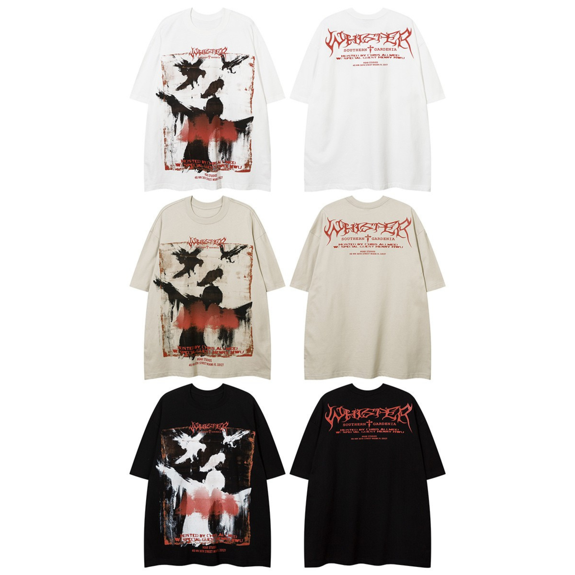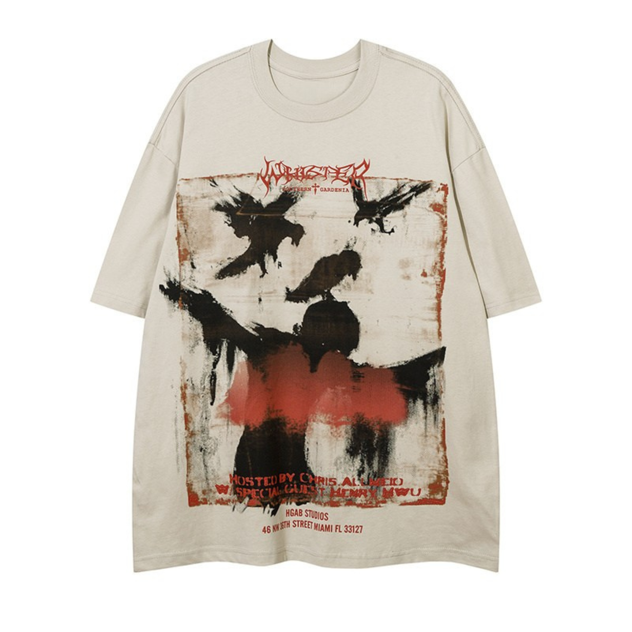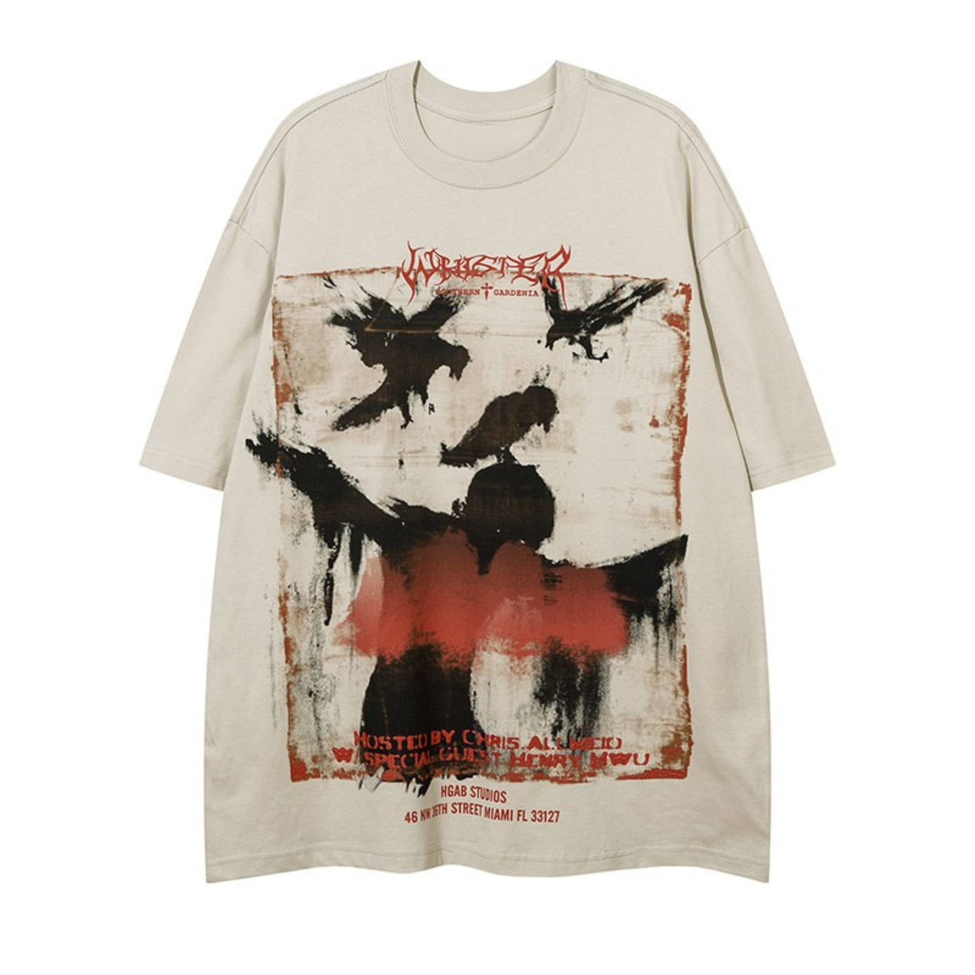 Clothing details: Oversized short-sleeve T-shirt design, front abstract raven graphic print, gothic-style back typography, washed vintage texture effect, crew neckline, dropped shoulders, breathable pure cotton fabric, relaxed unisex street fit.