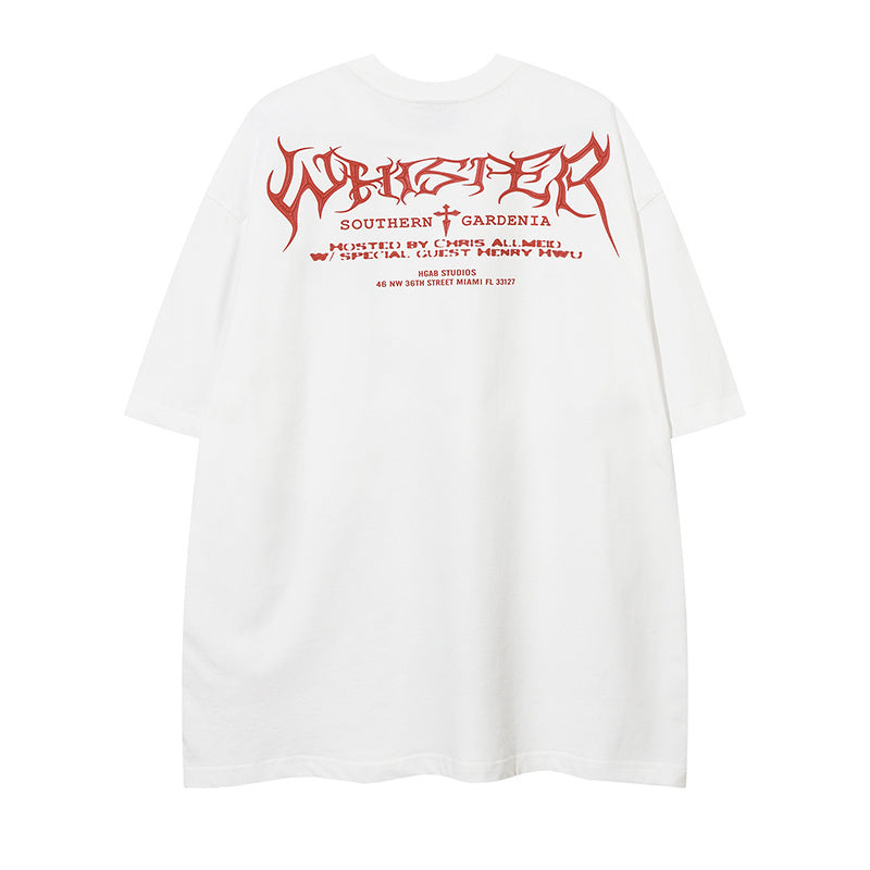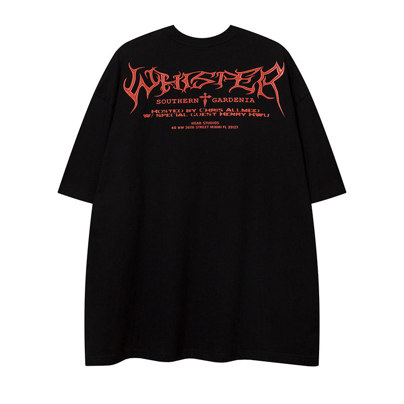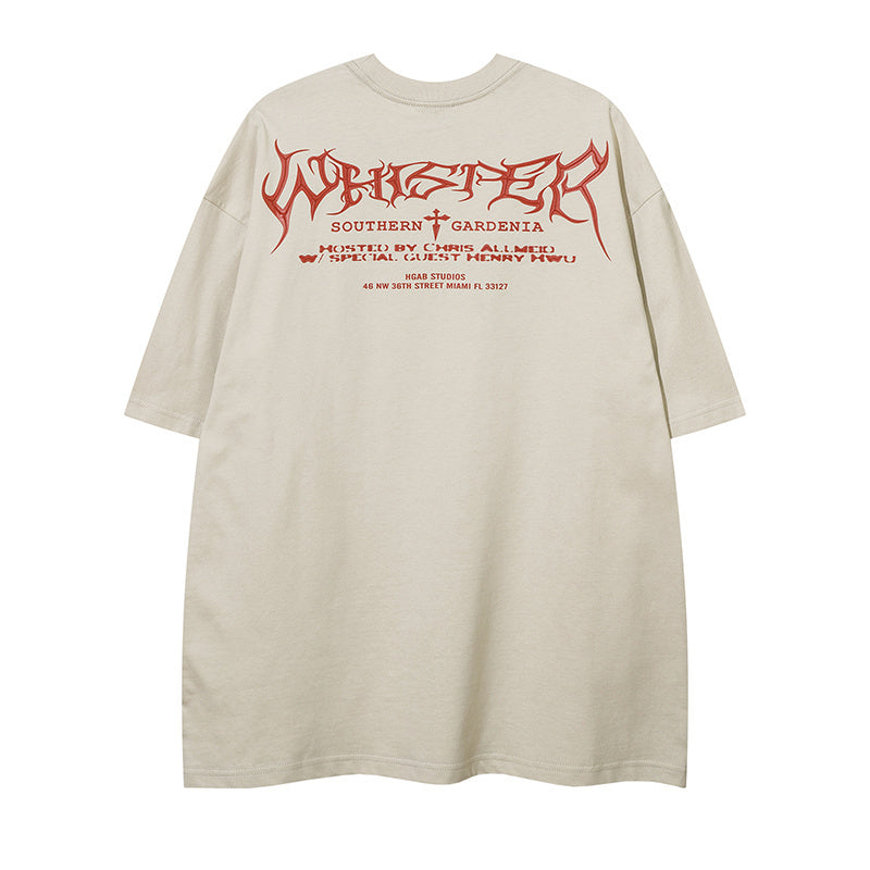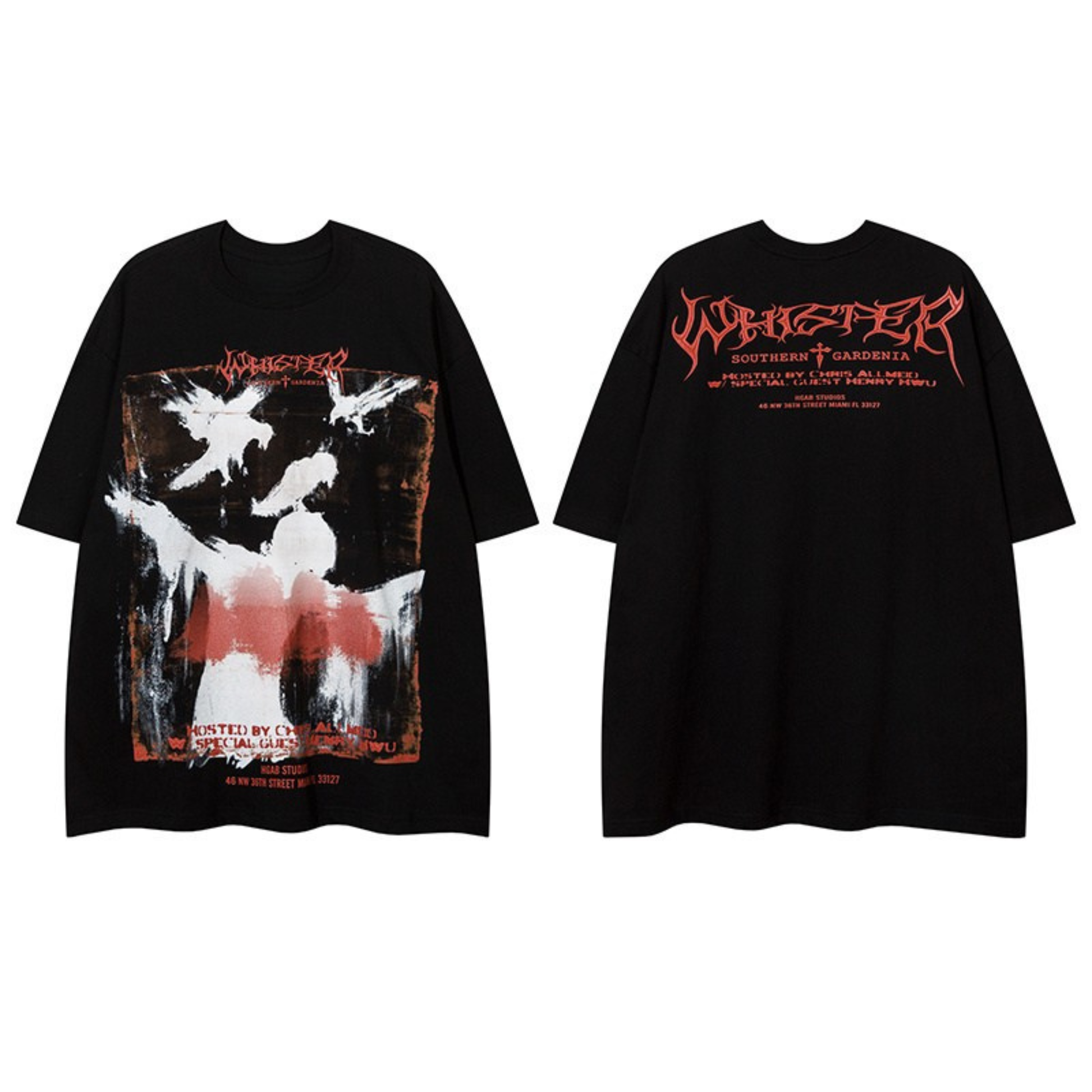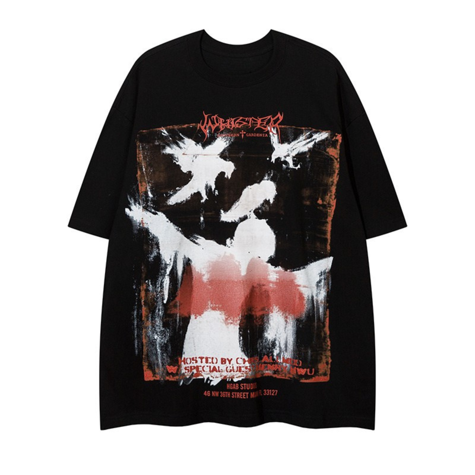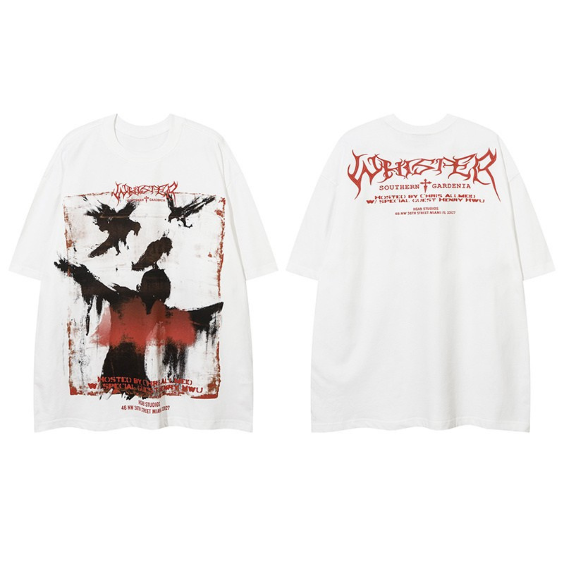 Clothing details: Oversized short-sleeve T-shirt design, front abstract raven graphic print, gothic-style back typography, washed vintage texture effect, crew neckline, dropped shoulders, breathable pure cotton fabric, relaxed unisex street fit.