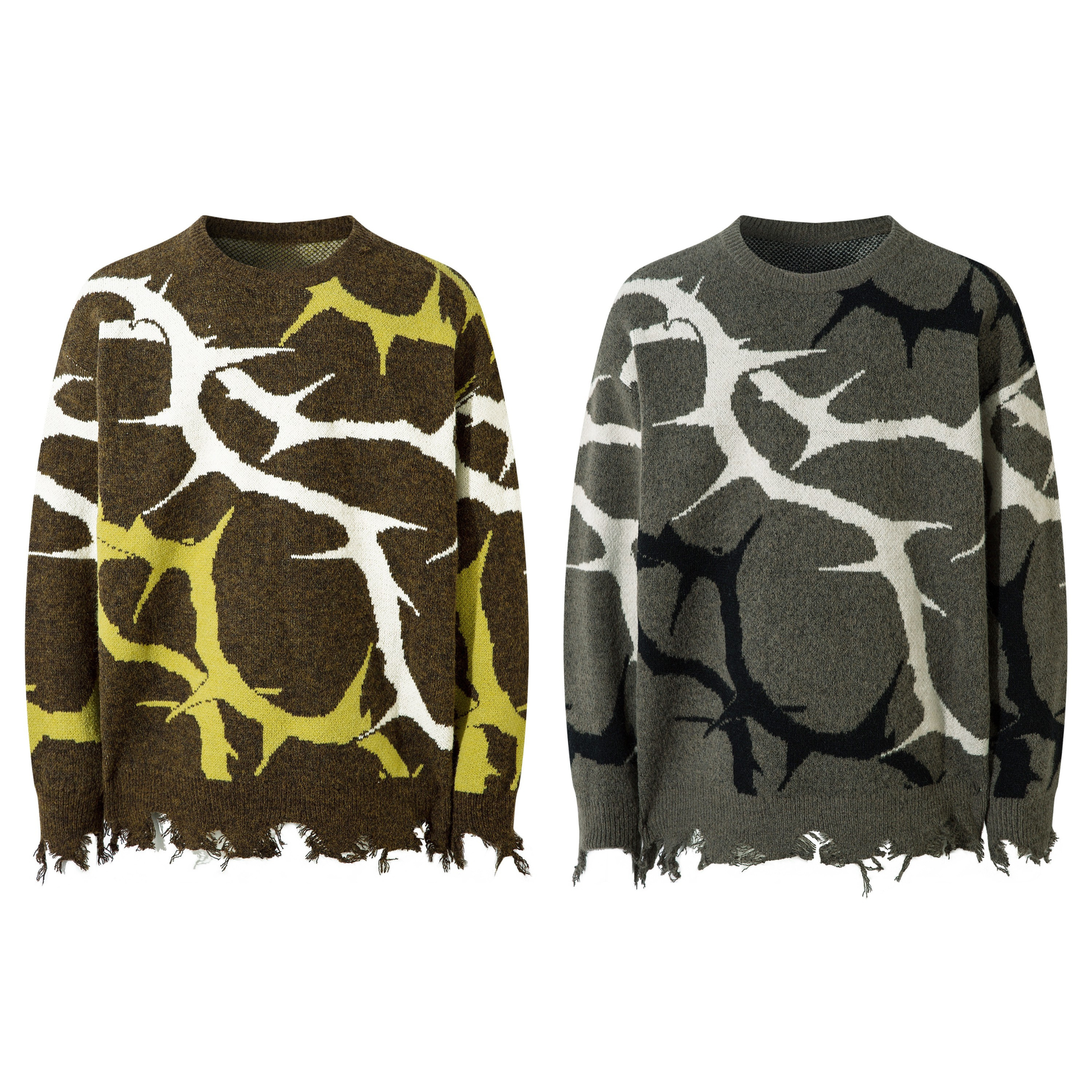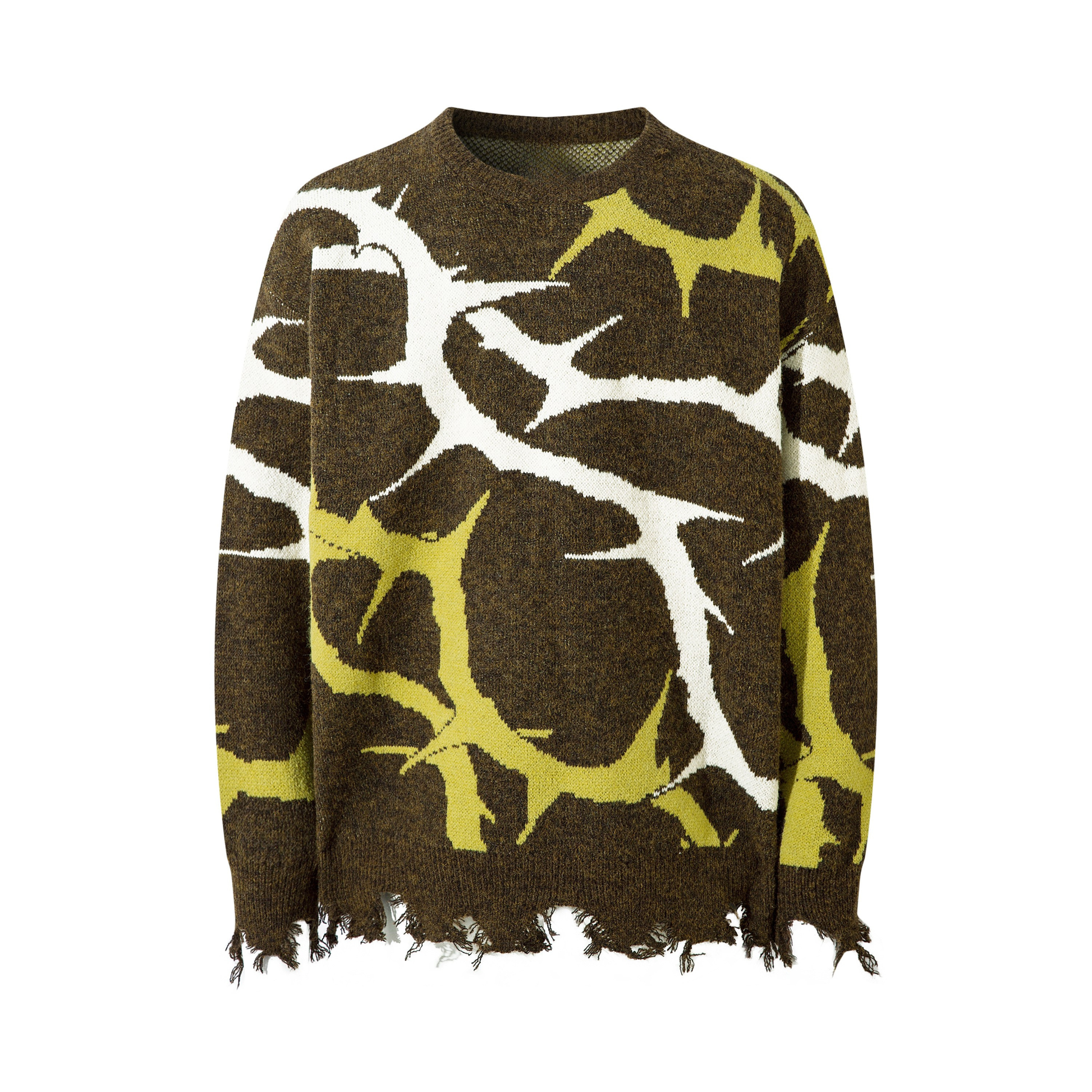 Clothing details: Abstract camo knit pattern, distressed frayed hem, classic crew neck, long sleeves, relaxed oversized fit, soft heavyweight knit feel.