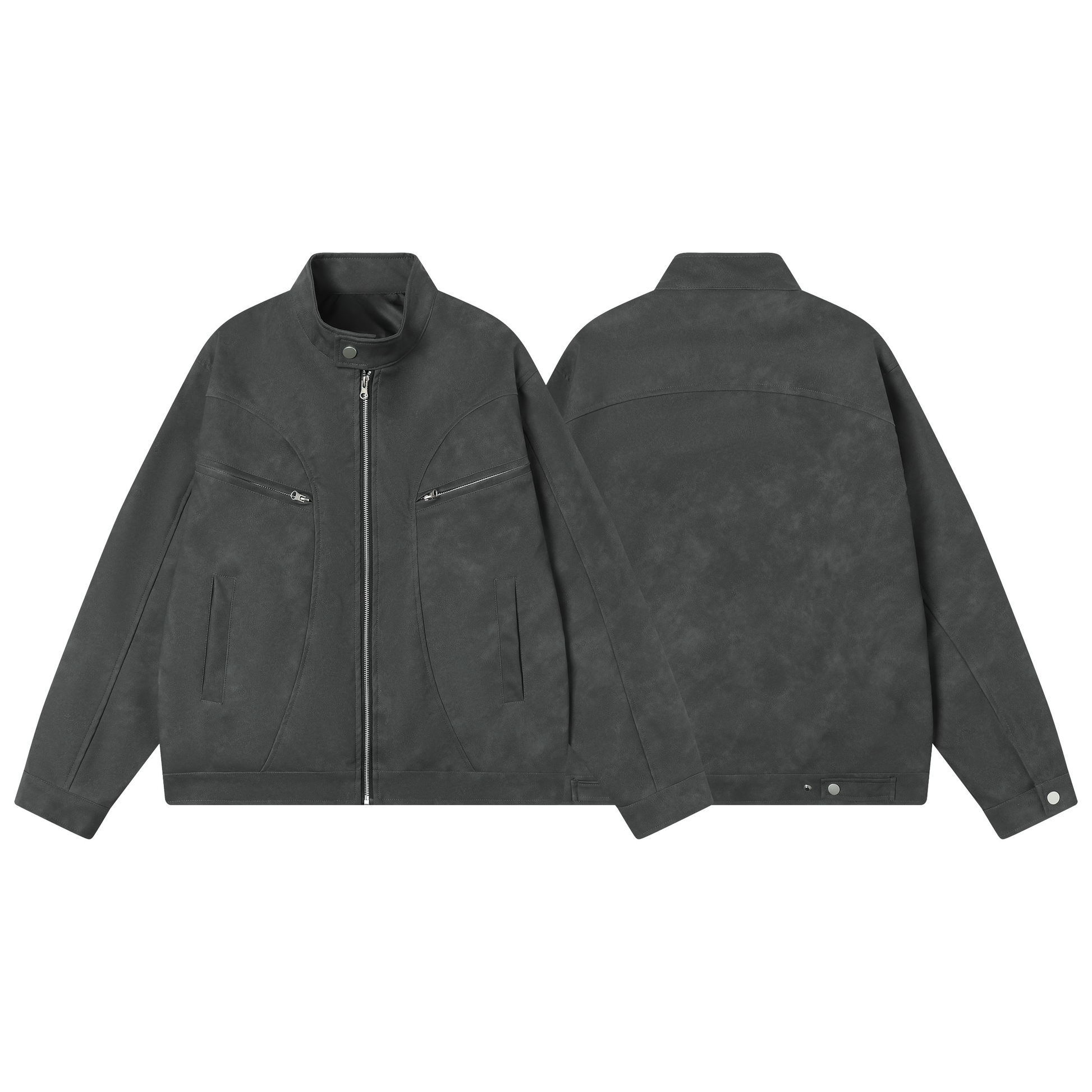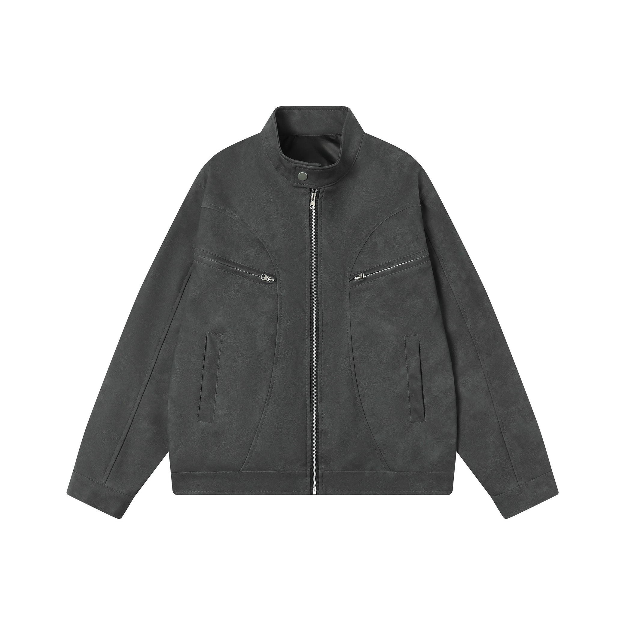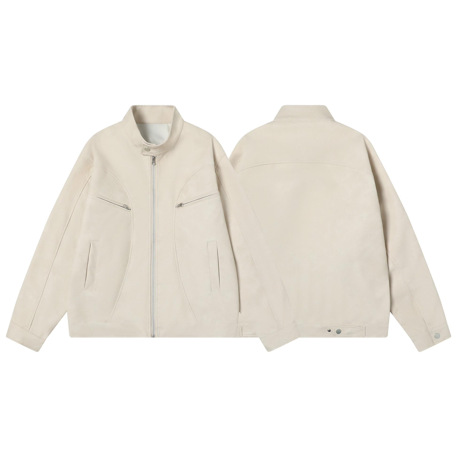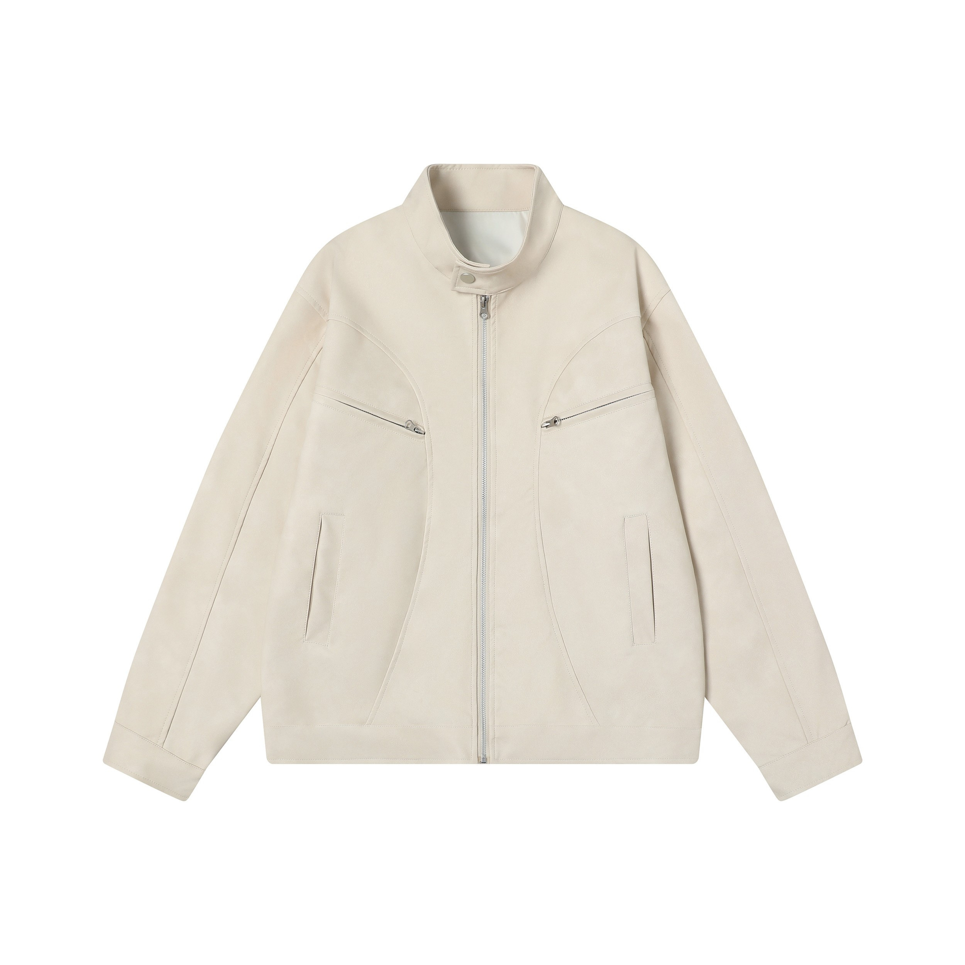 Clothing details: Stand collar with snap button, full zip front, chest zip pockets, side pockets, panel seam construction, relaxed fit.