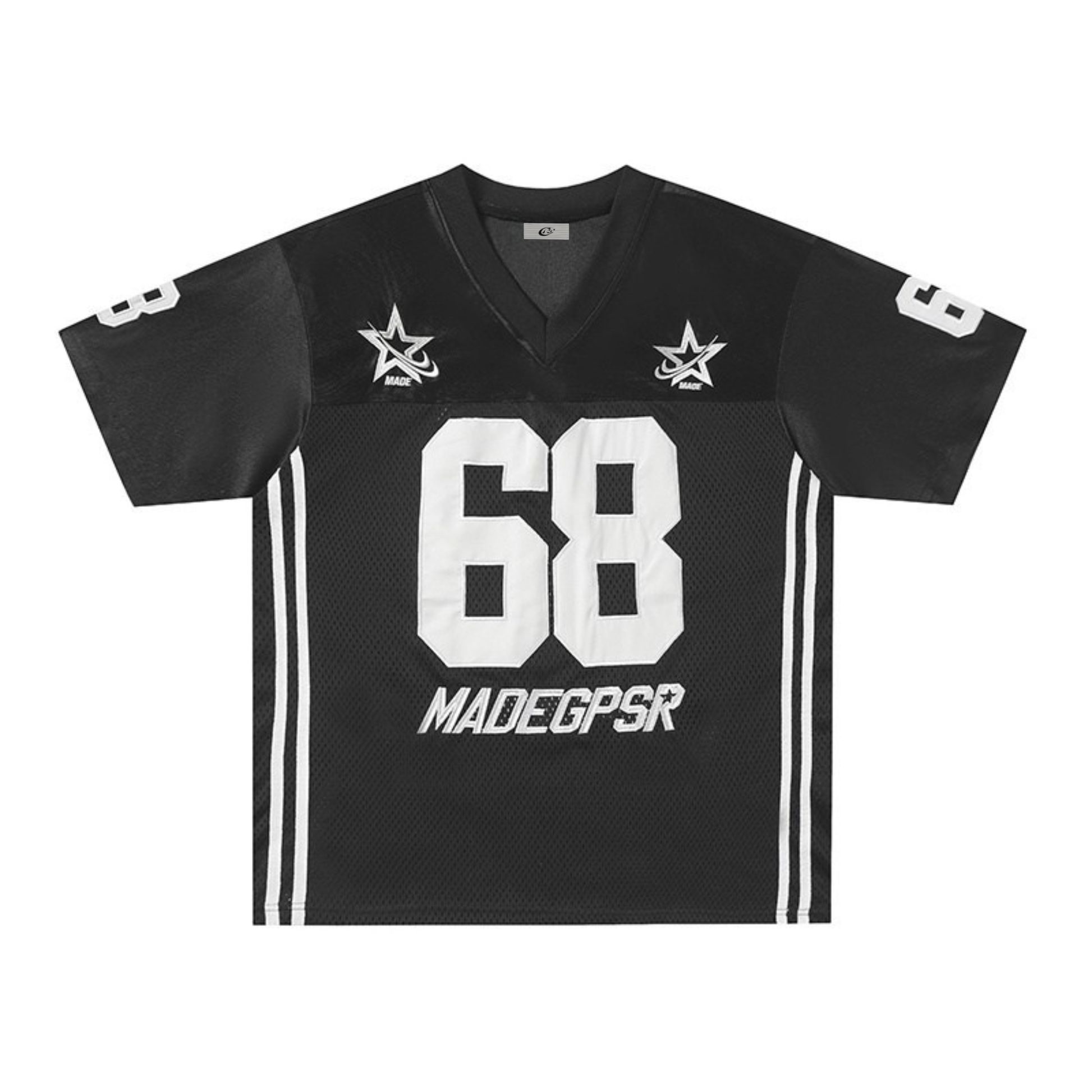 Bold “68” varsity numbers dominate the front and back, paired with contrast side stripes and star patches on the shoulders for a dynamic, team-inspired look. Clean V-neck construction and structured paneling enhance the classic American football silhouette, while the MADEGPSR lettering adds a signature touch.