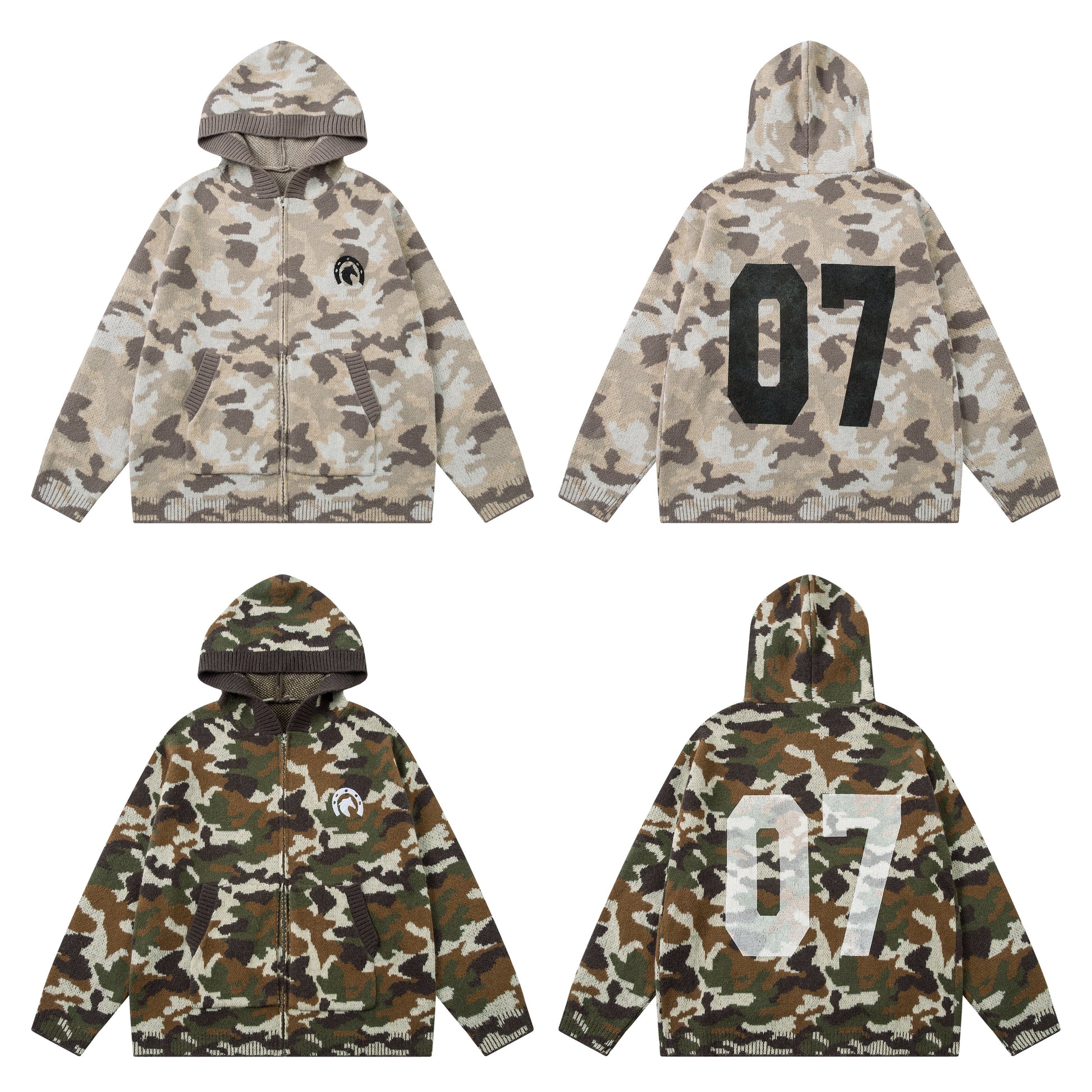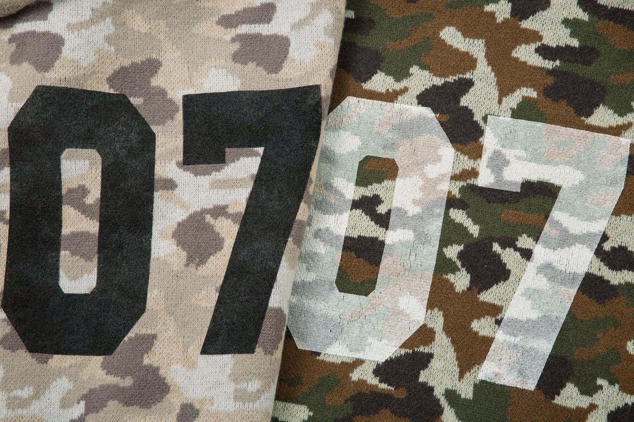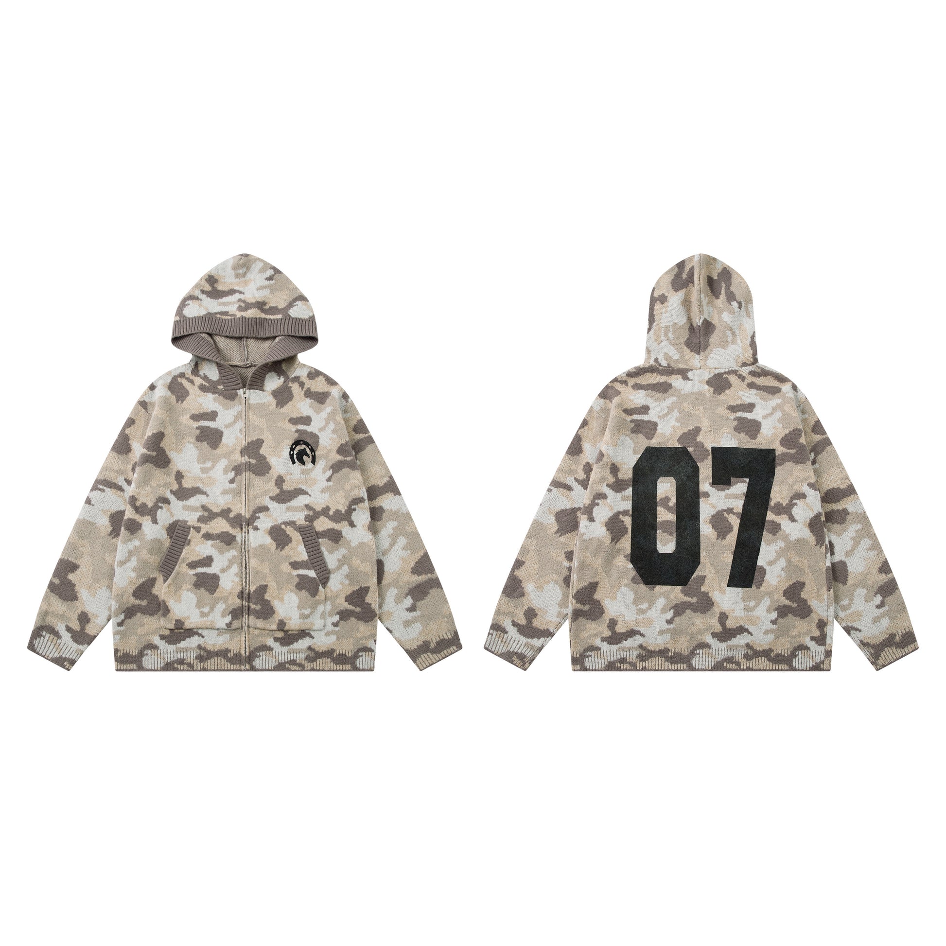 Clothing details: Knit camo pattern, large “07” back graphic, ribbed cuffs and hem, hooded design, relaxed fit.