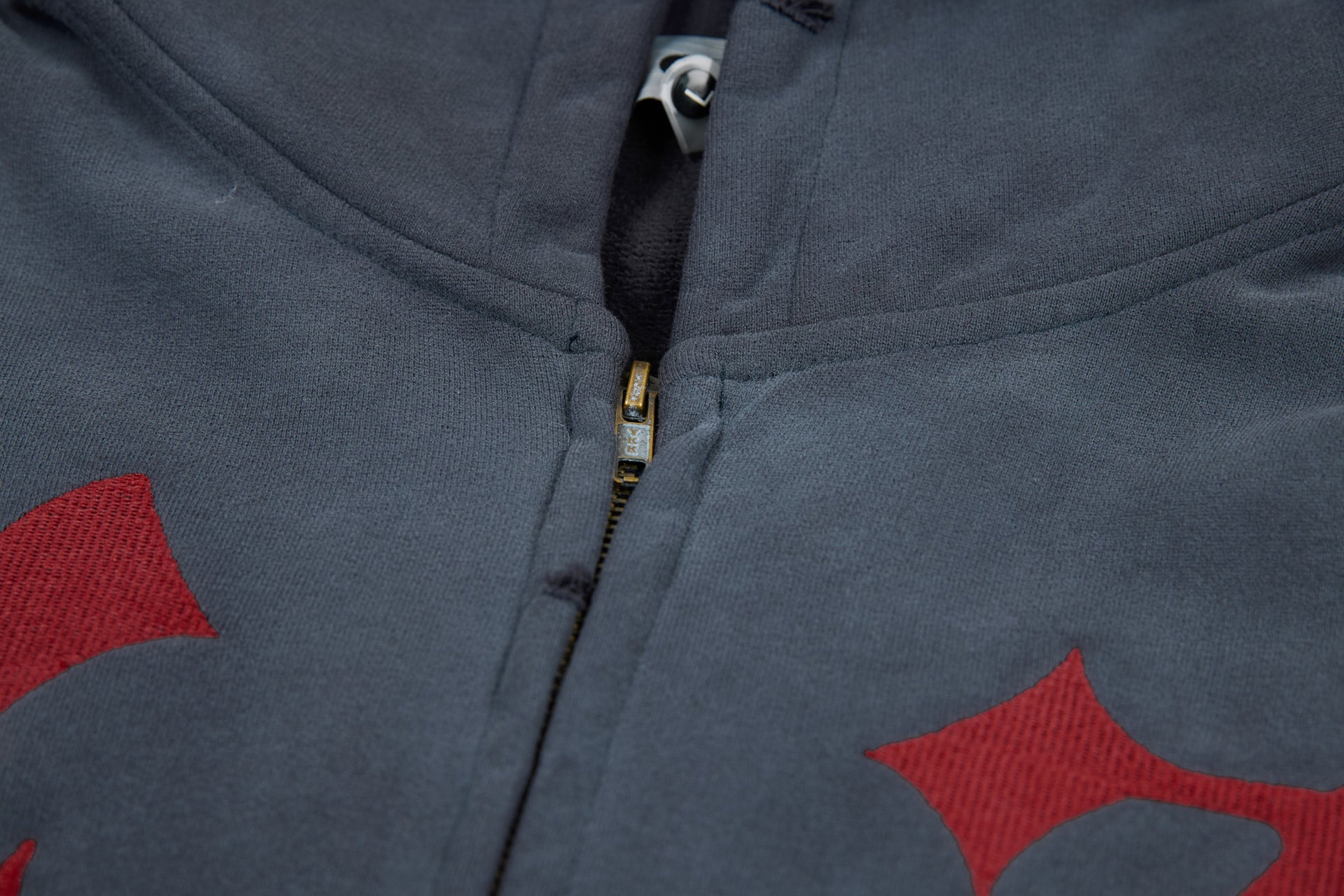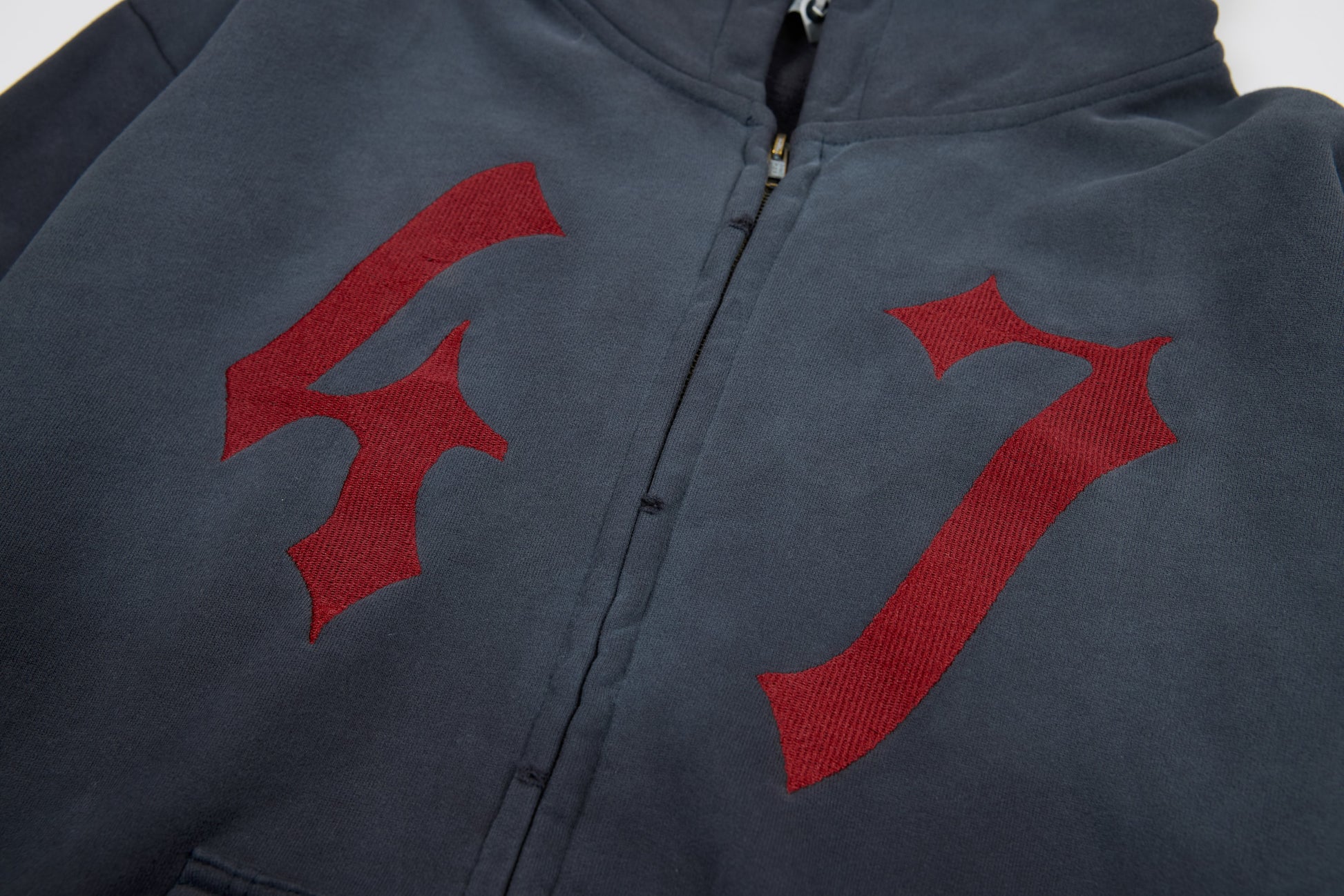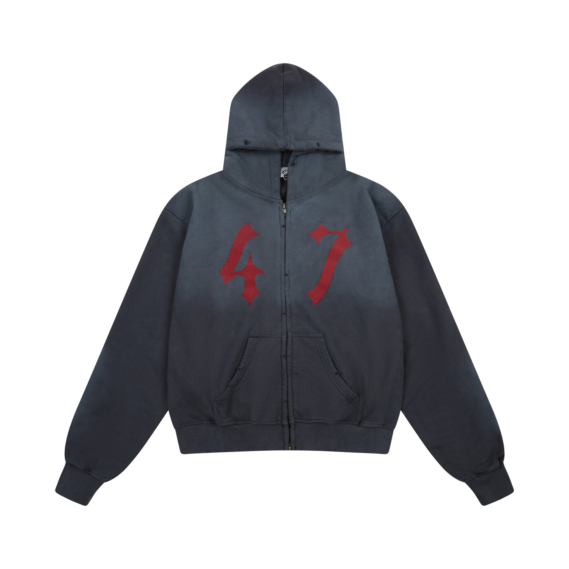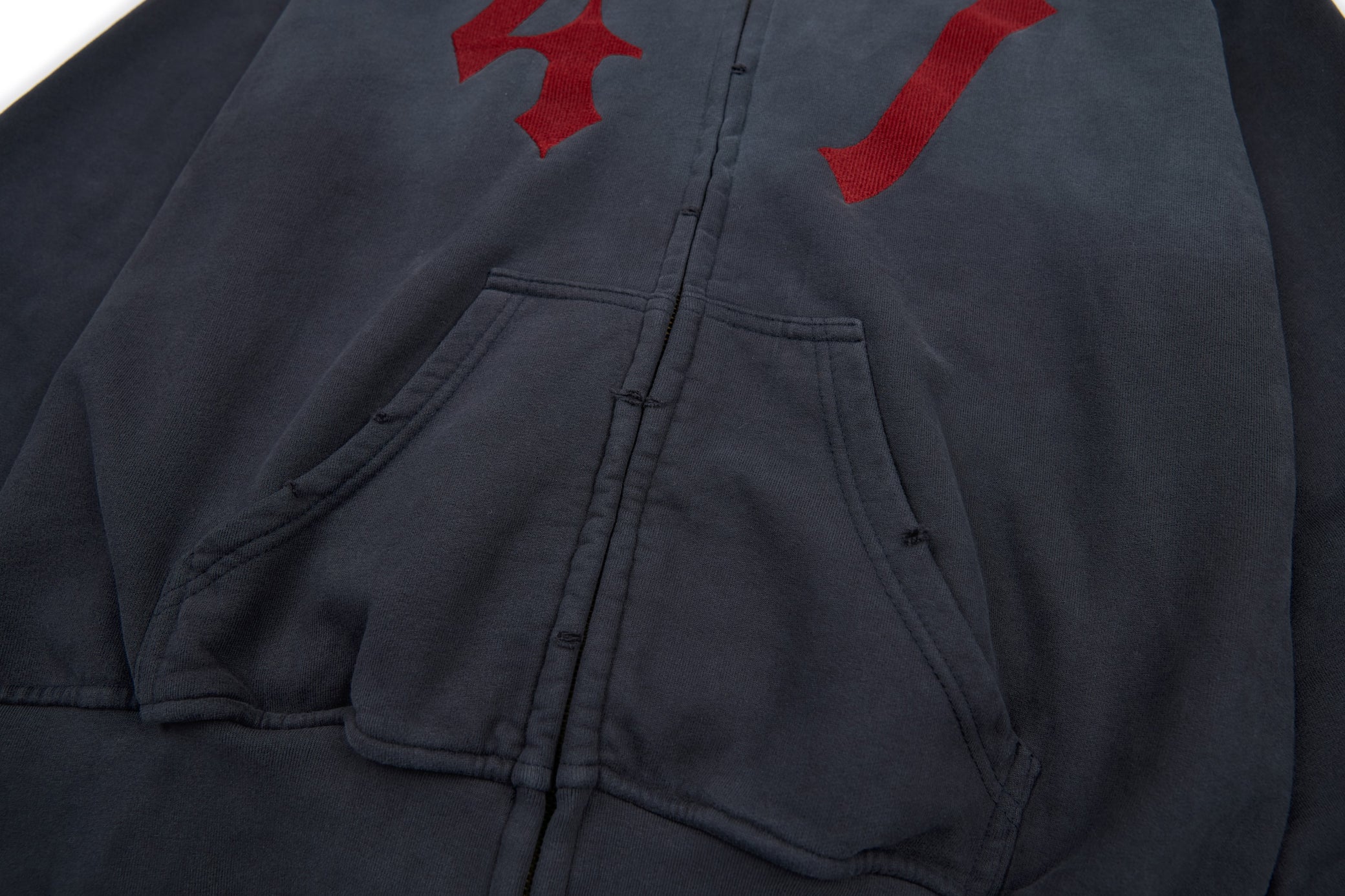 The washed charcoal tone adds a vintage effect, while the standout red “47” applique on the chest gives the piece a distinct identity. Finished with a full-length zipper, ribbed cuffs, and a spacious kangaroo pocket, it’s designed for everyday comfort with a strong streetwear edge.