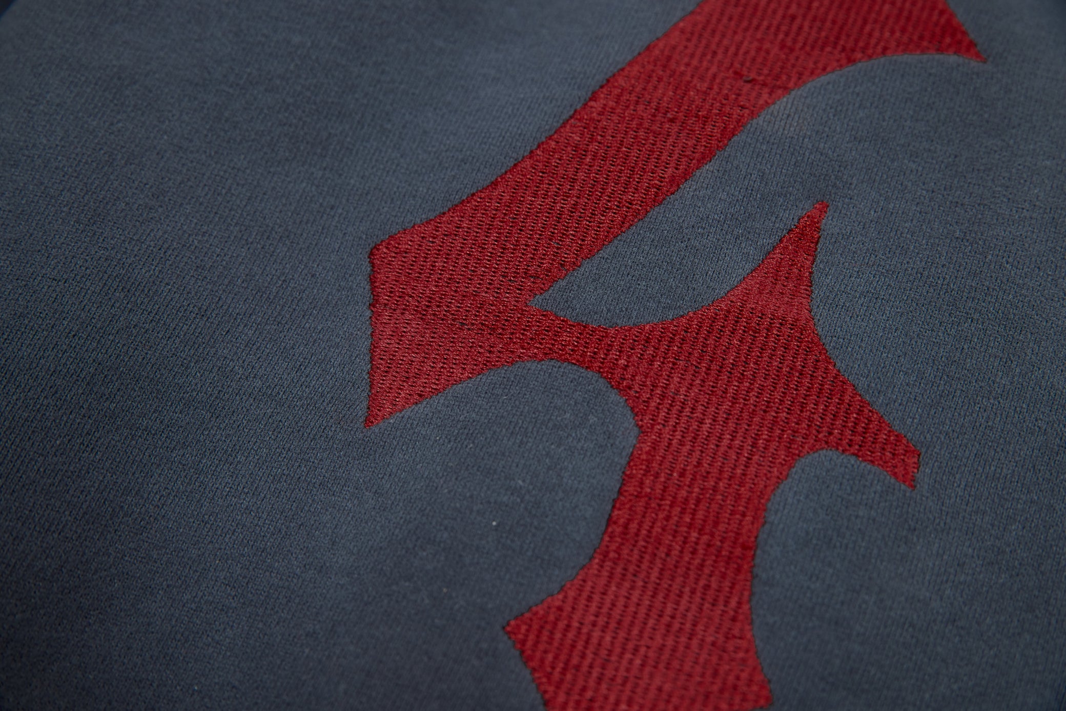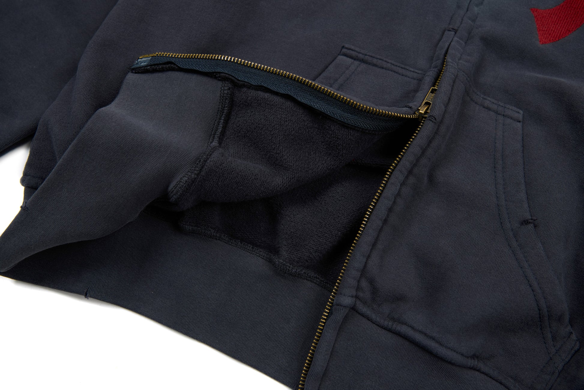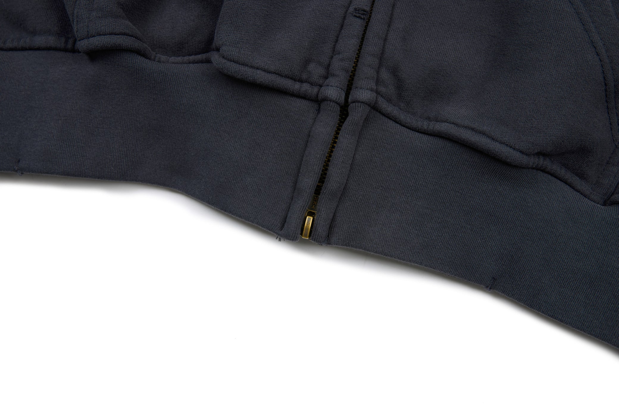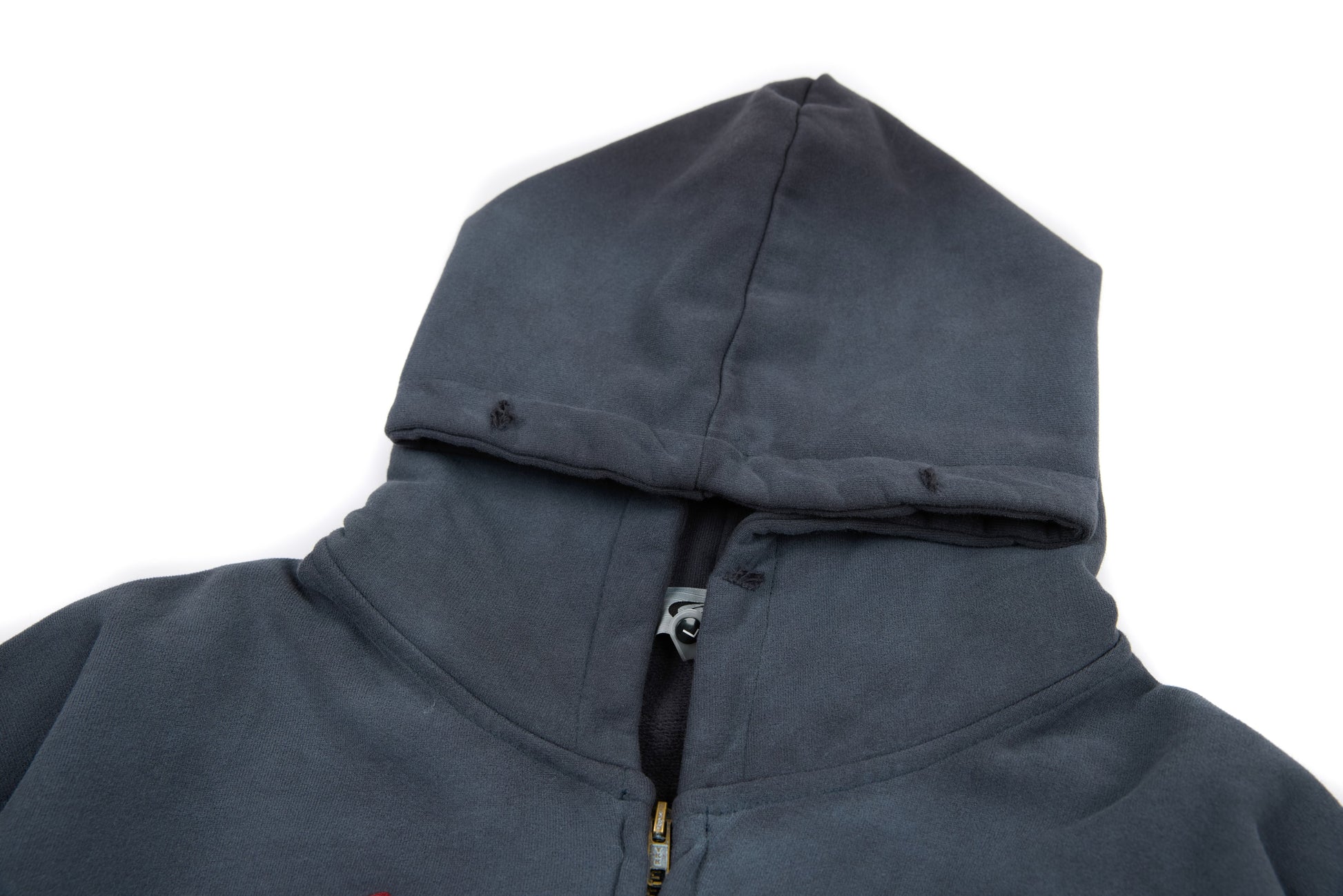 The washed charcoal tone adds a vintage effect, while the standout red “47” applique on the chest gives the piece a distinct identity. Finished with a full-length zipper, ribbed cuffs, and a spacious kangaroo pocket, it’s designed for everyday comfort with a strong streetwear edge.