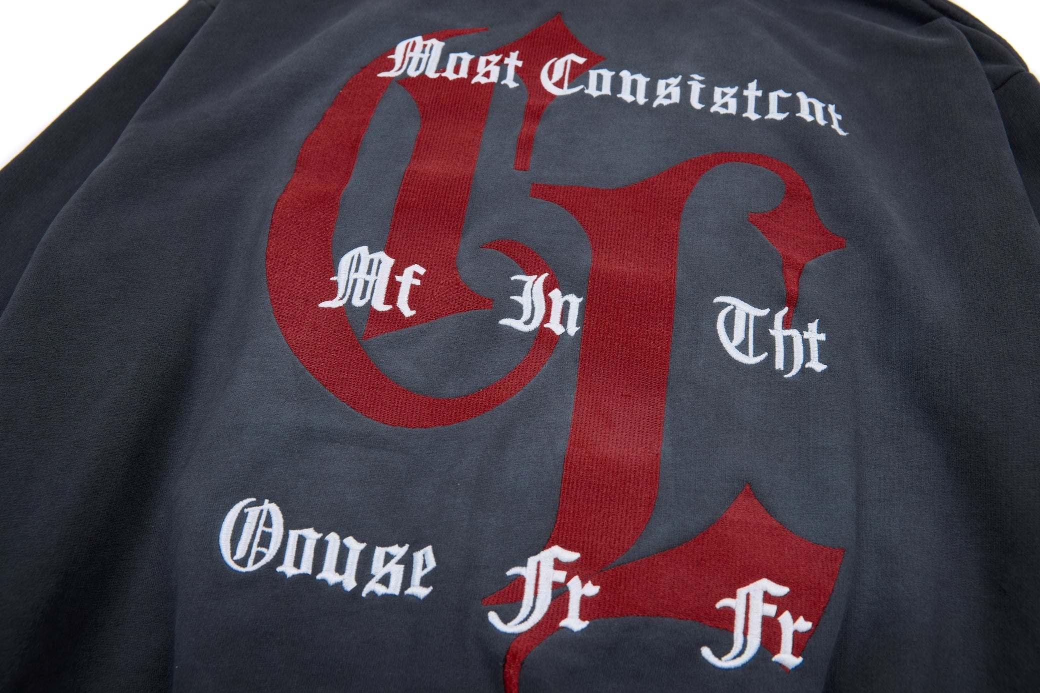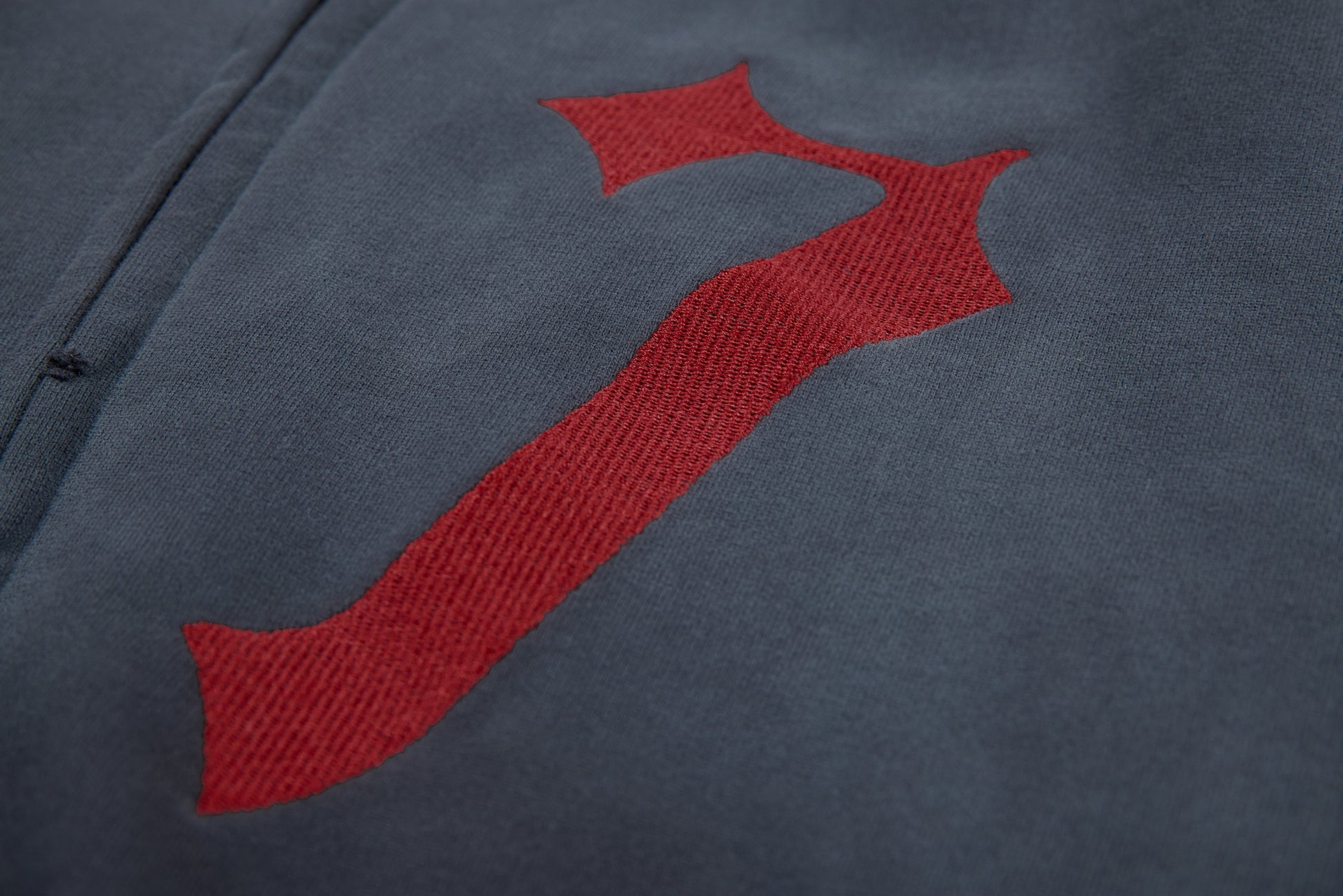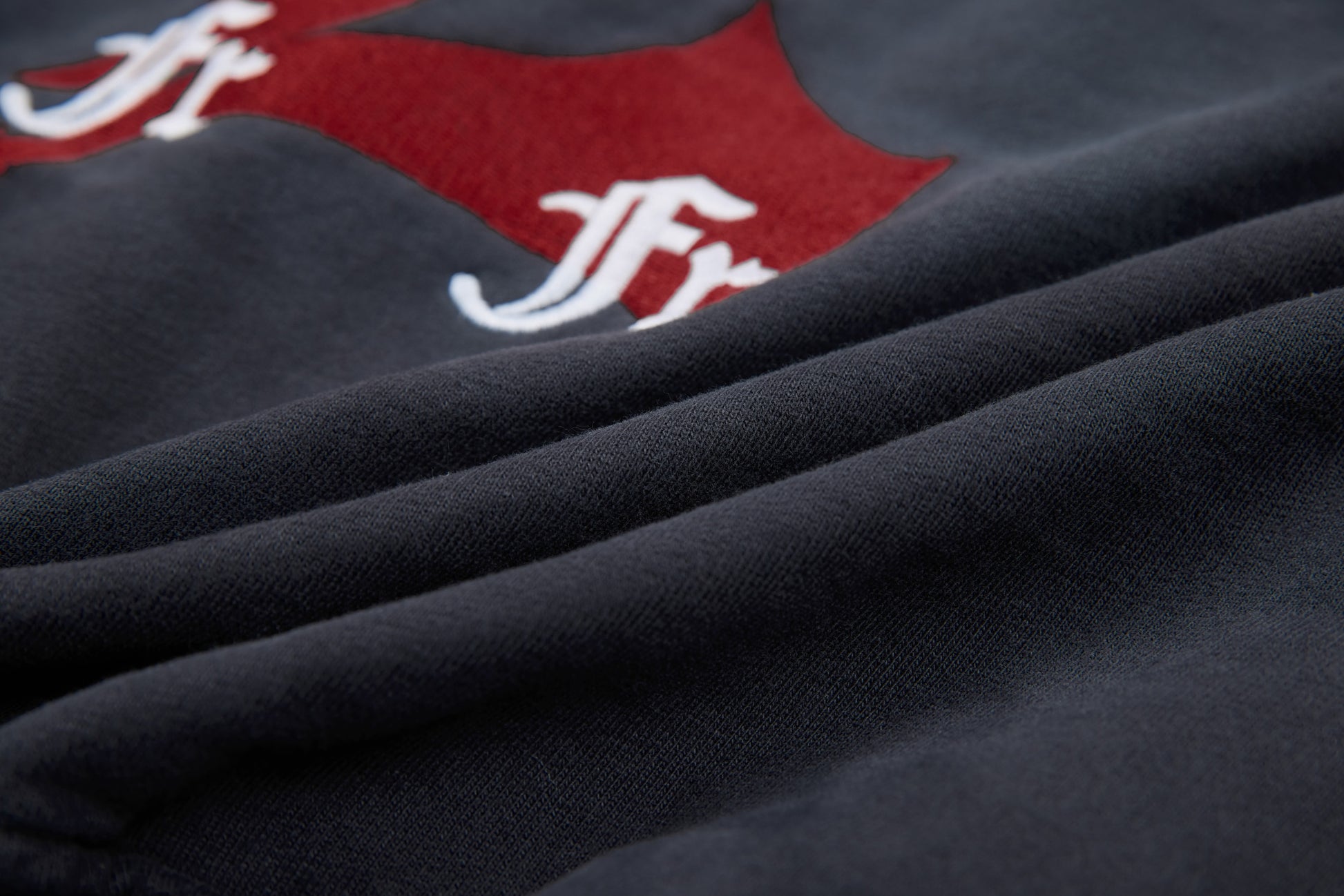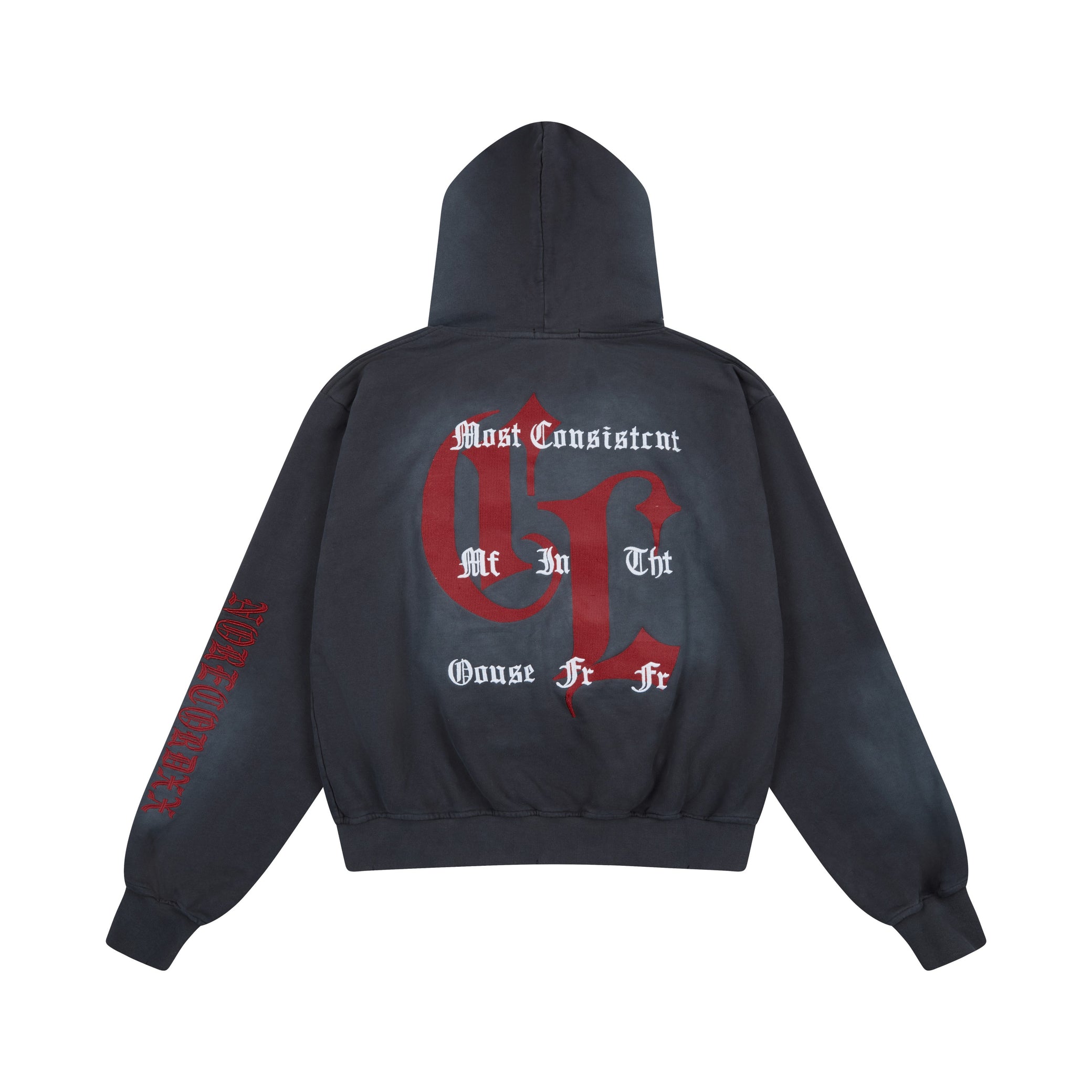 The washed charcoal tone adds a vintage effect, while the standout red “47” applique on the chest gives the piece a distinct identity. Finished with a full-length zipper, ribbed cuffs, and a spacious kangaroo pocket, it’s designed for everyday comfort with a strong streetwear edge.