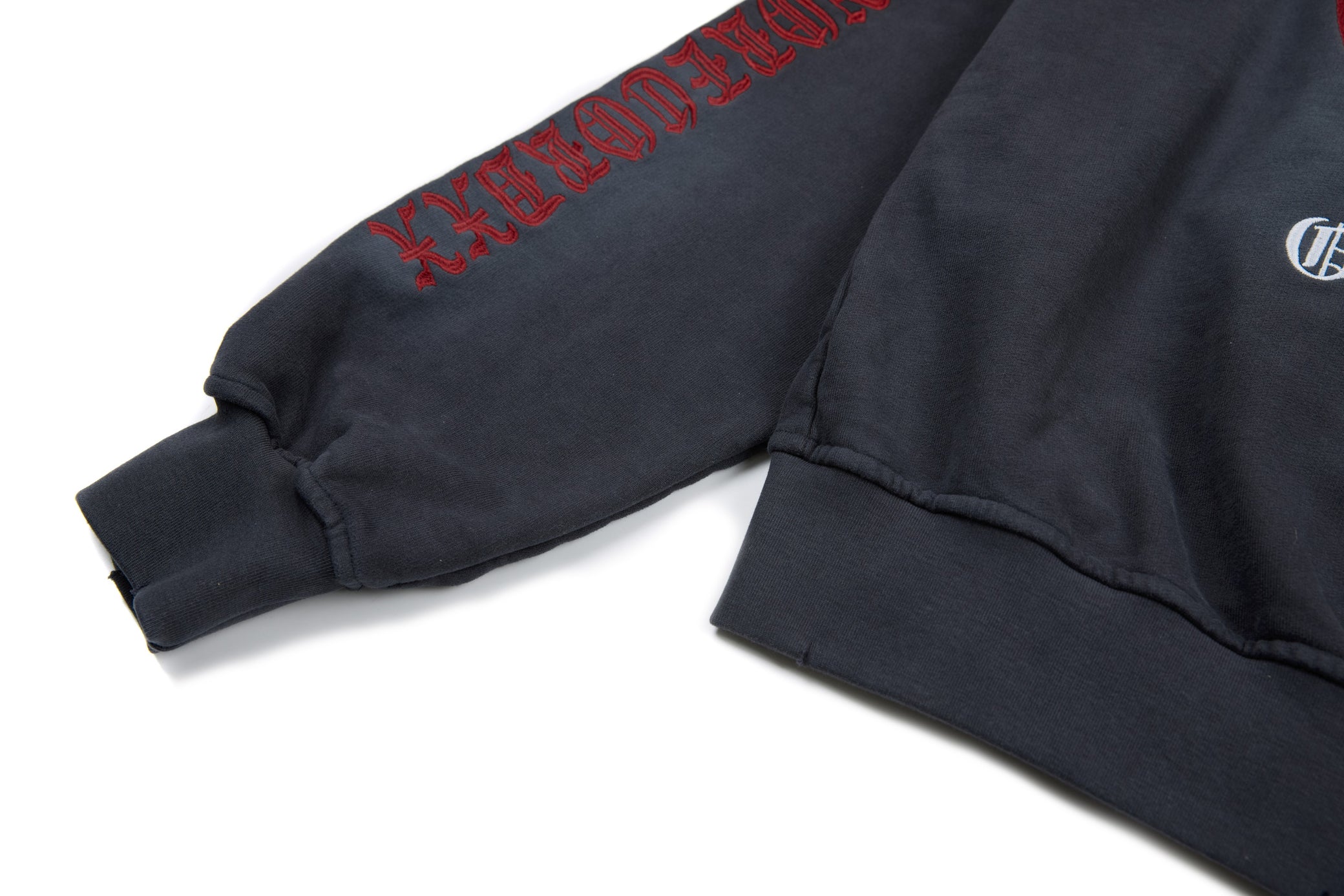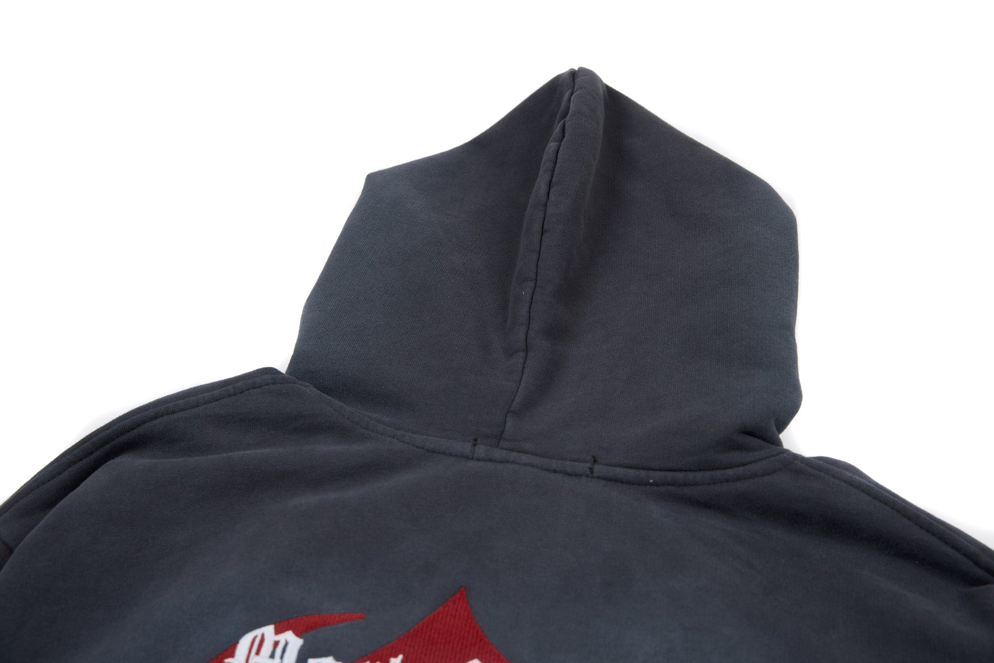 Clothing Details: Washed effect finish, red applique front graphic, full zip closure, kangaroo pocket, ribbed cuffs and hem
