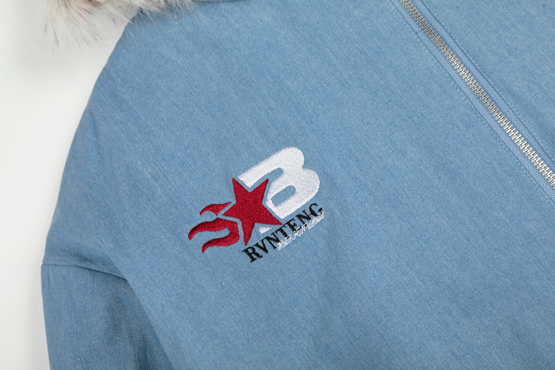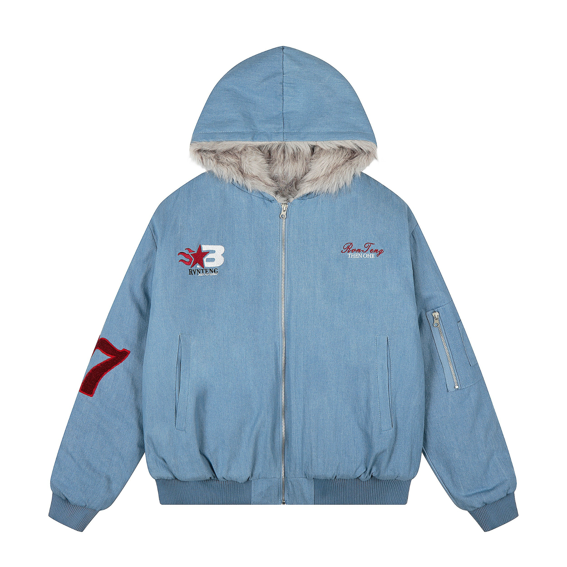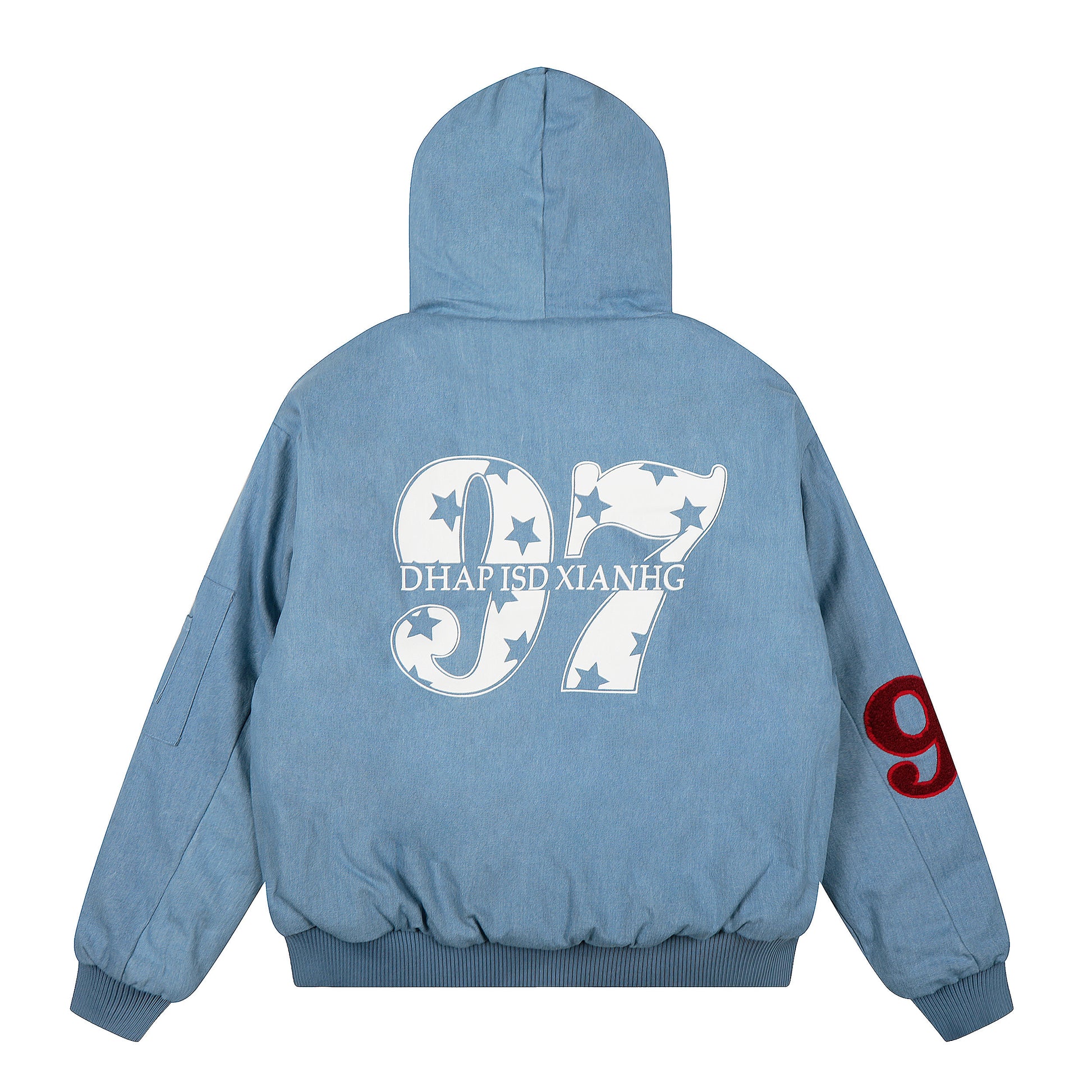 The Omirad “97 Denim Varsity Hooded Jacket” merges retro varsity aesthetics with streetwear attitude. Crafted from 100% cotton, this jacket features a cozy faux fur lining for superior warmth and comfort. The light-wash denim body delivers a vintage feel, while the embroidered “97” graphic and bold sleeve numbers channel classic collegiate energy. Finished with ribbed cuffs, a zip-up front, and an oversized hood, it’s designed for both function and everyday statement style.