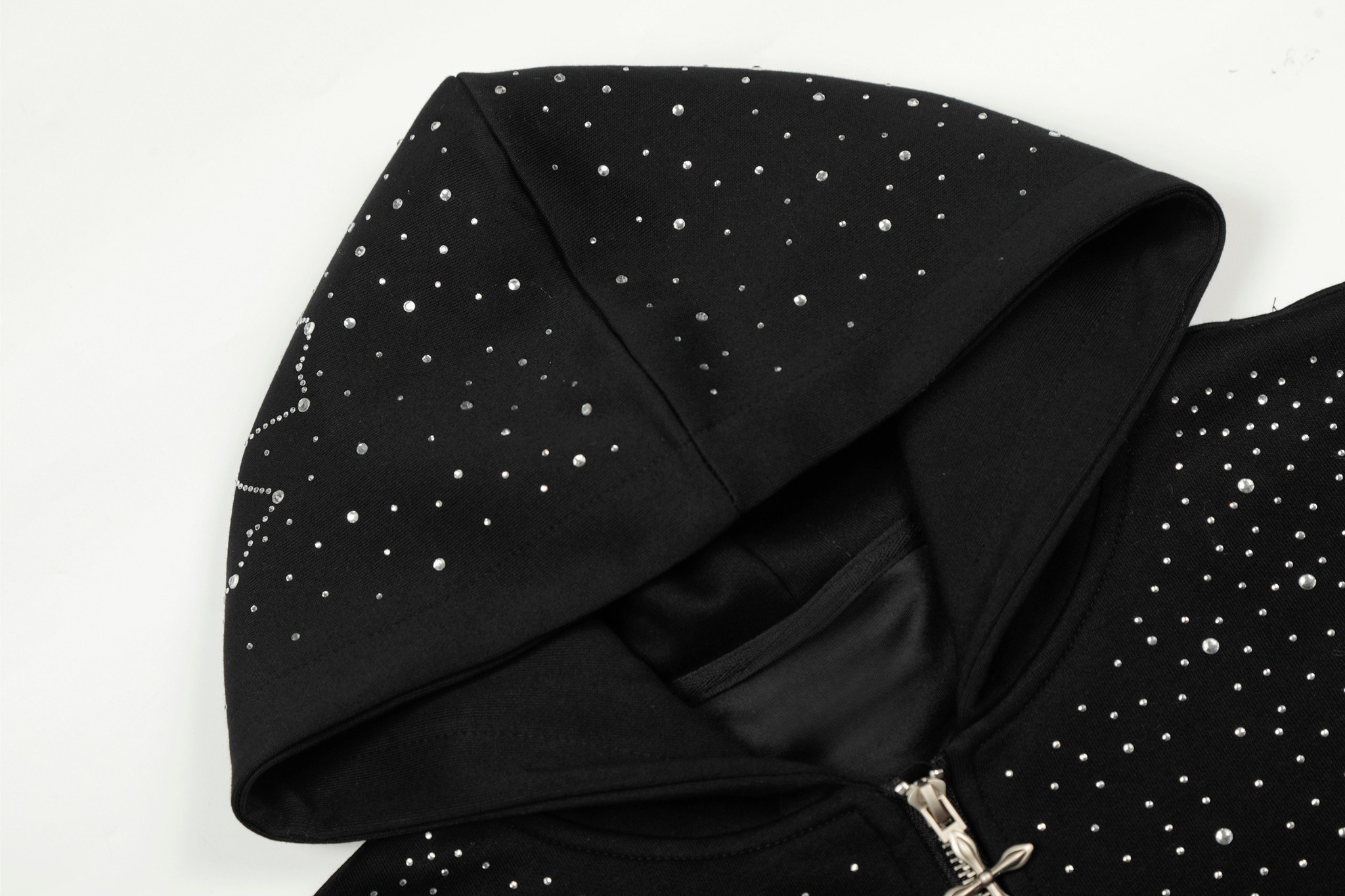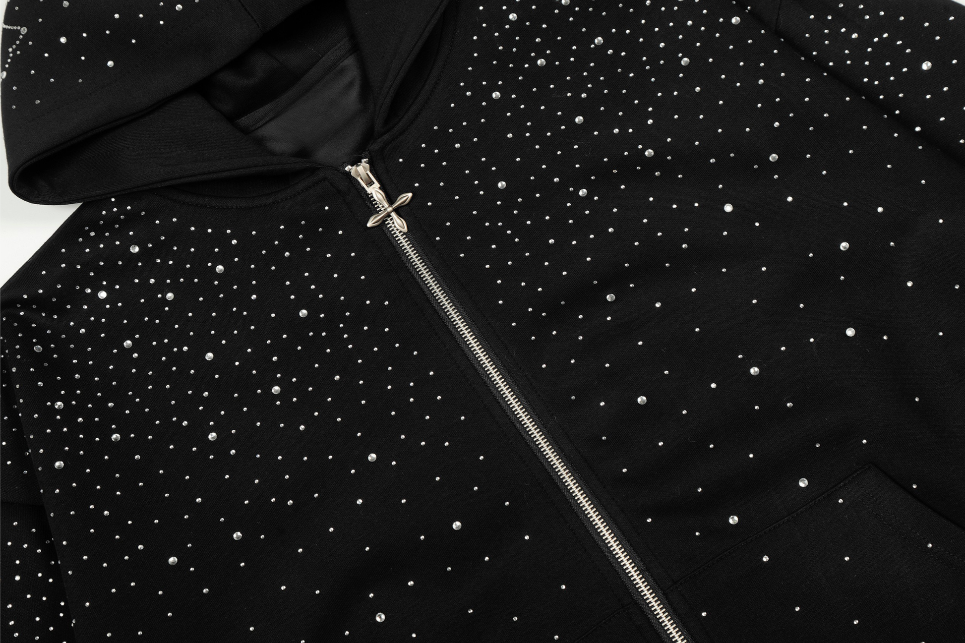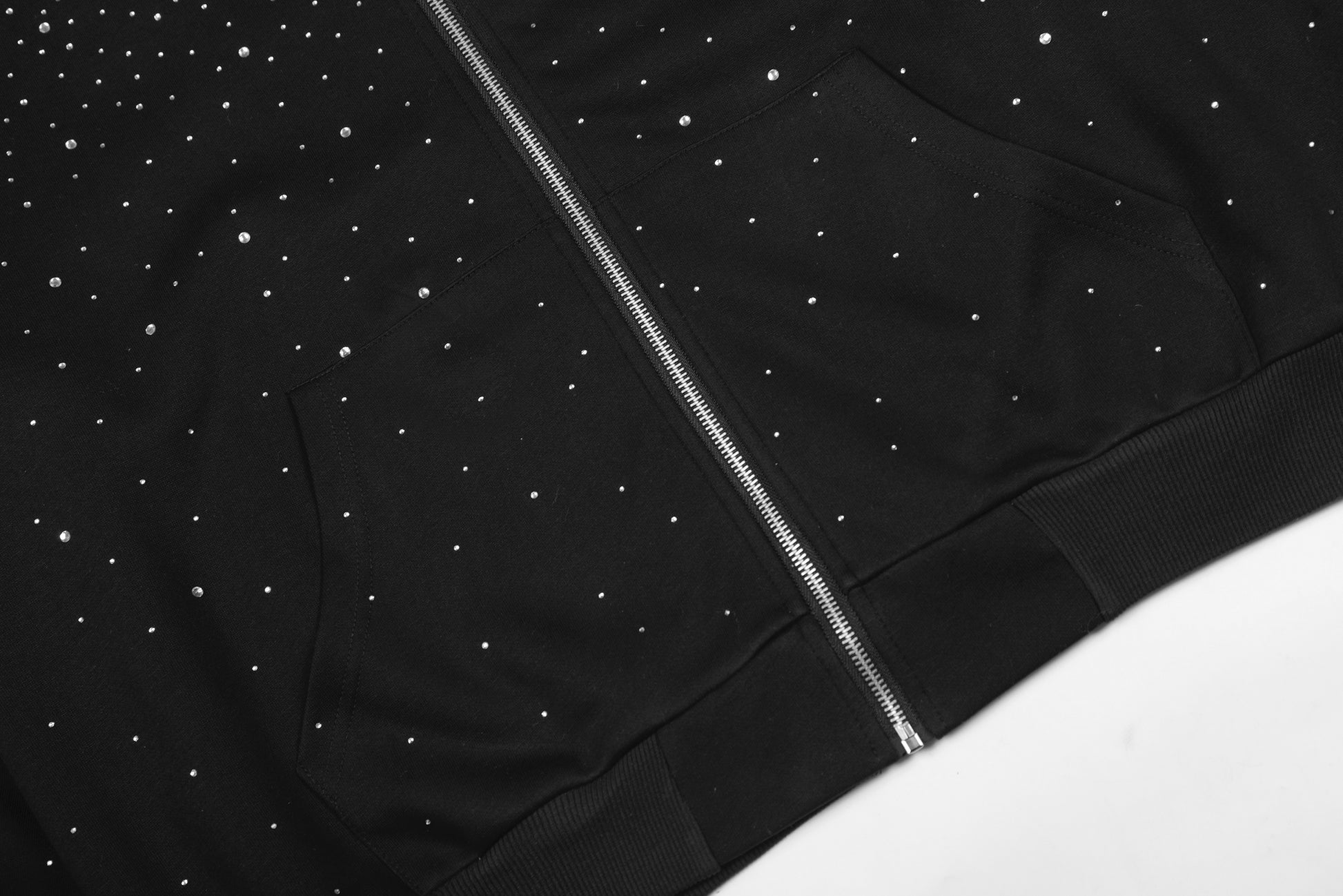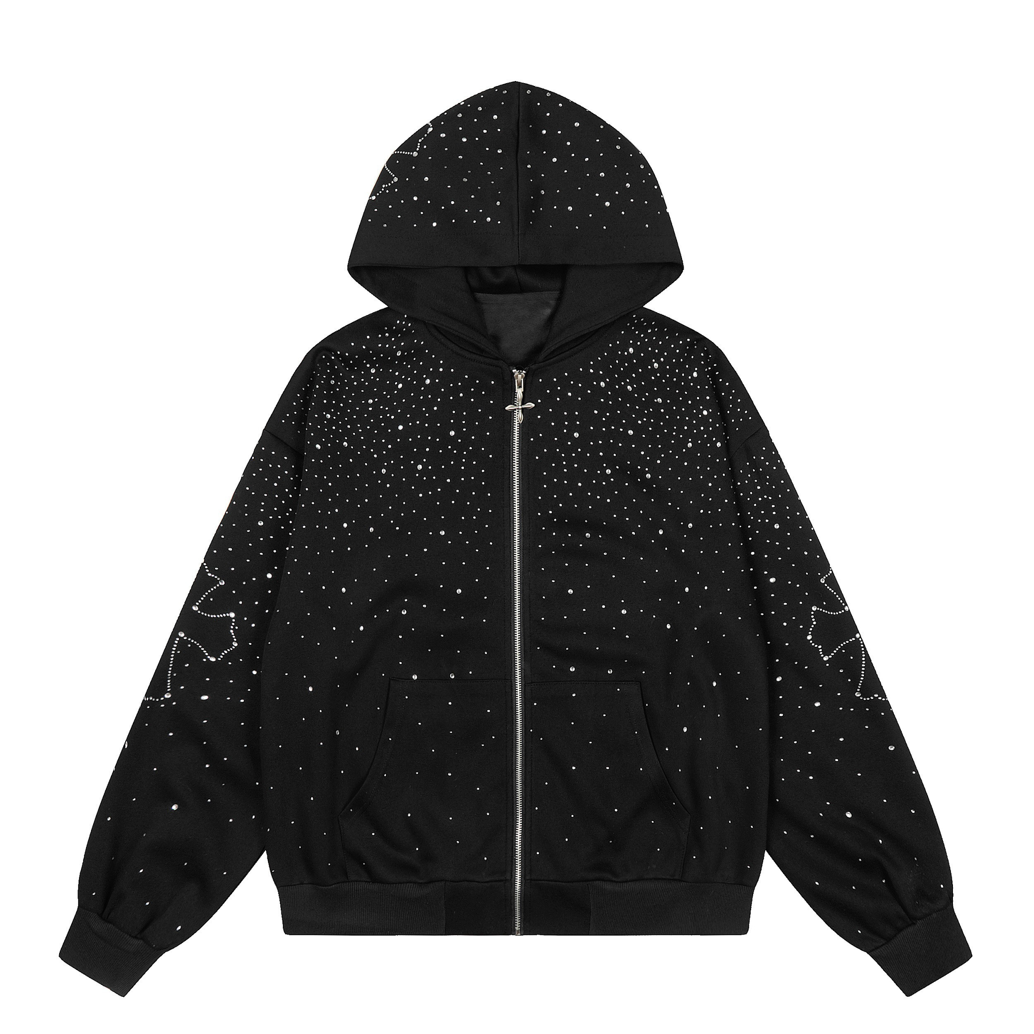 The Omirad All-Over Rhinestone Zip Hoodie features a full-coverage rhinestone dot pattern that creates a subtle star-like shimmer across the entire silhouette. Designed with a relaxed oversized fit and classic zip-up construction, this hoodie balances bold visual impact with clean streetwear structure. Finished with carefully placed embellishments across the body, sleeves, and hood, it delivers a refined statement look built for everyday wear.