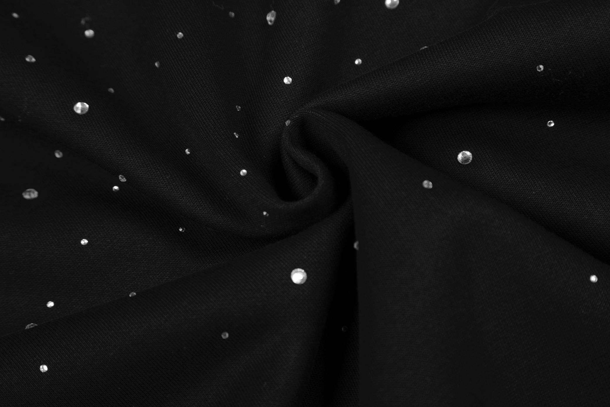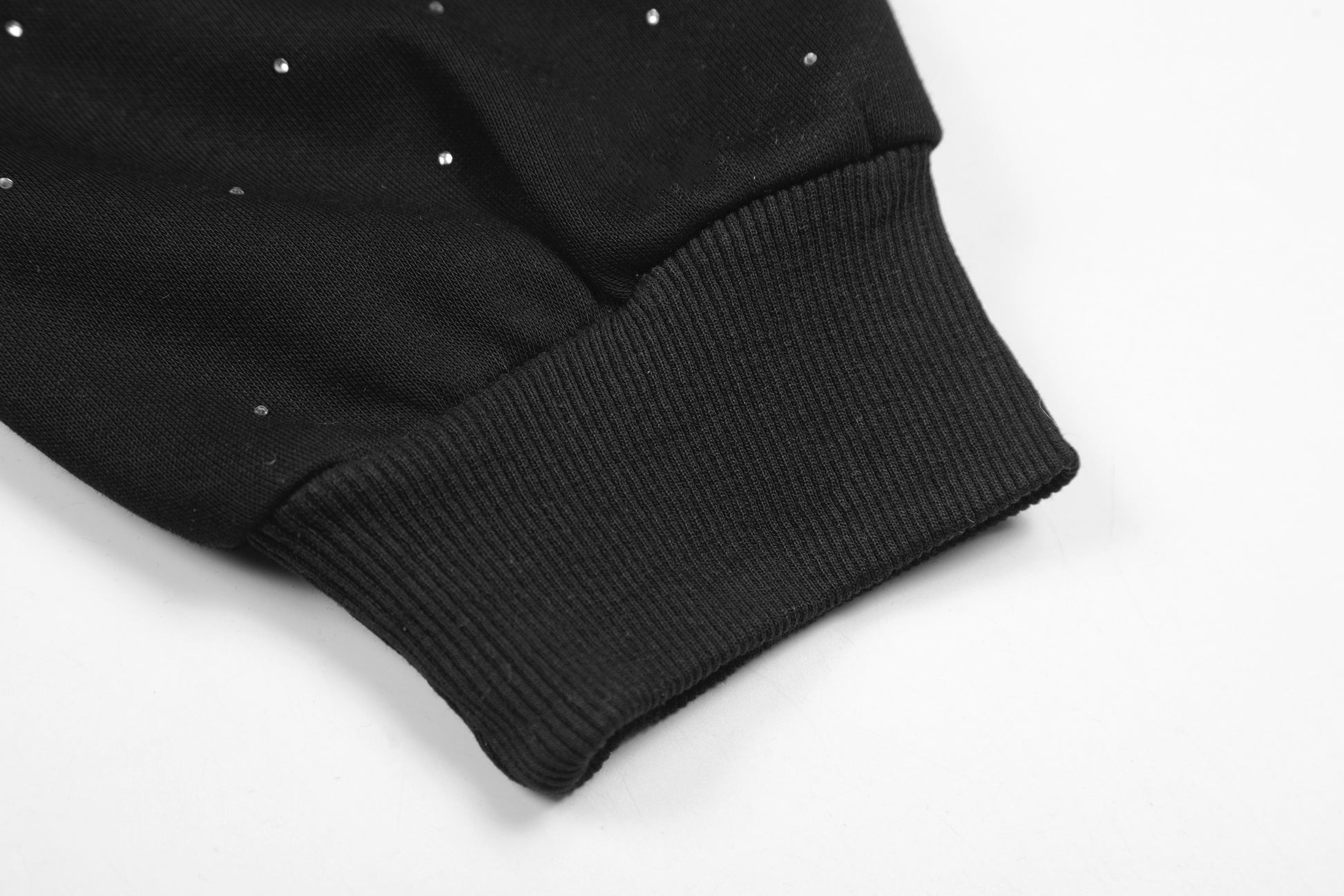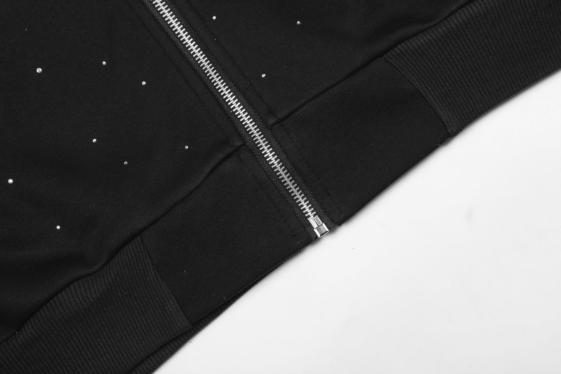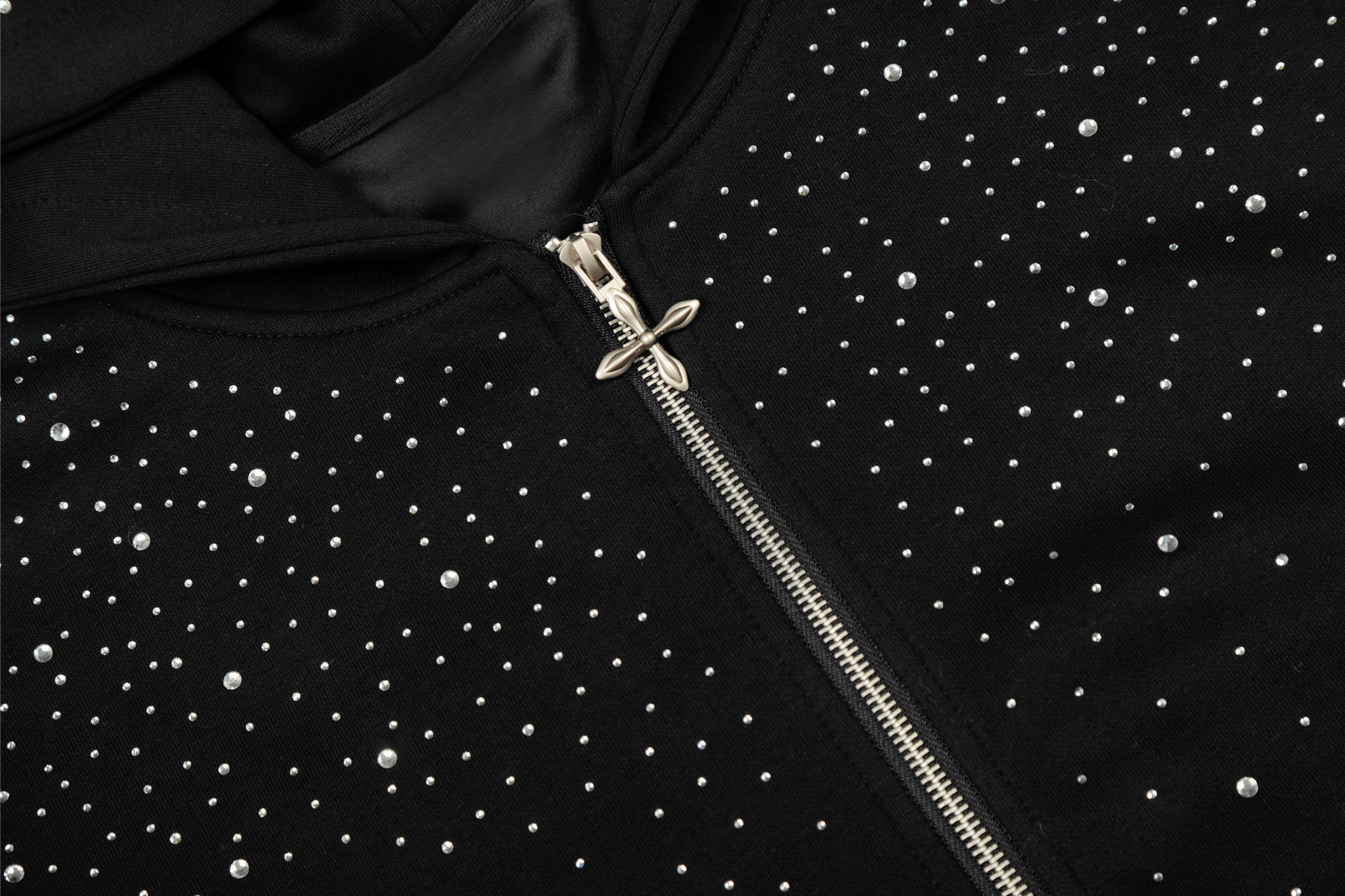Clothing details: Full zip front closure, hooded design, all-over rhinestone dot embellishment, relaxed oversized fit, ribbed cuffs and hem, front hand pockets, soft brushed interior for comfort.