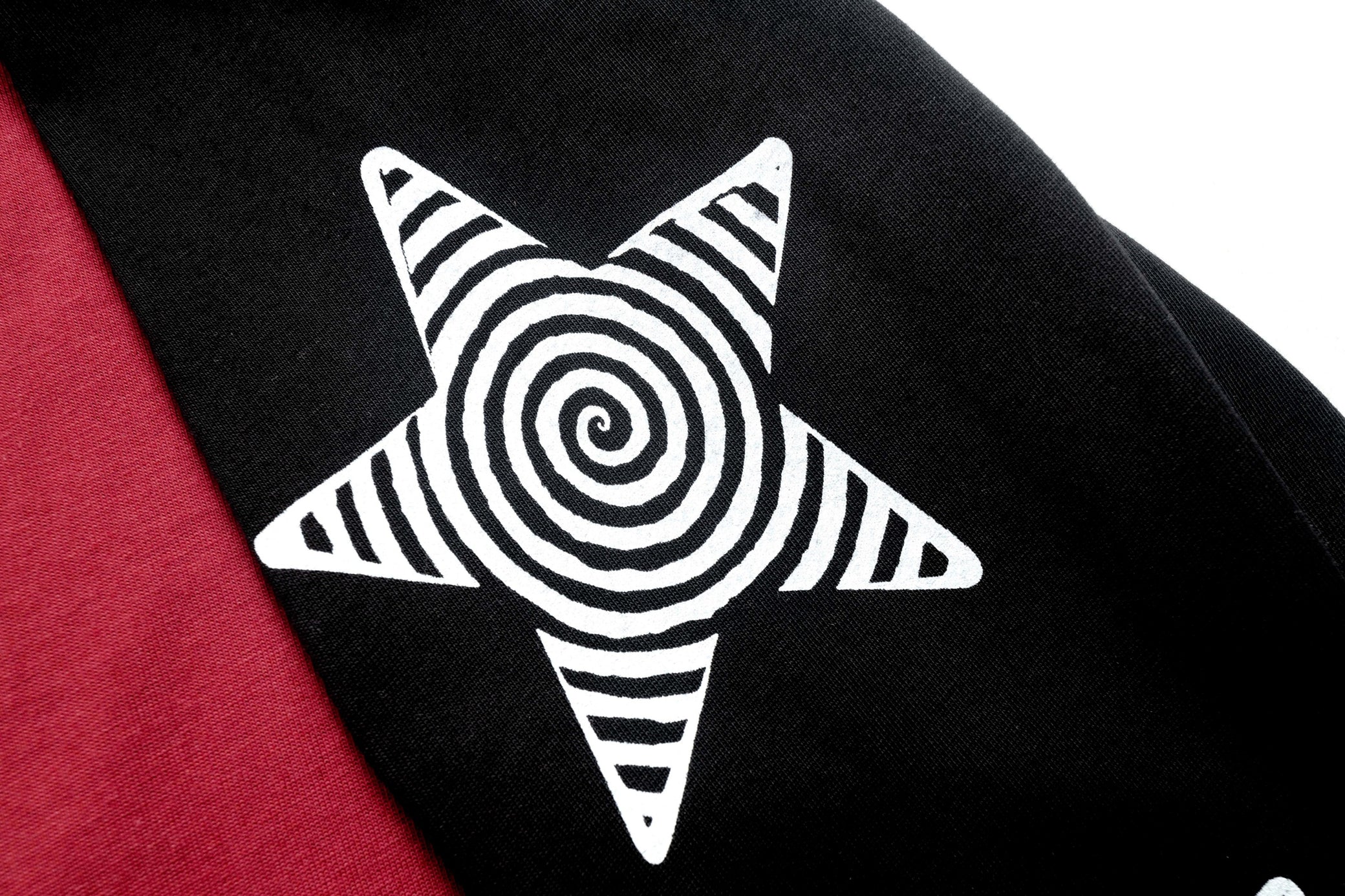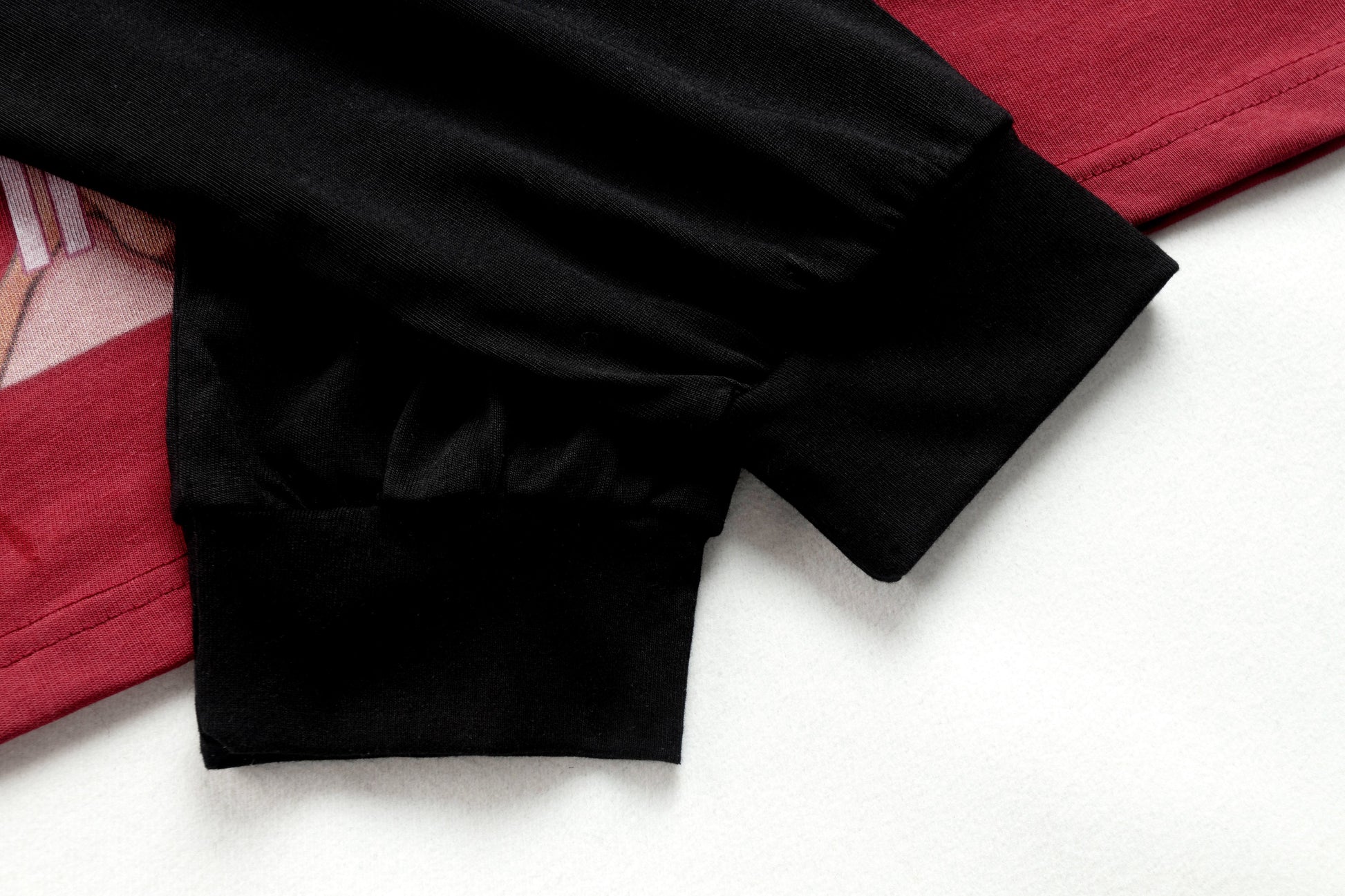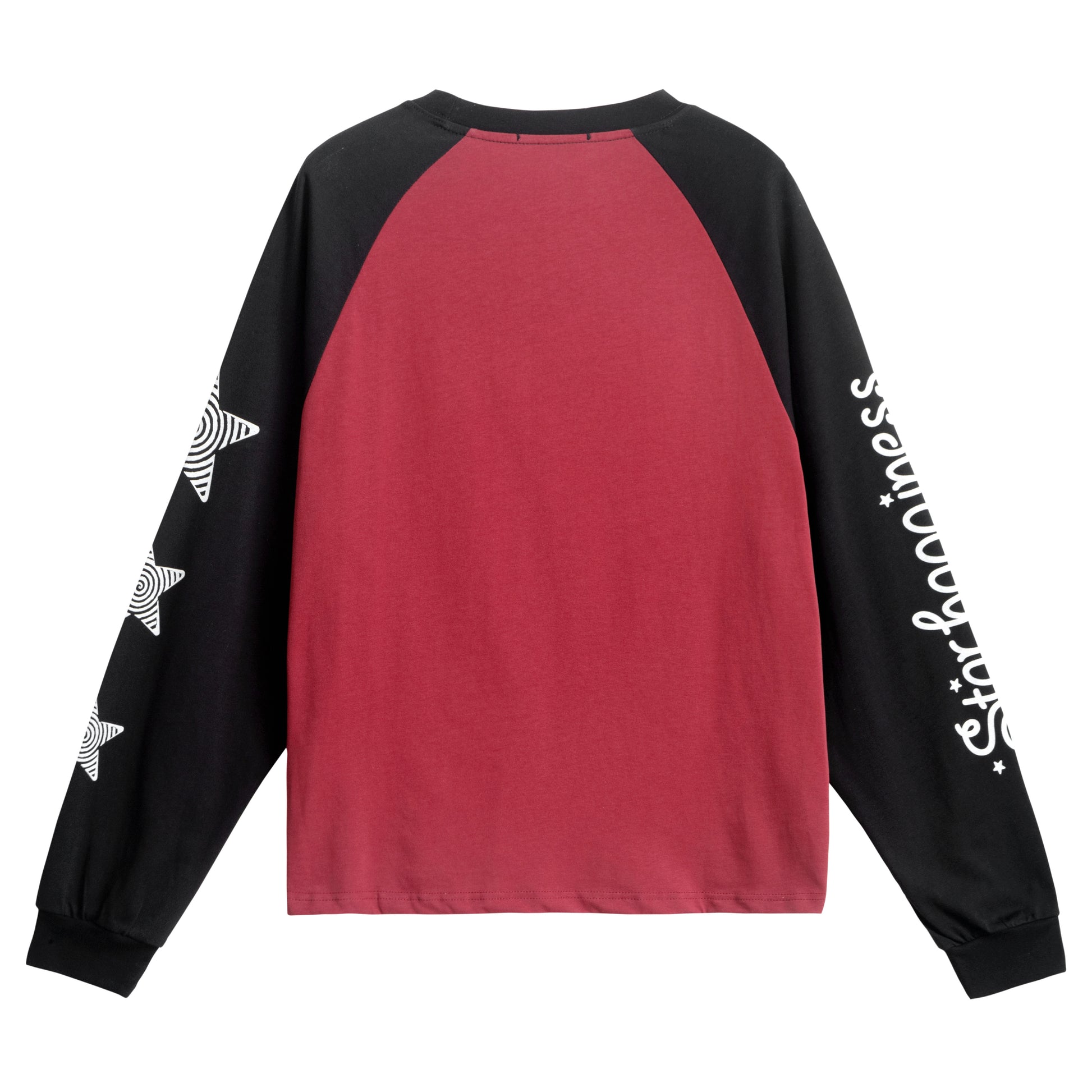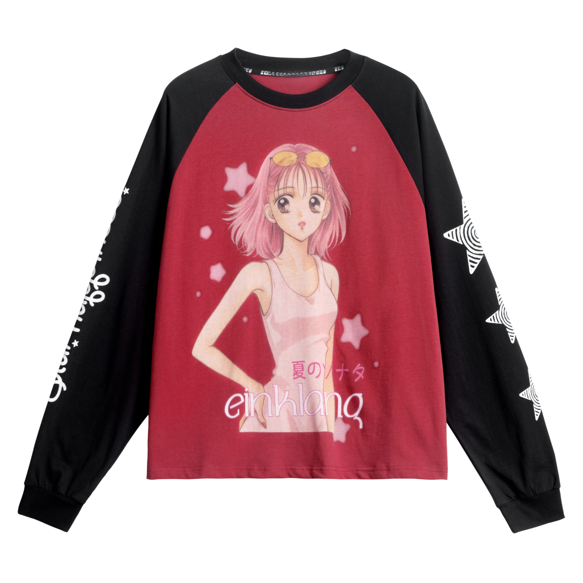 Clothing details: Raglan long sleeve construction, soft cotton fabric, anime-style graphic print at front, contrast color-block body and sleeves, ribbed cuffs and neckline, relaxed fit with natural drape, lightweight and breathable feel for daily street wear.
