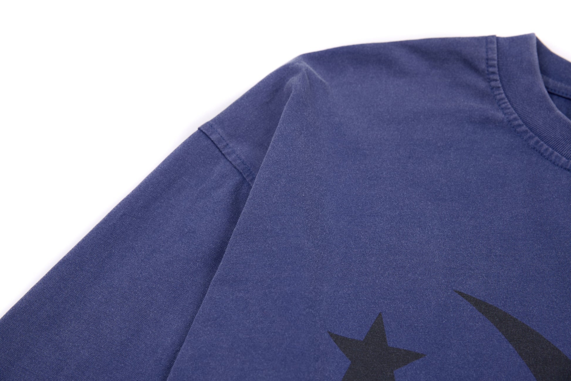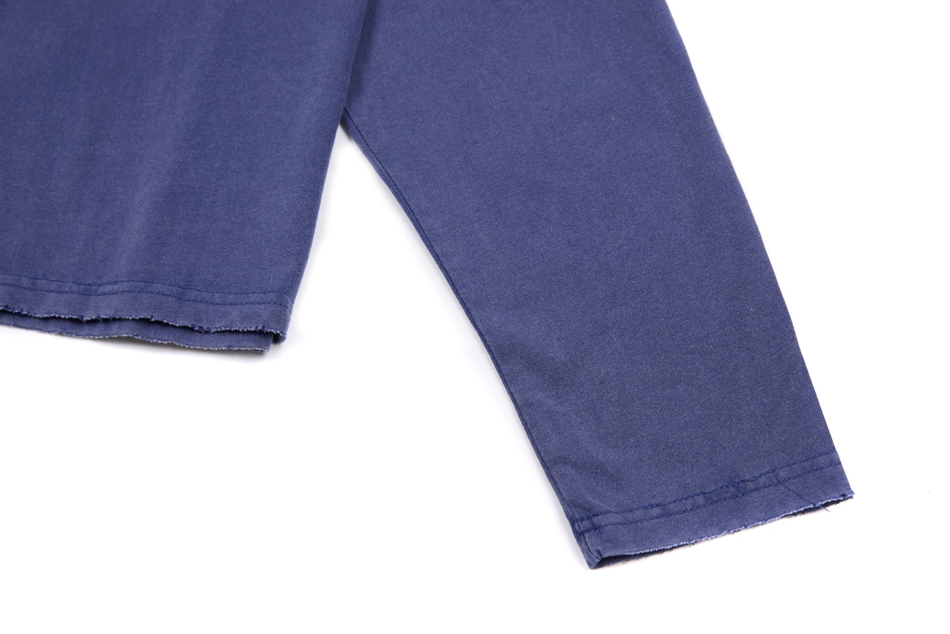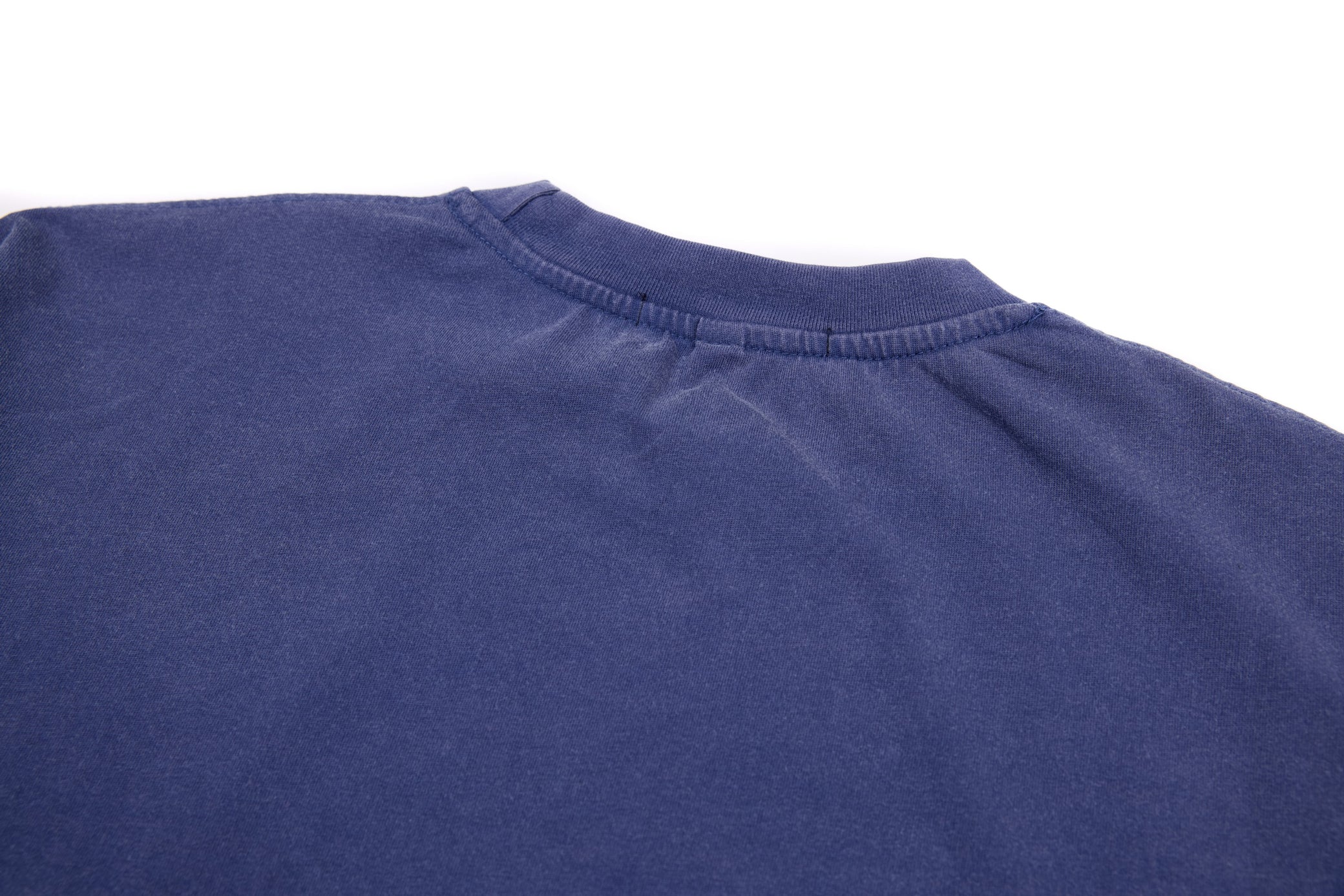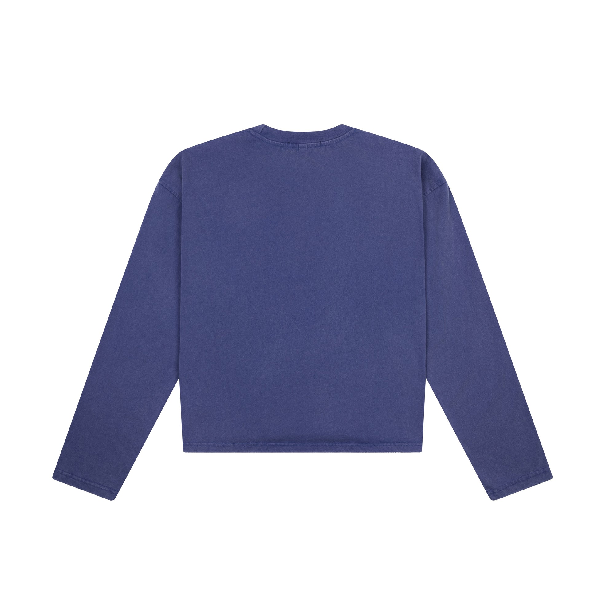 The Omirad Archival Graphic Heavyweight Long Sleeve brings a raw, vintage street vibe with a bold oversized front print and a washed-down indigo tone. The cropped, boxy silhouette hits that modern streetwear proportion, while the large black emblem graphic gives it a mysterious, archival energy — the kind of symbol that looks like it came off an old poster or underground crew tee.