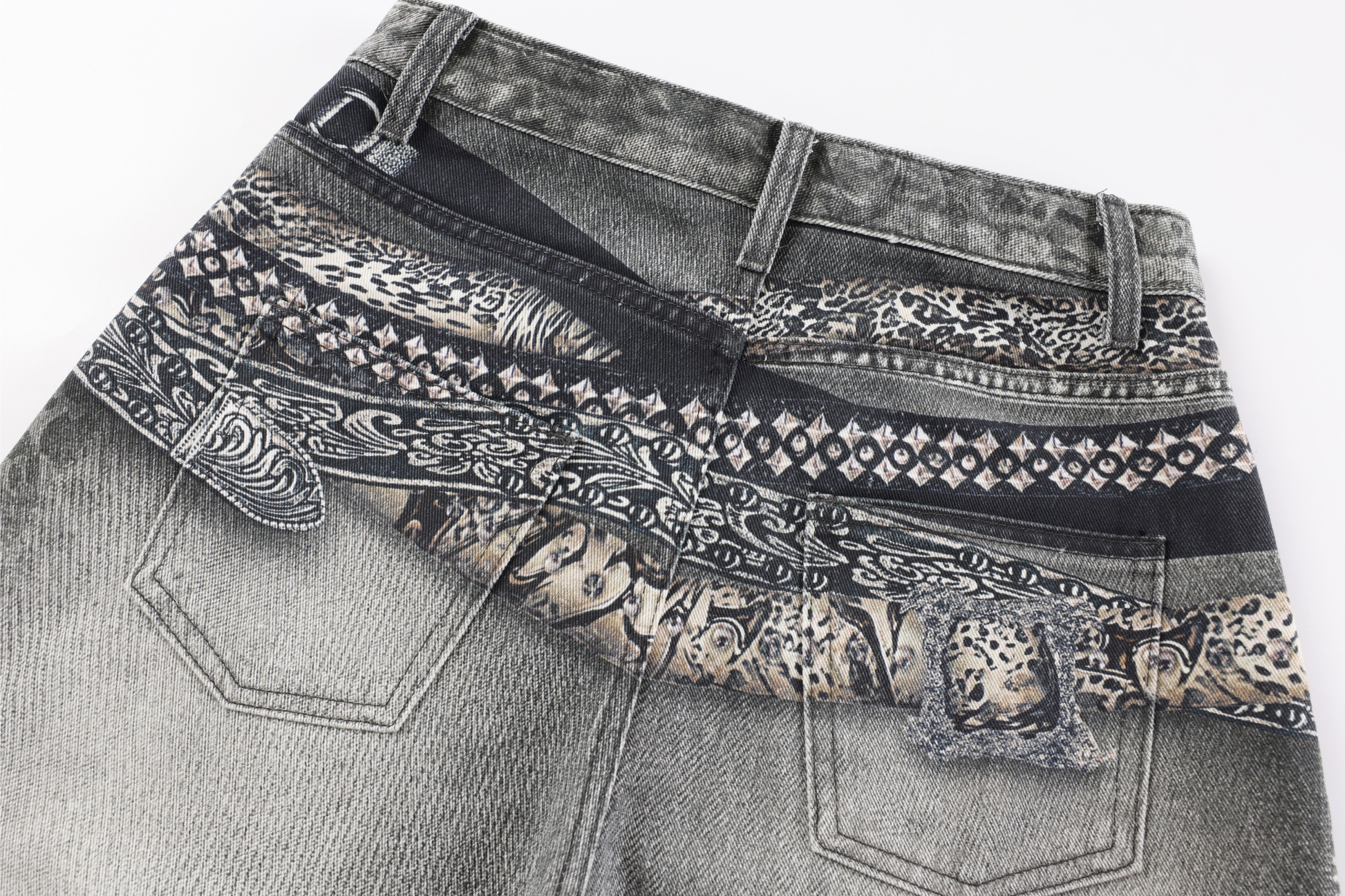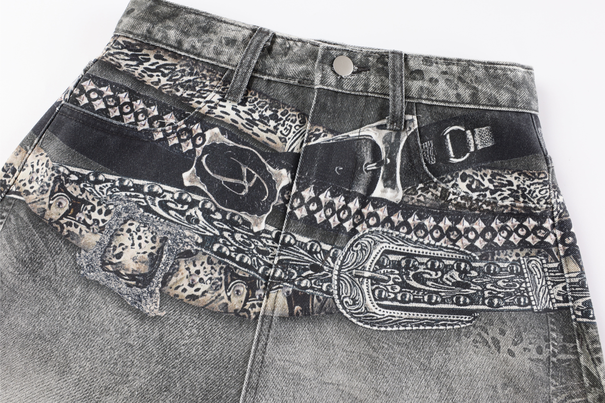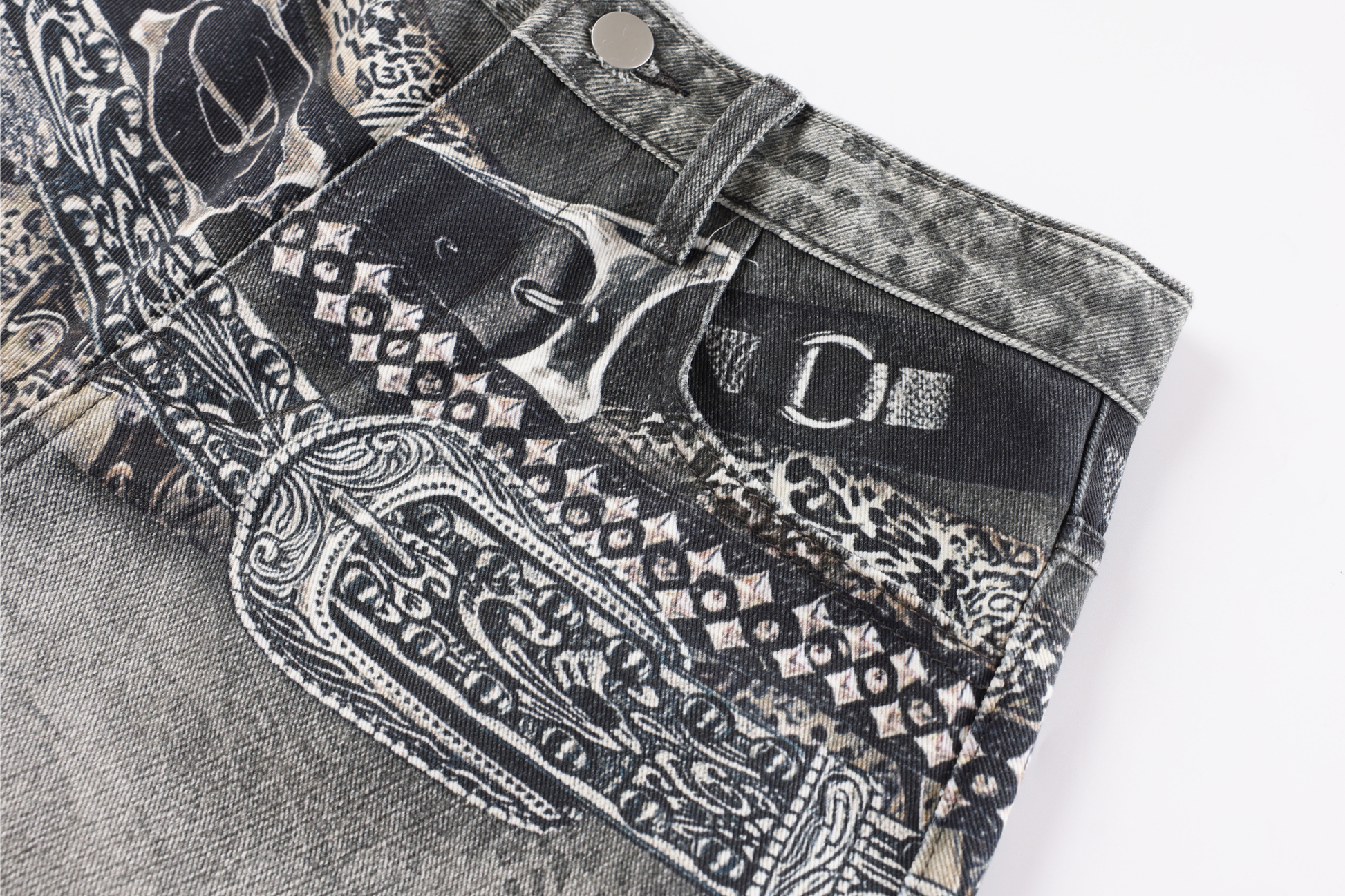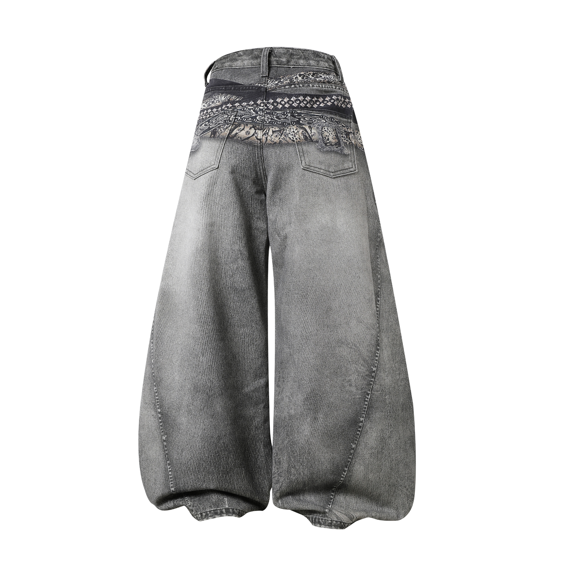 The Omirad Bandana Patch Curved Denim Pants fuse Y2K attitude with artistic street expression. Featuring a layered waistband with printed bandana patchwork and an iconic curved-leg silhouette, these pants redefine contemporary denim with a vintage twist. The washed grey tone and sculpted shape create a bold contrast of texture and flow — built for those who move differently.