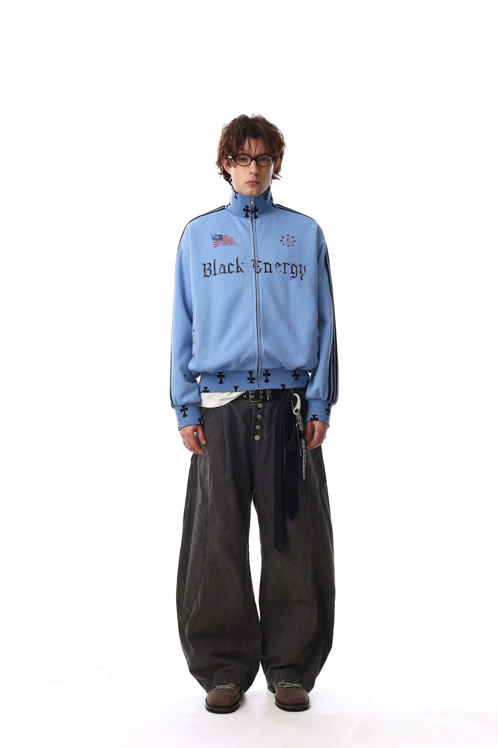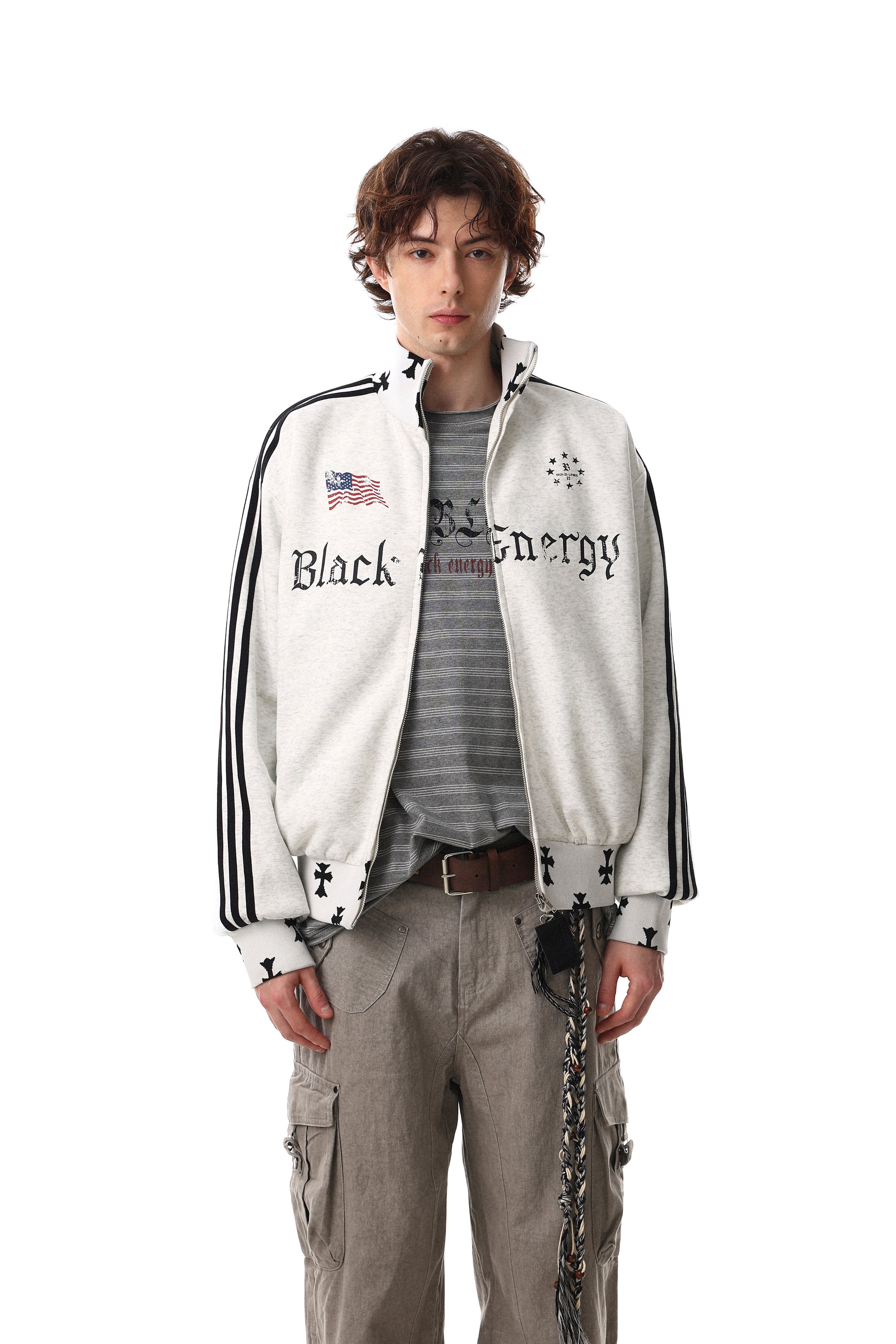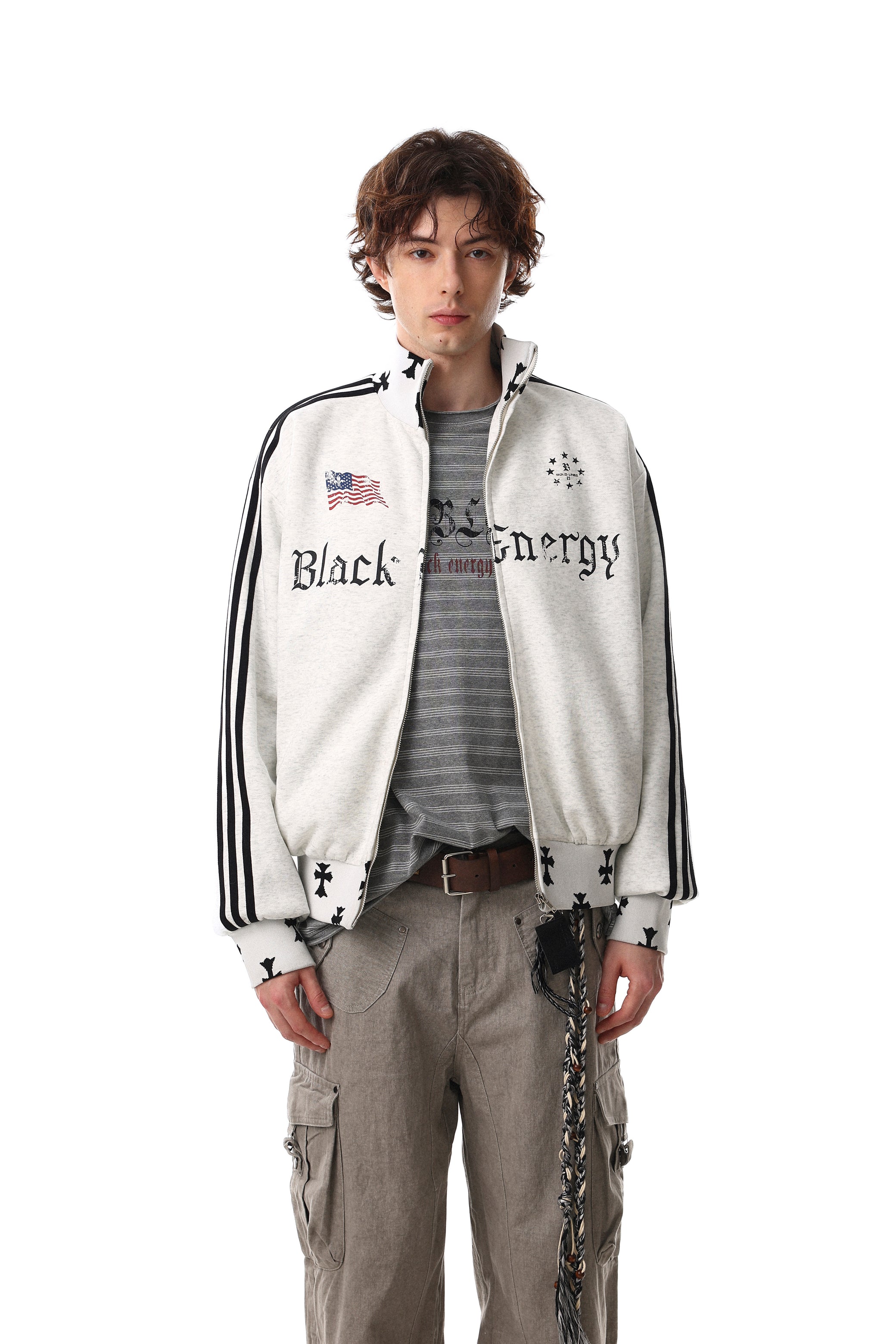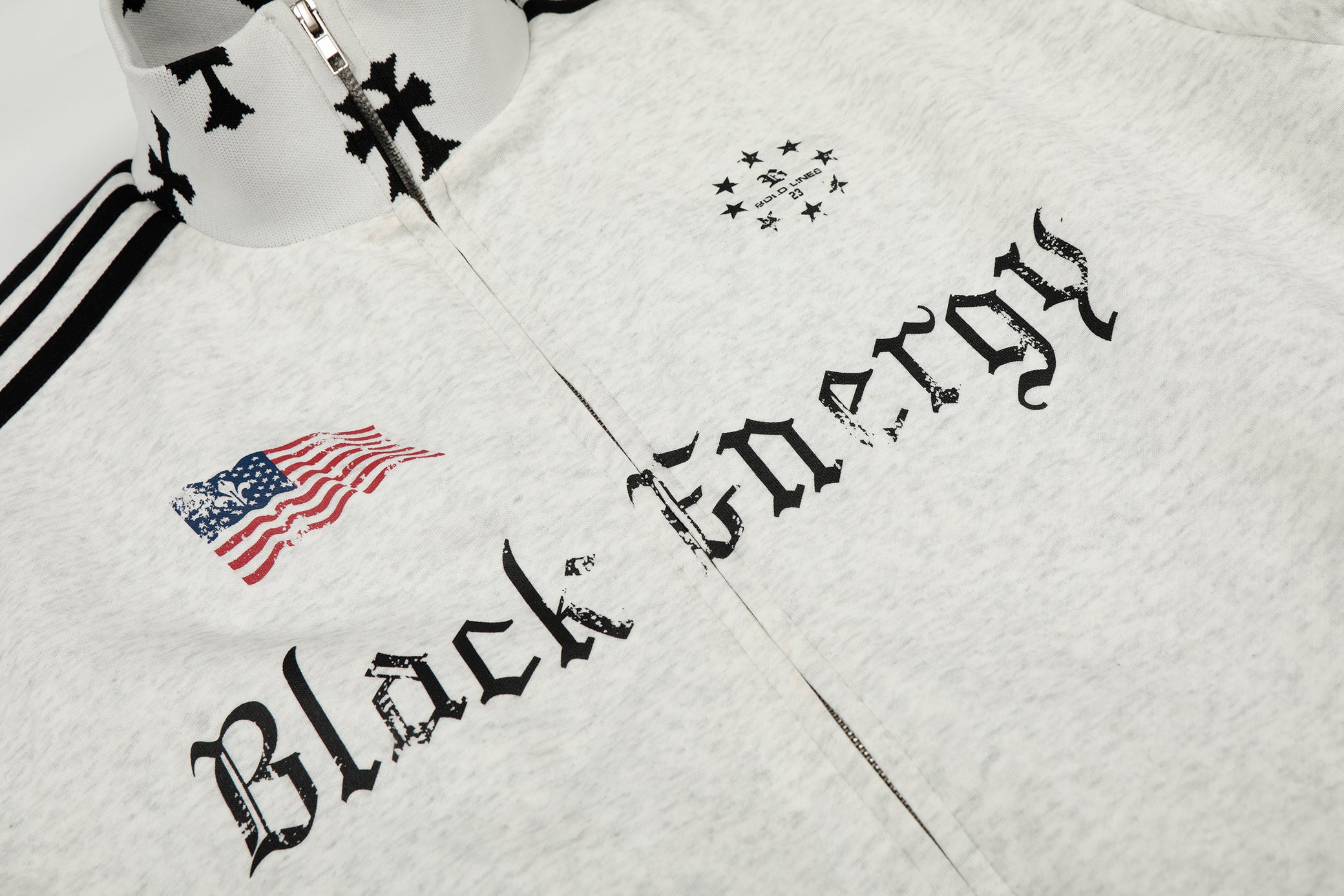 Clothing details: Stand collar design, full-zip front closure, bold “Black Energy” chest print, contrast stripe detailing along sleeves, ribbed cuffs and hem with cross pattern accents, relaxed fit.