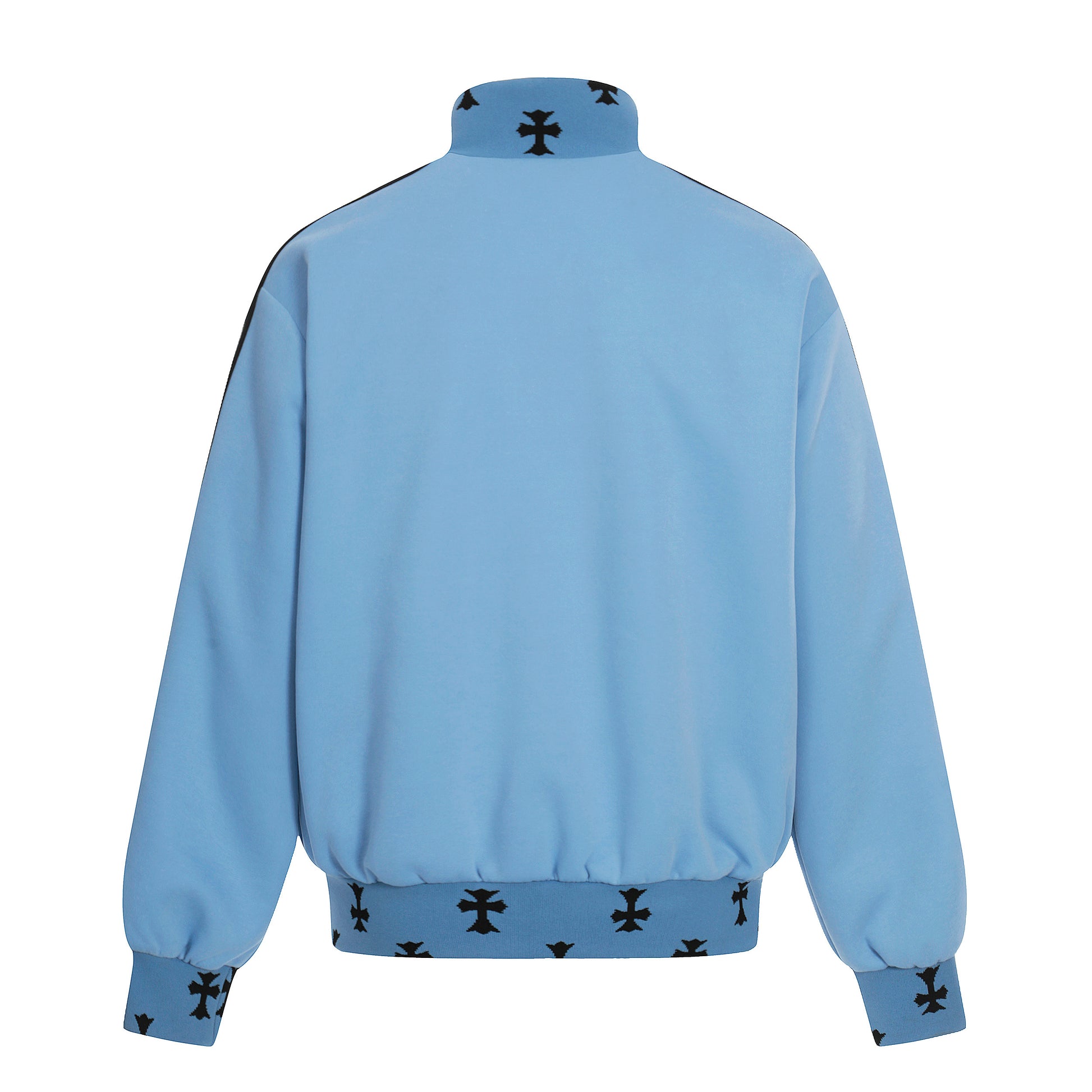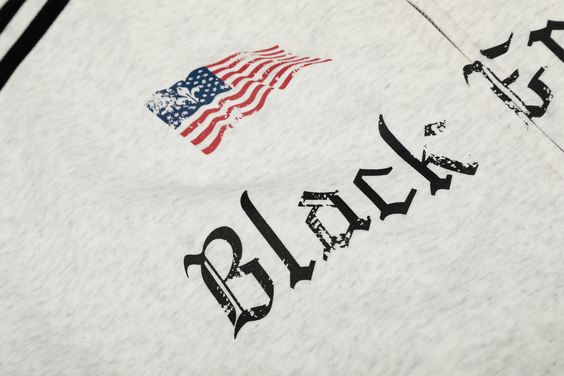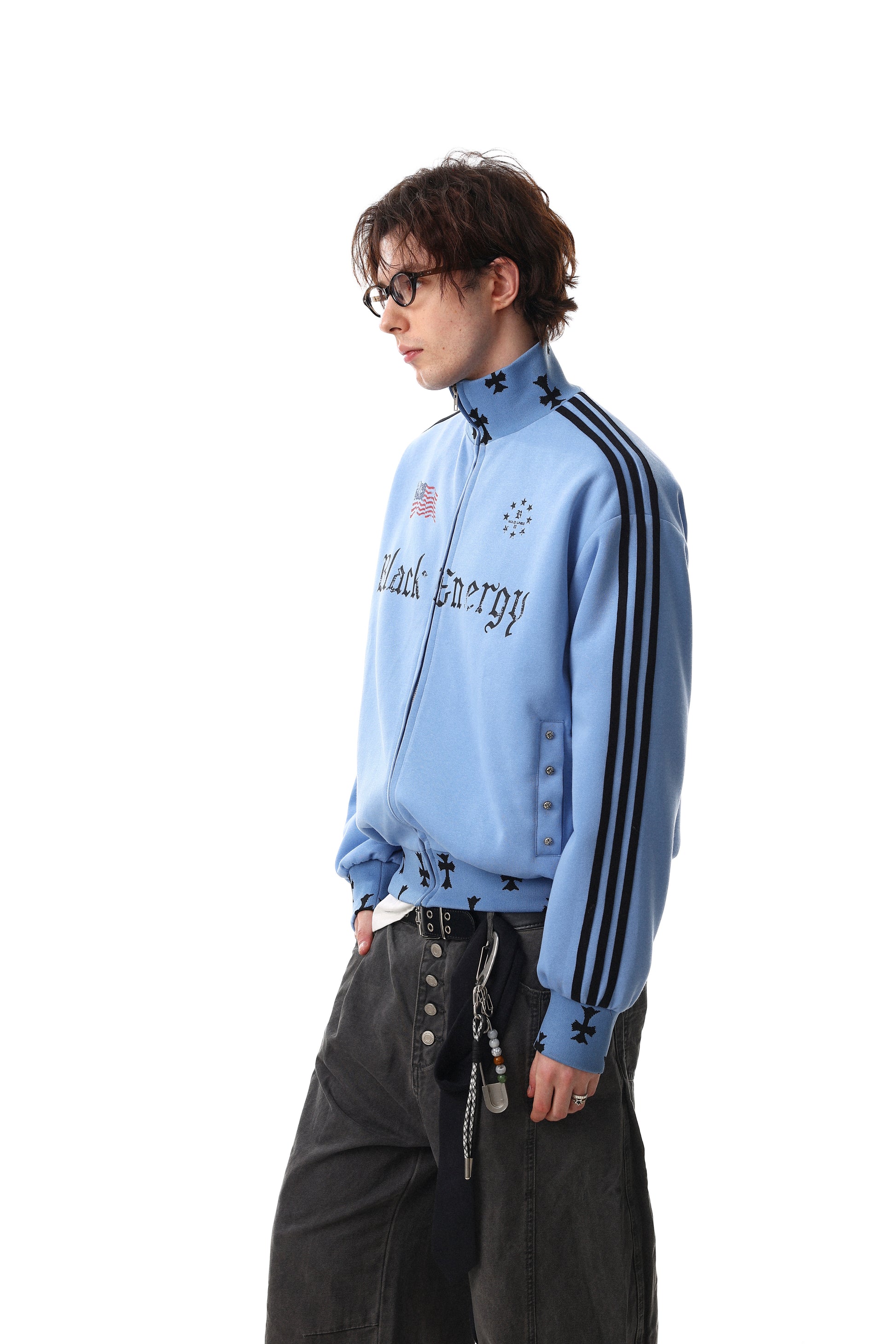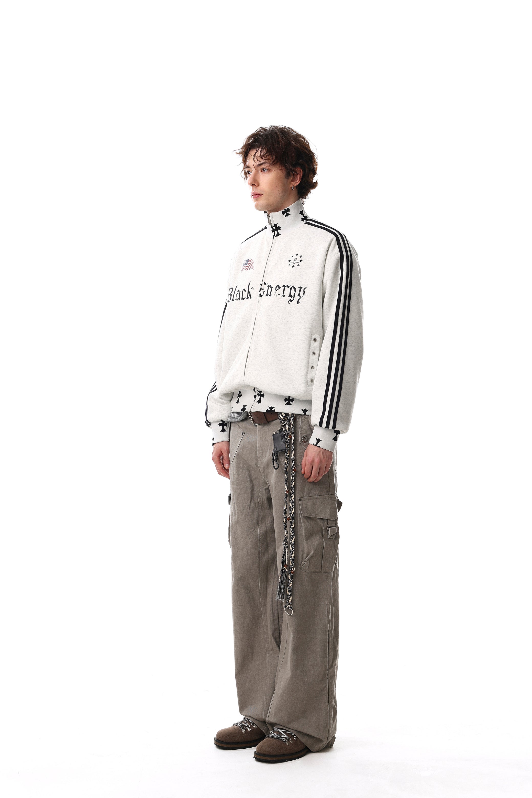 Clothing details: Stand collar design, full-zip front closure, bold “Black Energy” chest print, contrast stripe detailing along sleeves, ribbed cuffs and hem with cross pattern accents, relaxed fit.