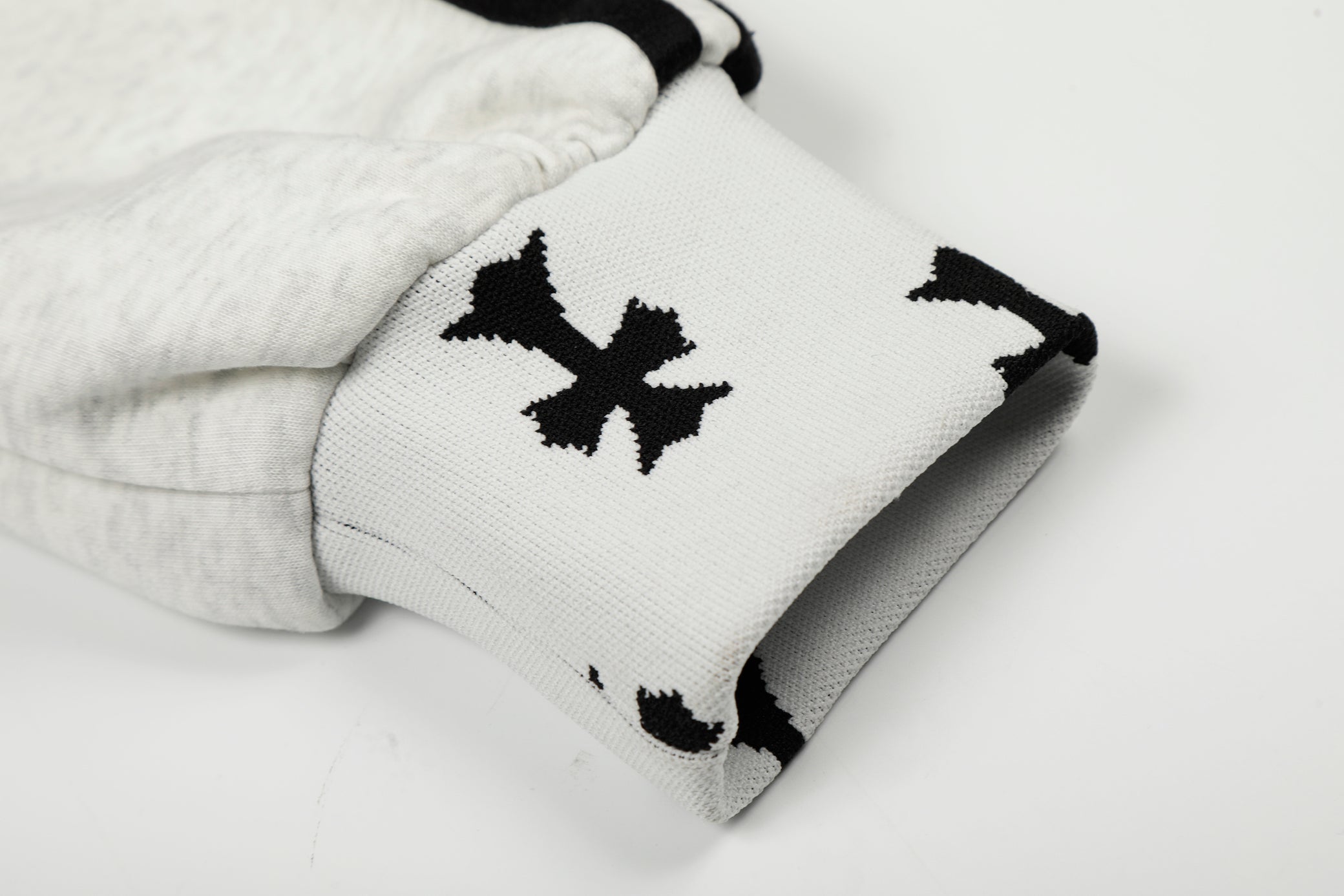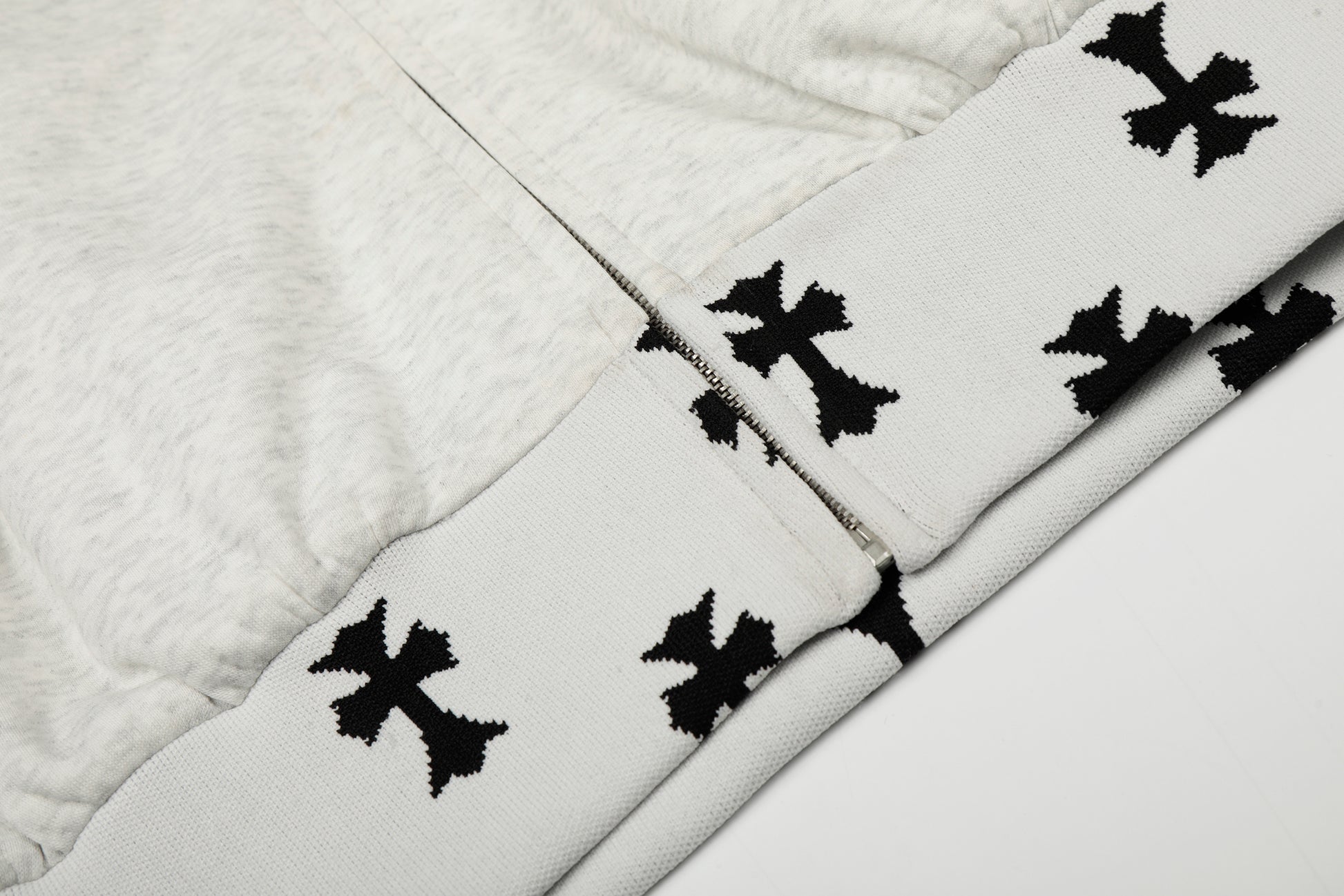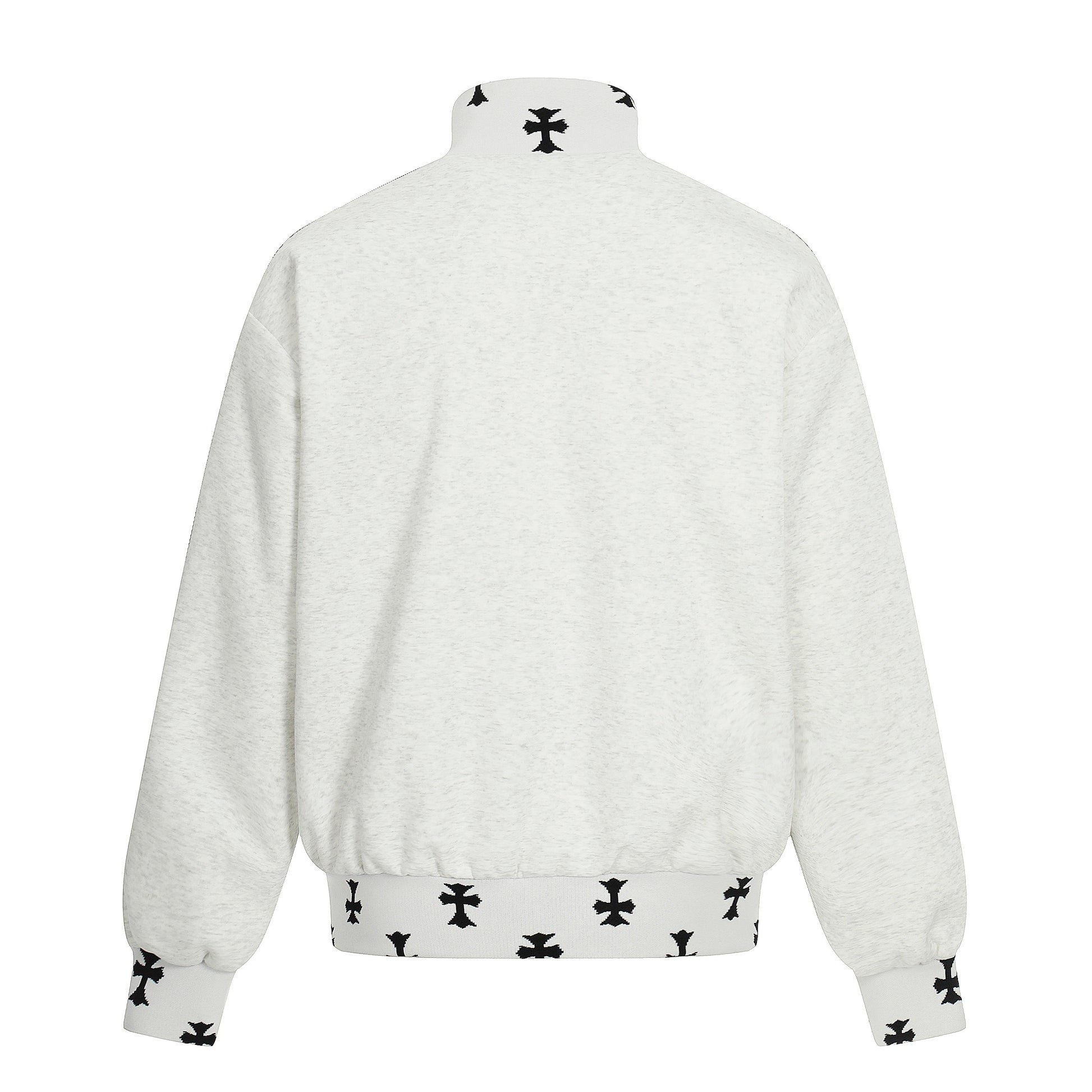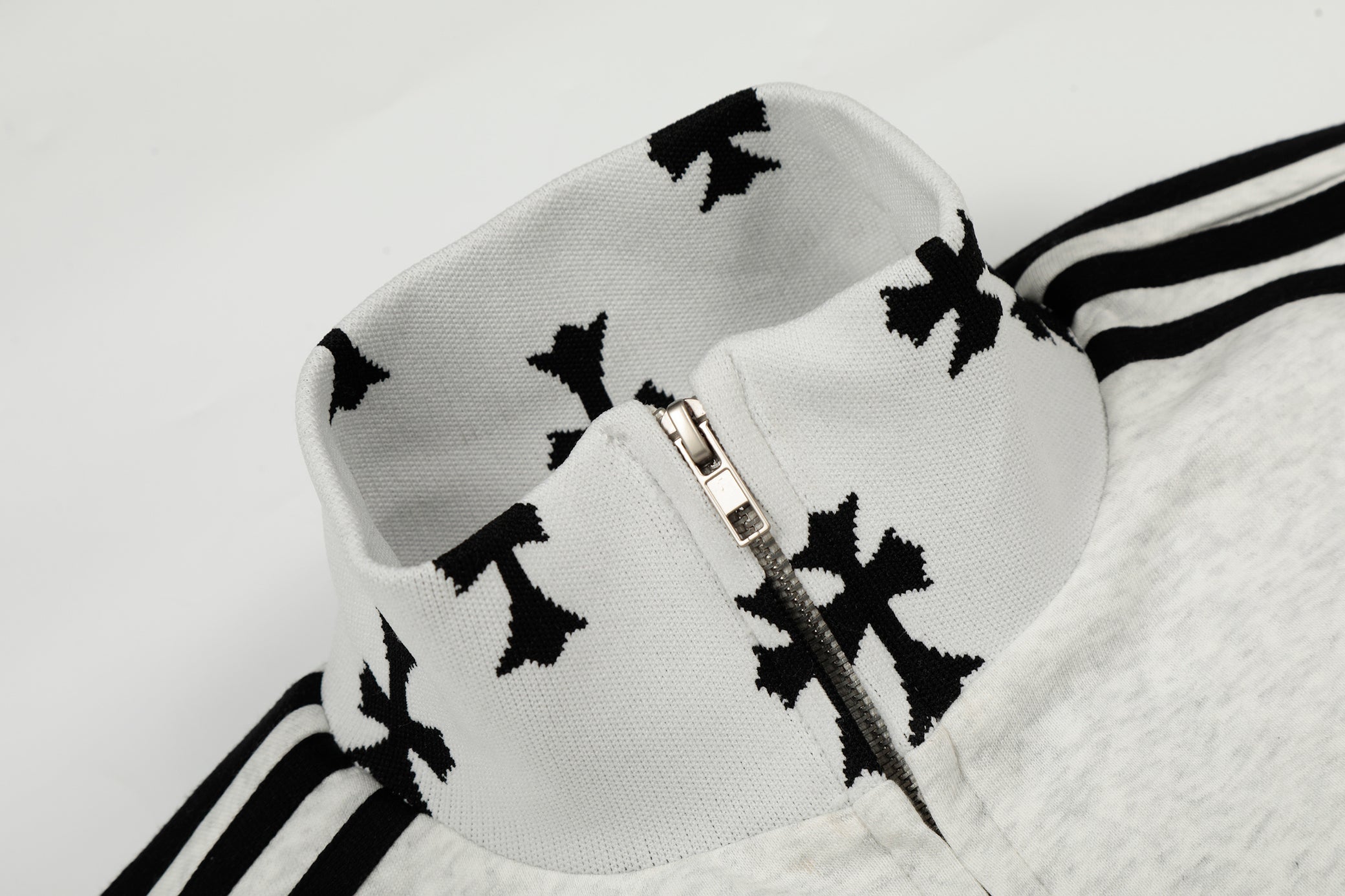Clothing details: Stand collar design, full-zip front closure, bold “Black Energy” chest print, contrast stripe detailing along sleeves, ribbed cuffs and hem with cross pattern accents, relaxed fit.