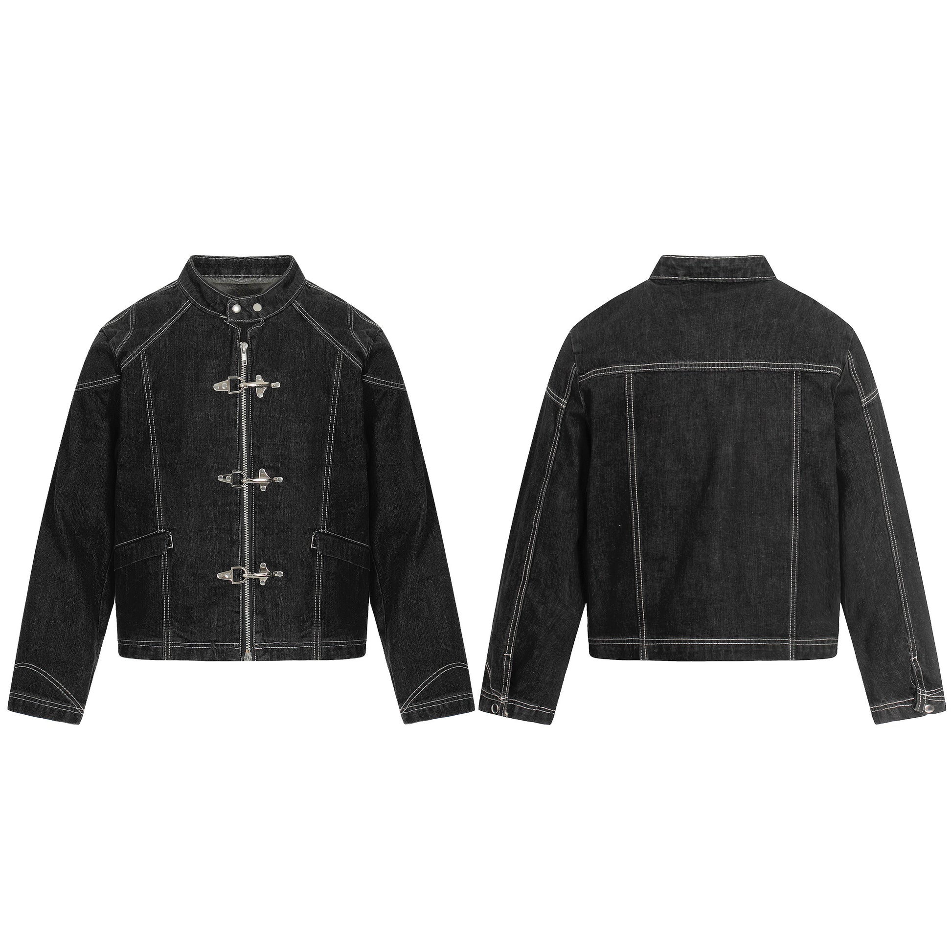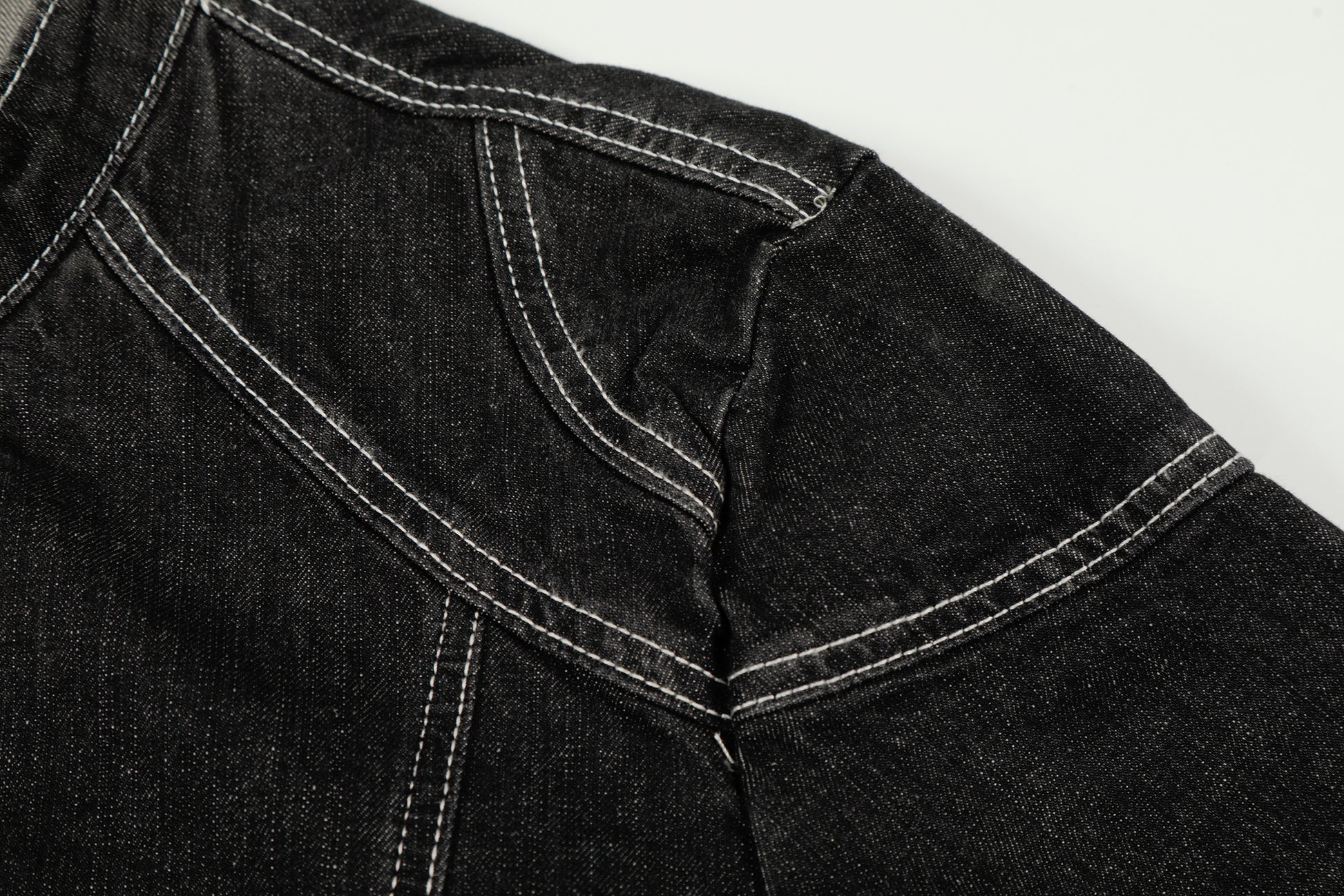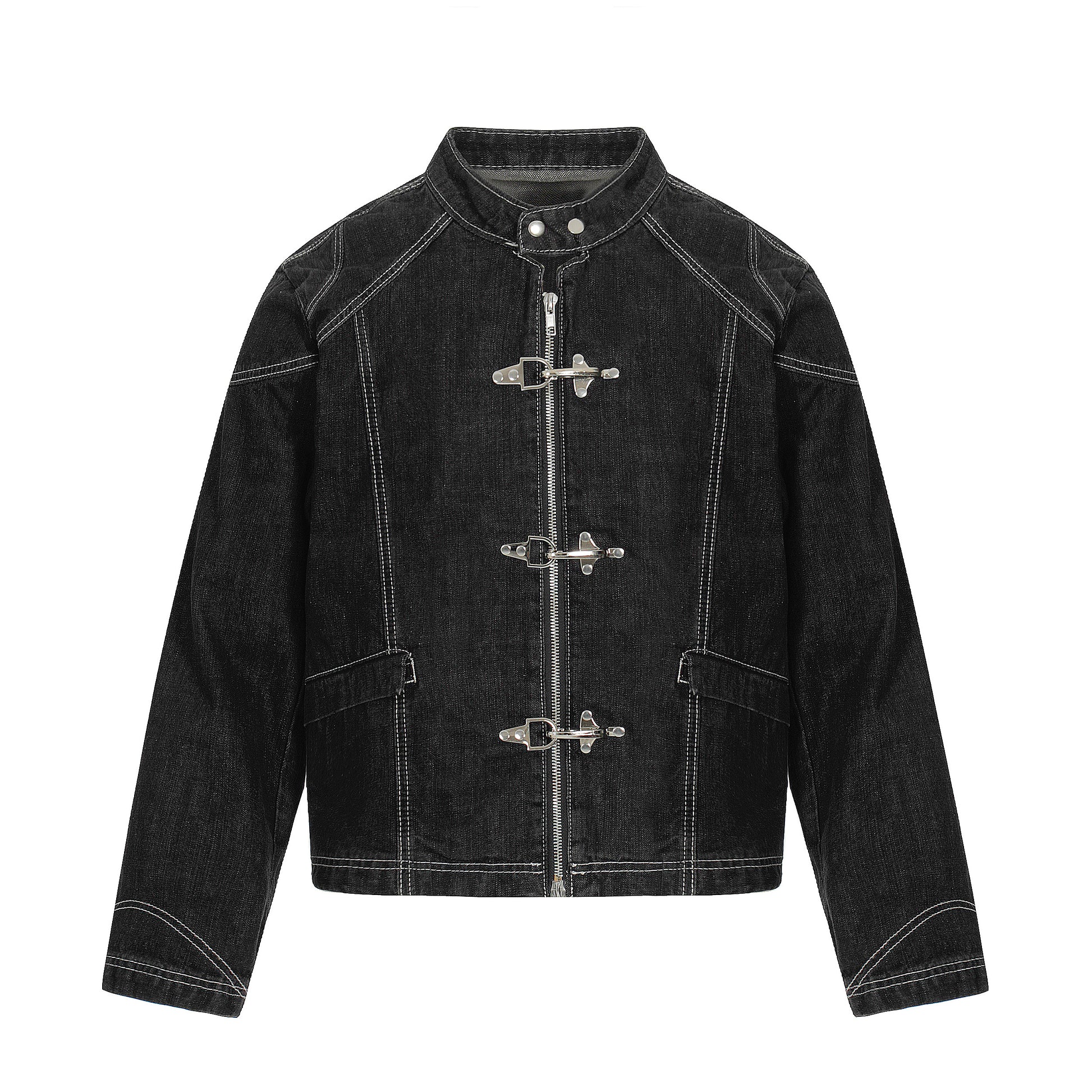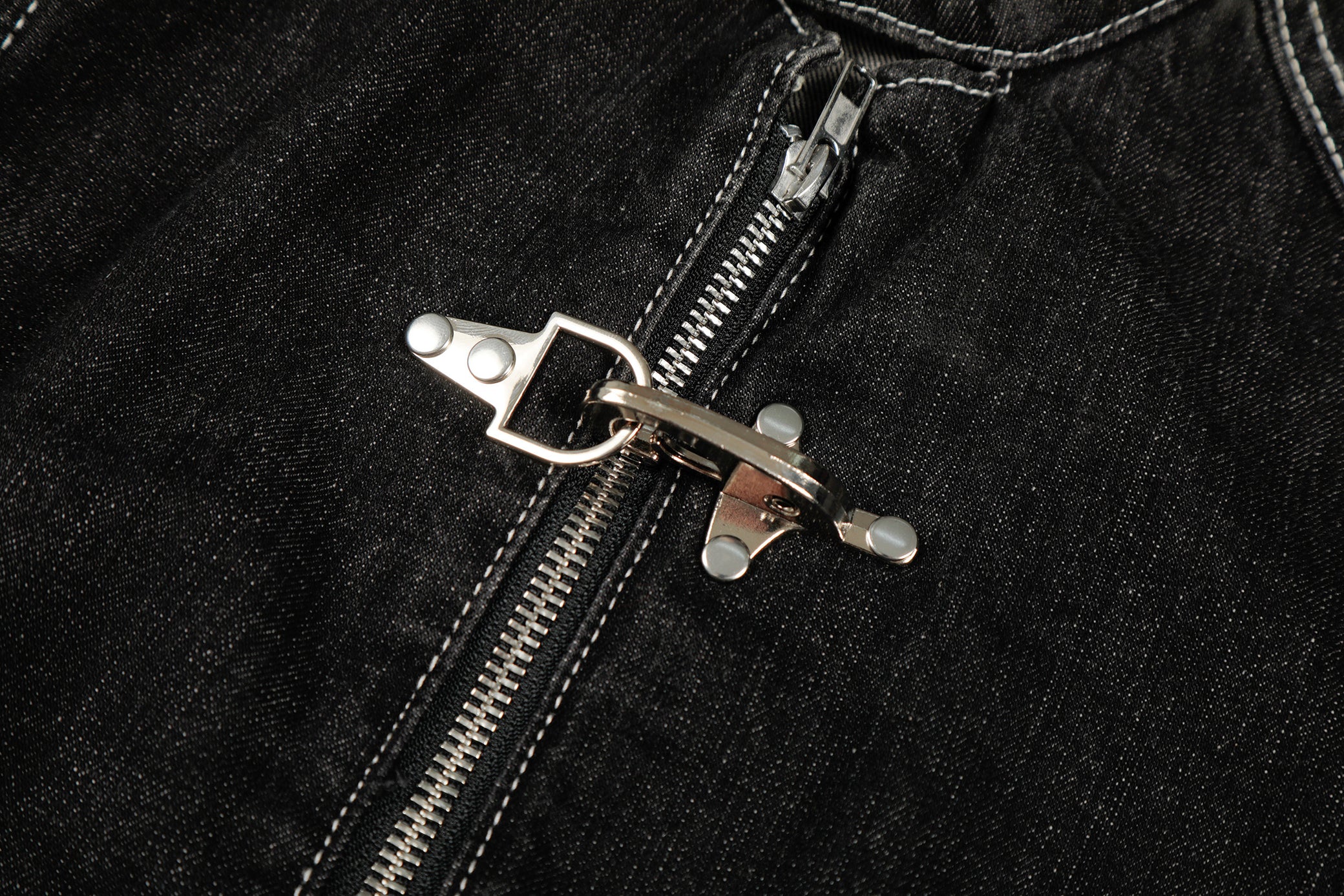 Clothing details: Front metal buckle closures, contrast stitching, cropped workwear silhouette, washed black denim, adjustable sleeve cuffs