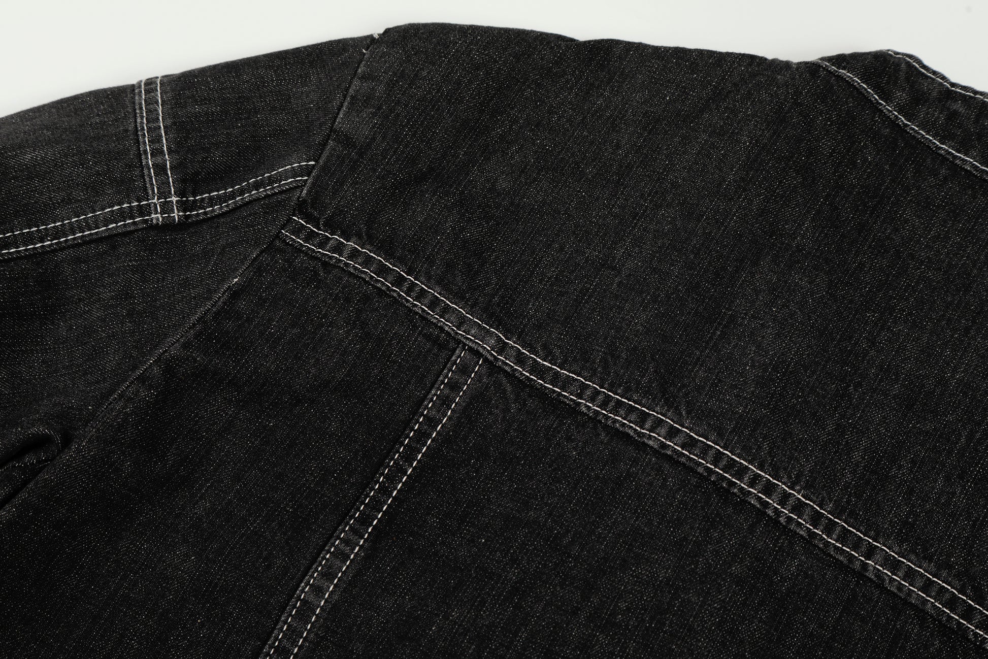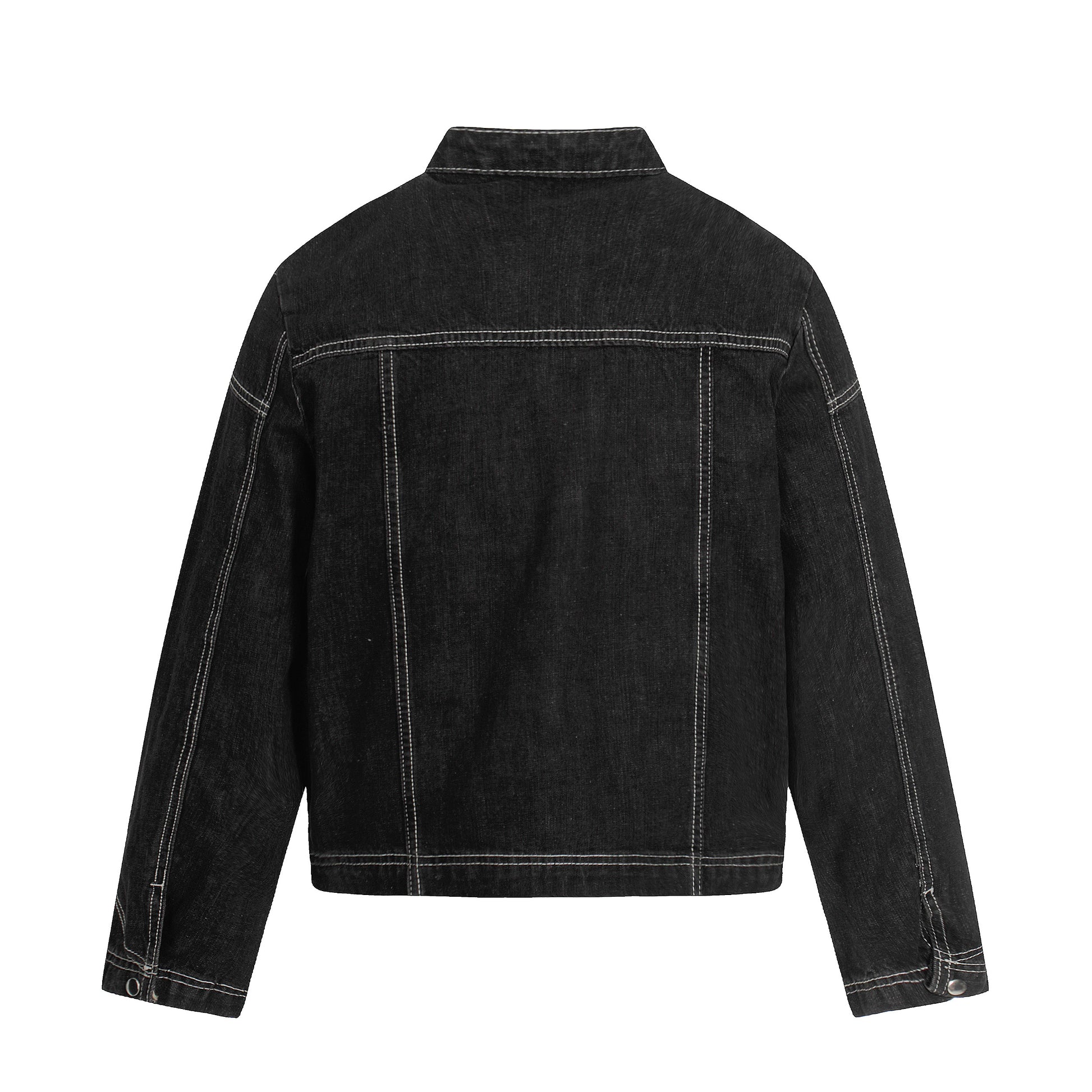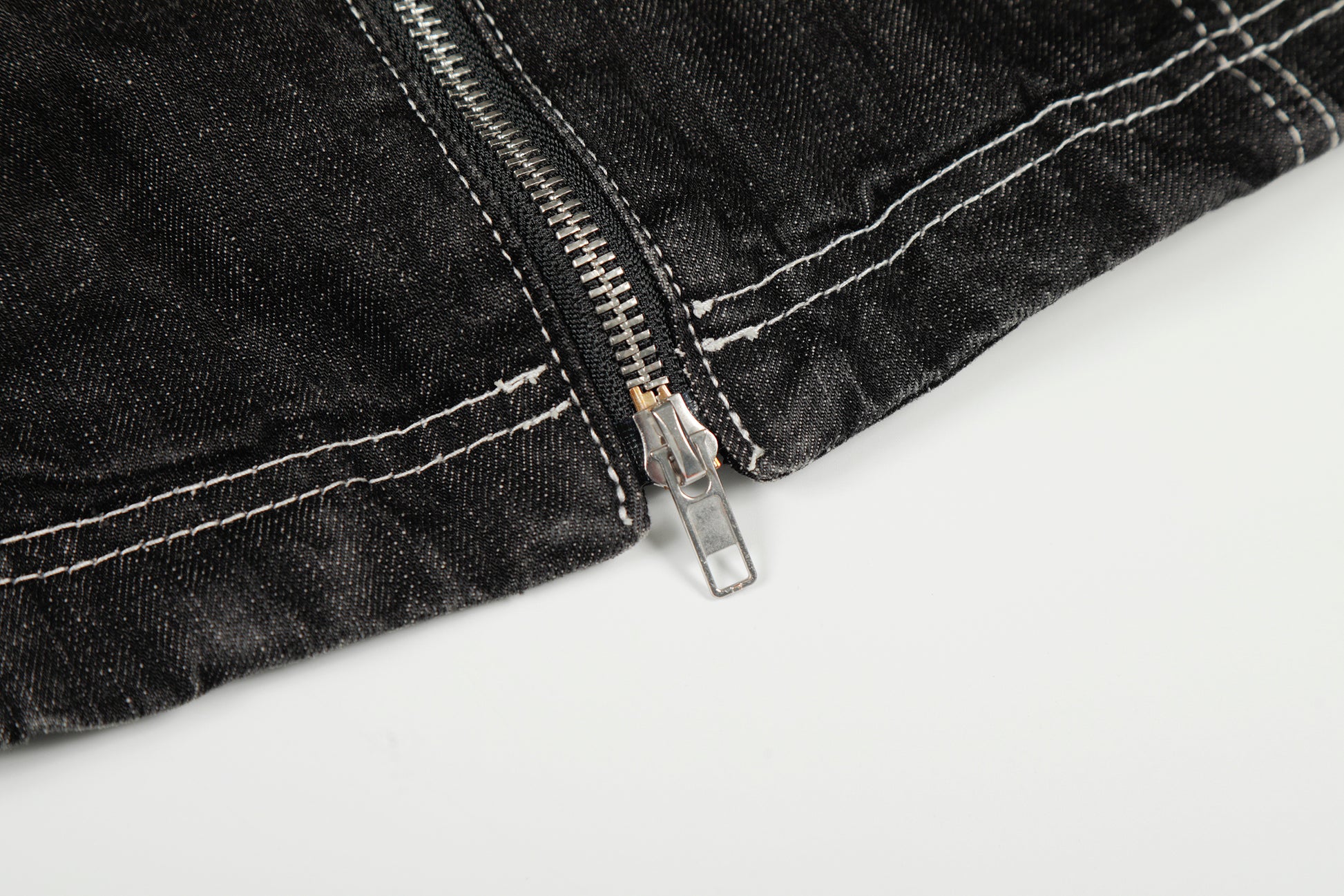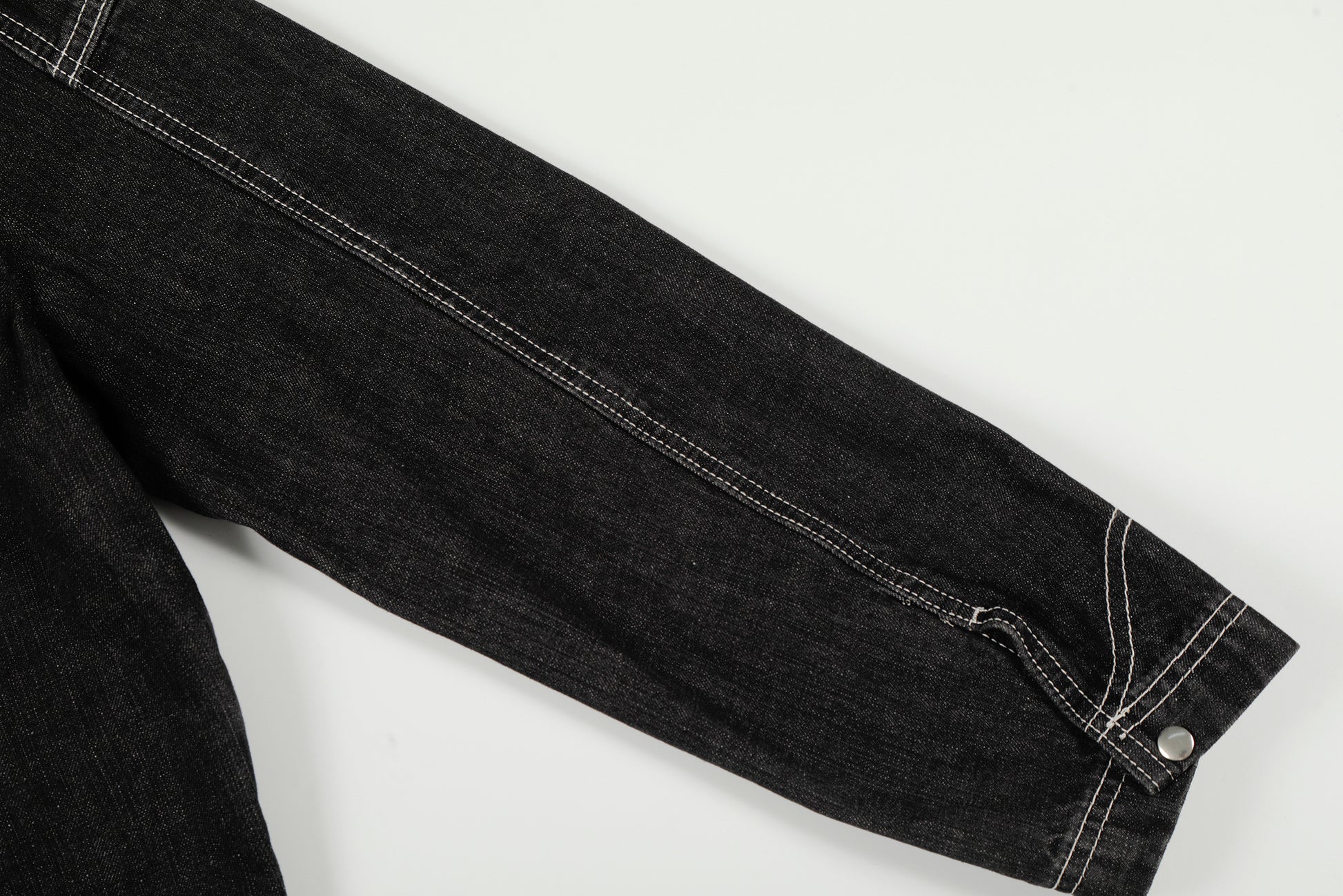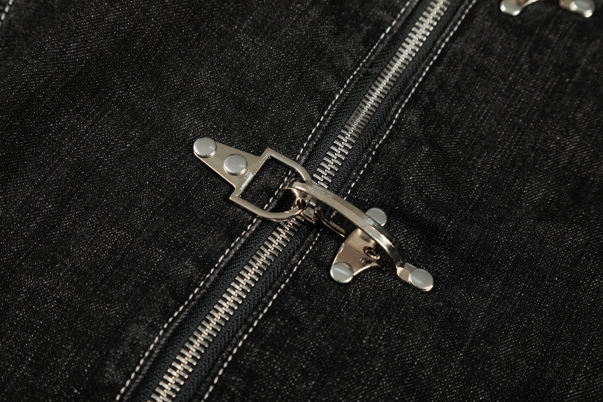Clothing details: Front metal buckle closures, contrast stitching, cropped workwear silhouette, washed black denim, adjustable sleeve cuffs