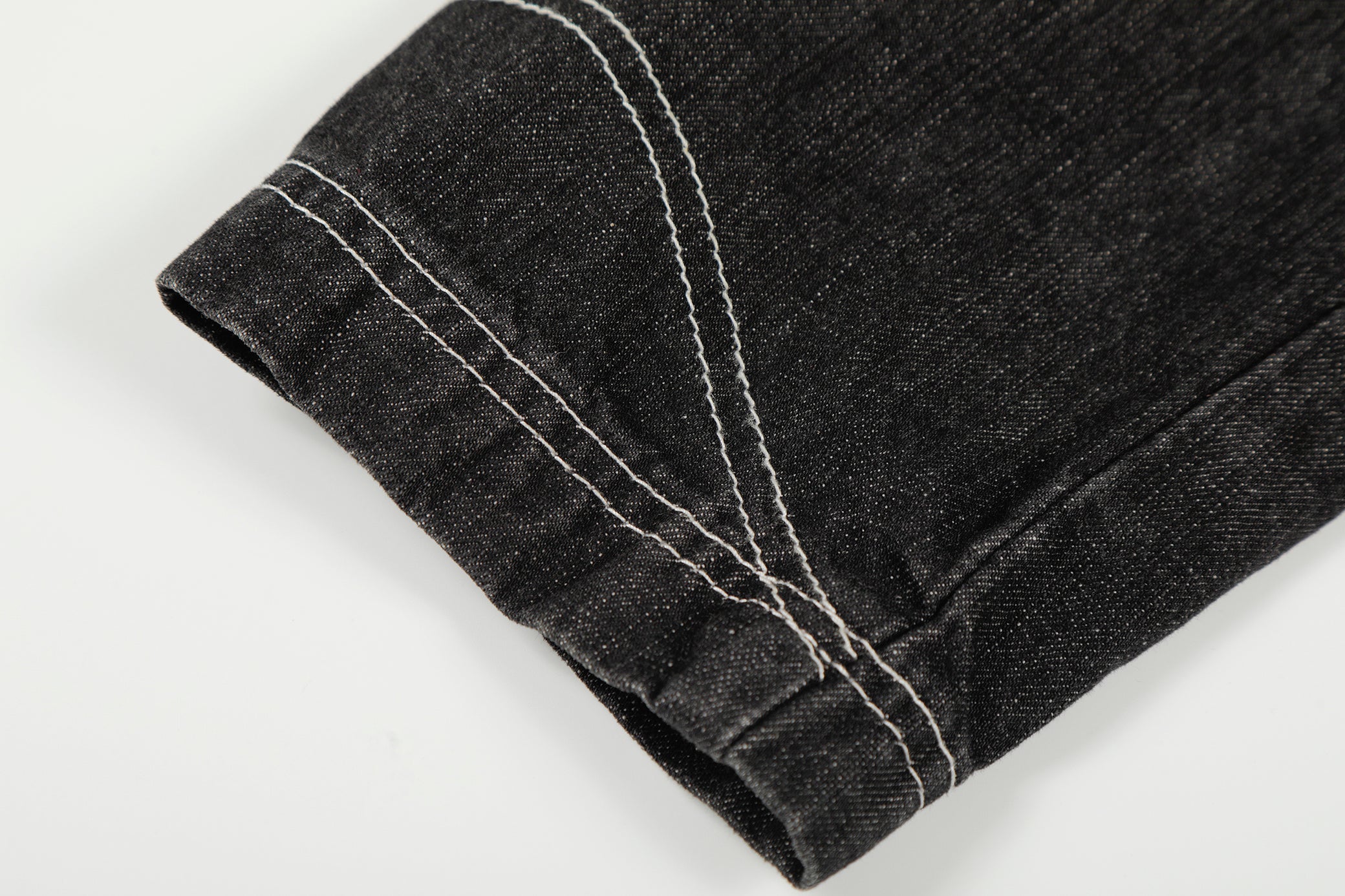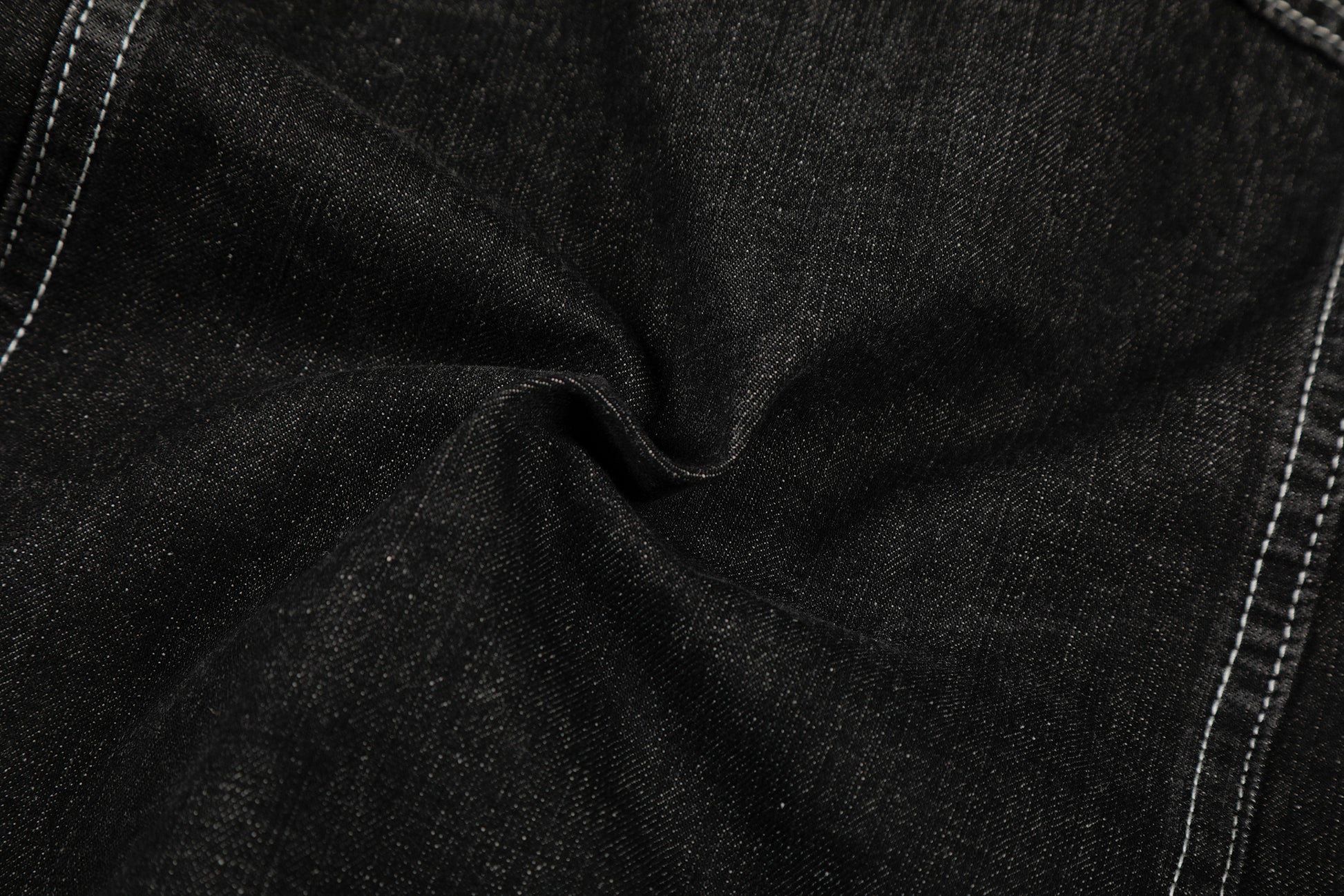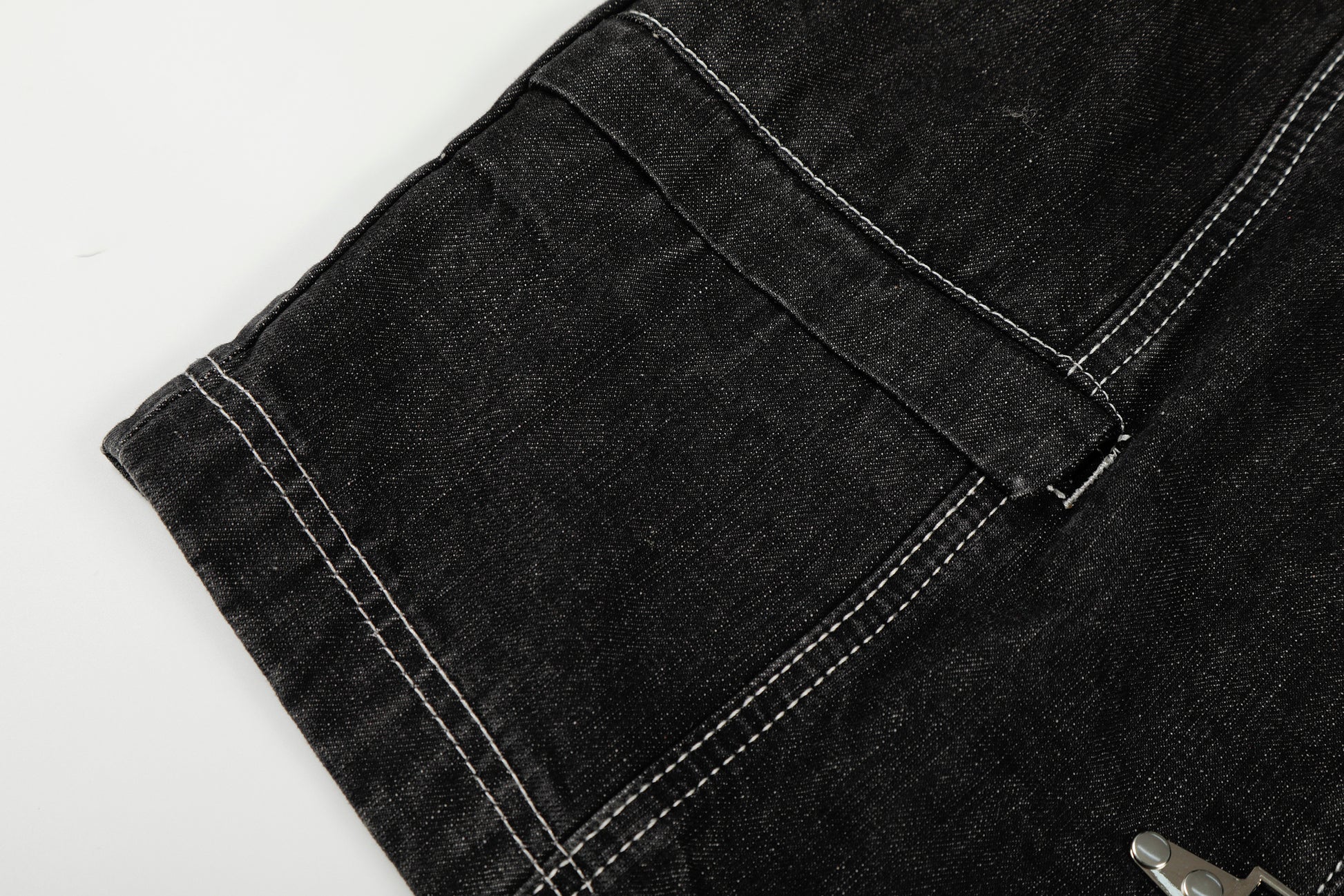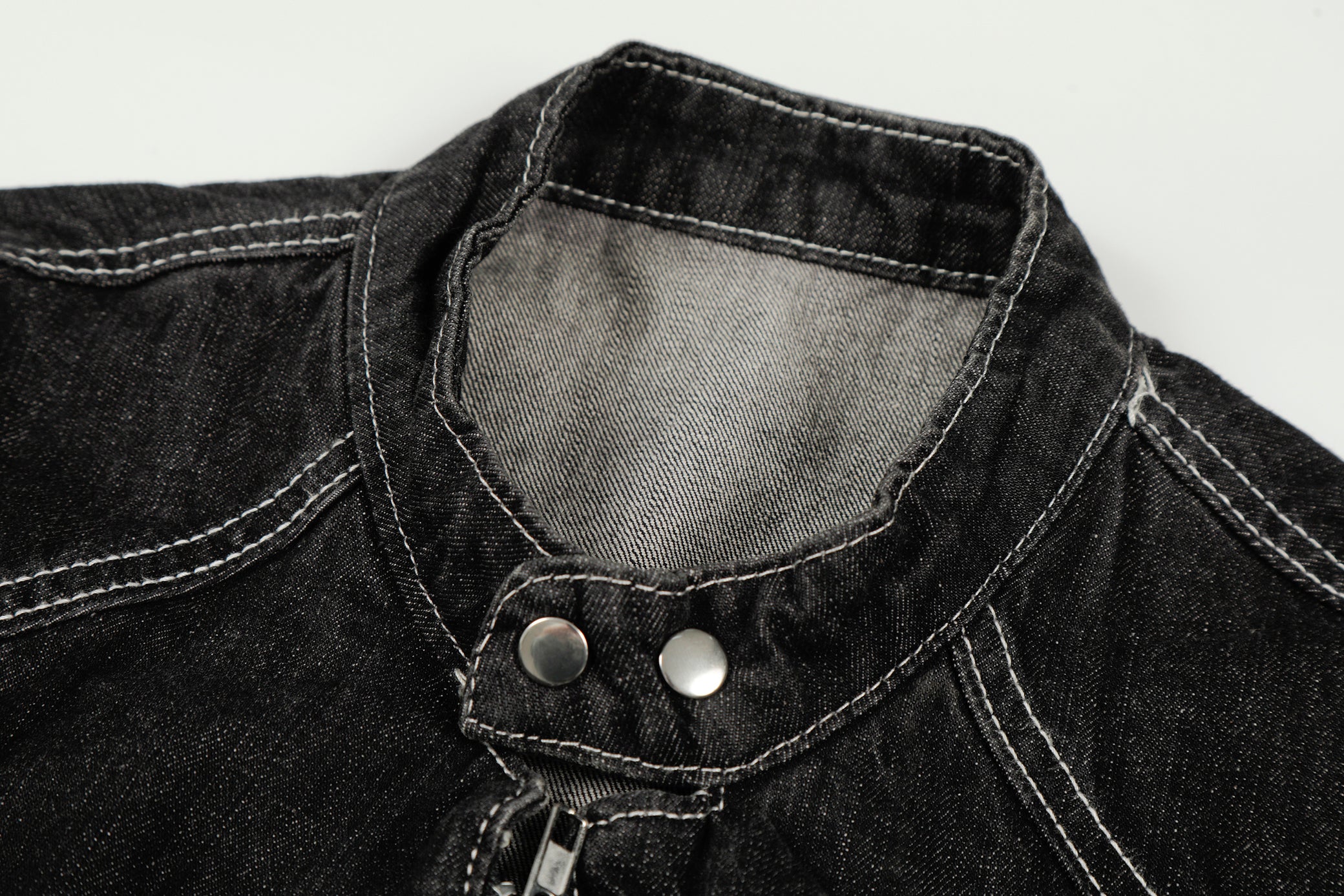Clothing details: Front metal buckle closures, contrast stitching, cropped workwear silhouette, washed black denim, adjustable sleeve cuffs