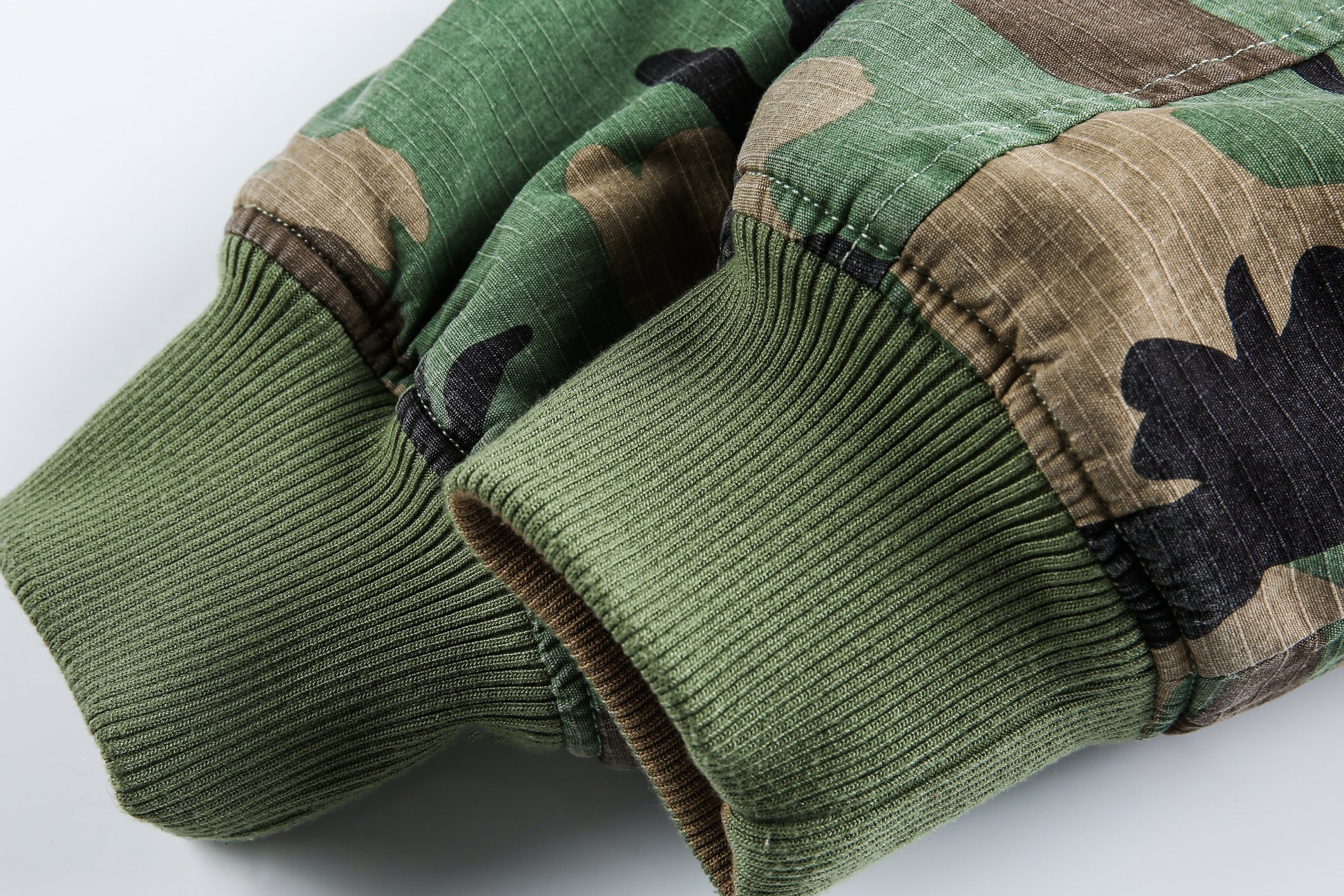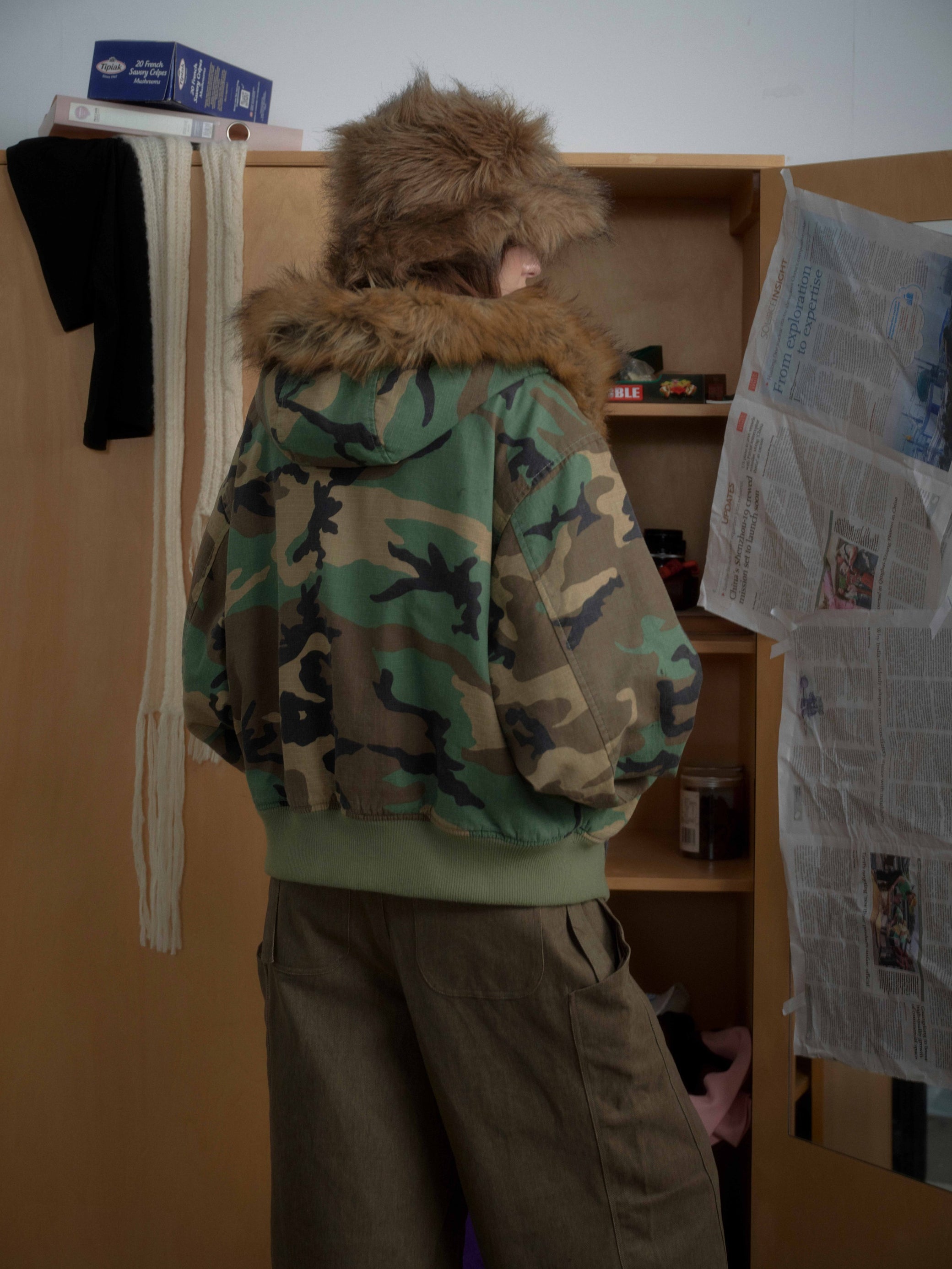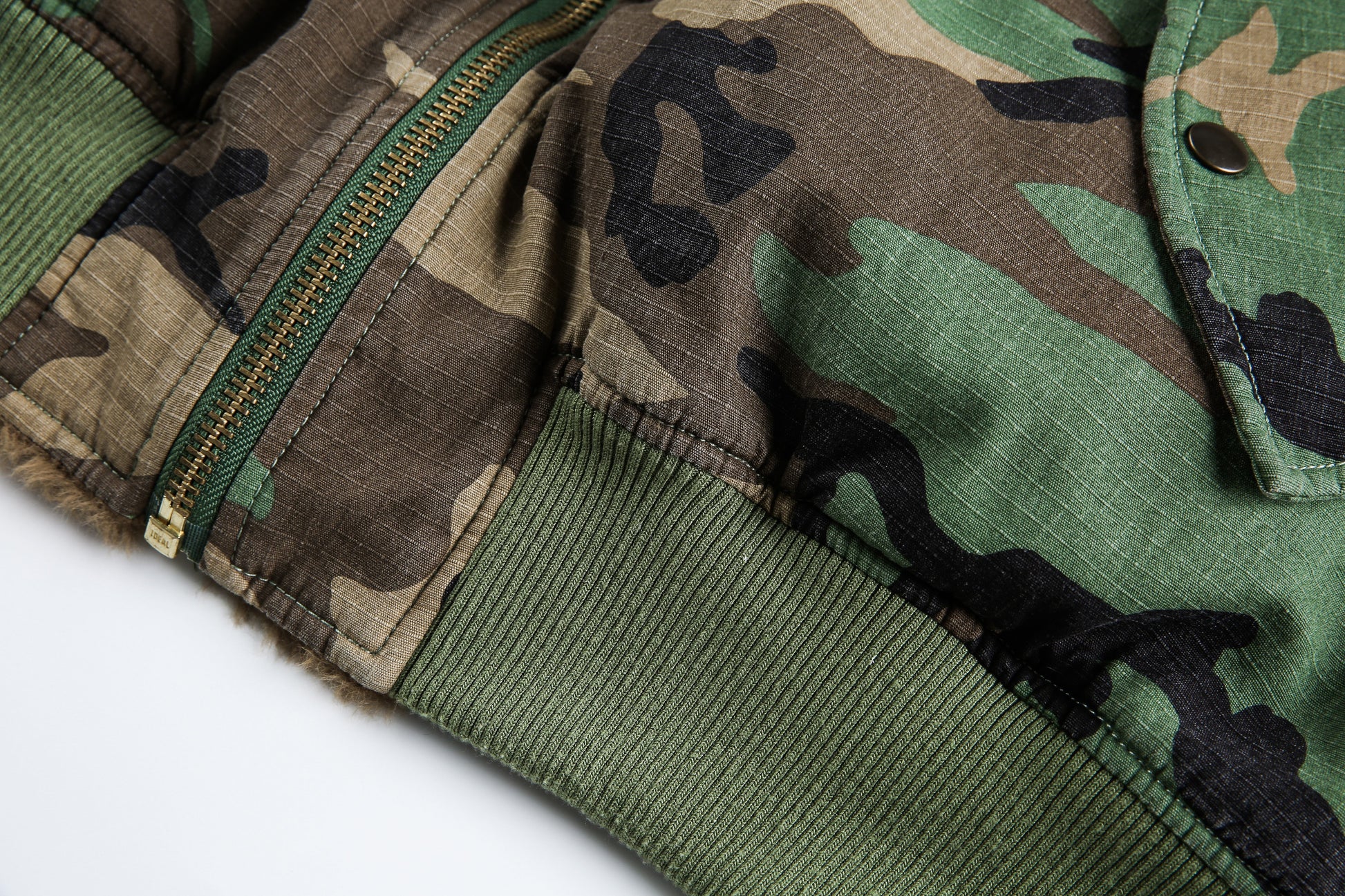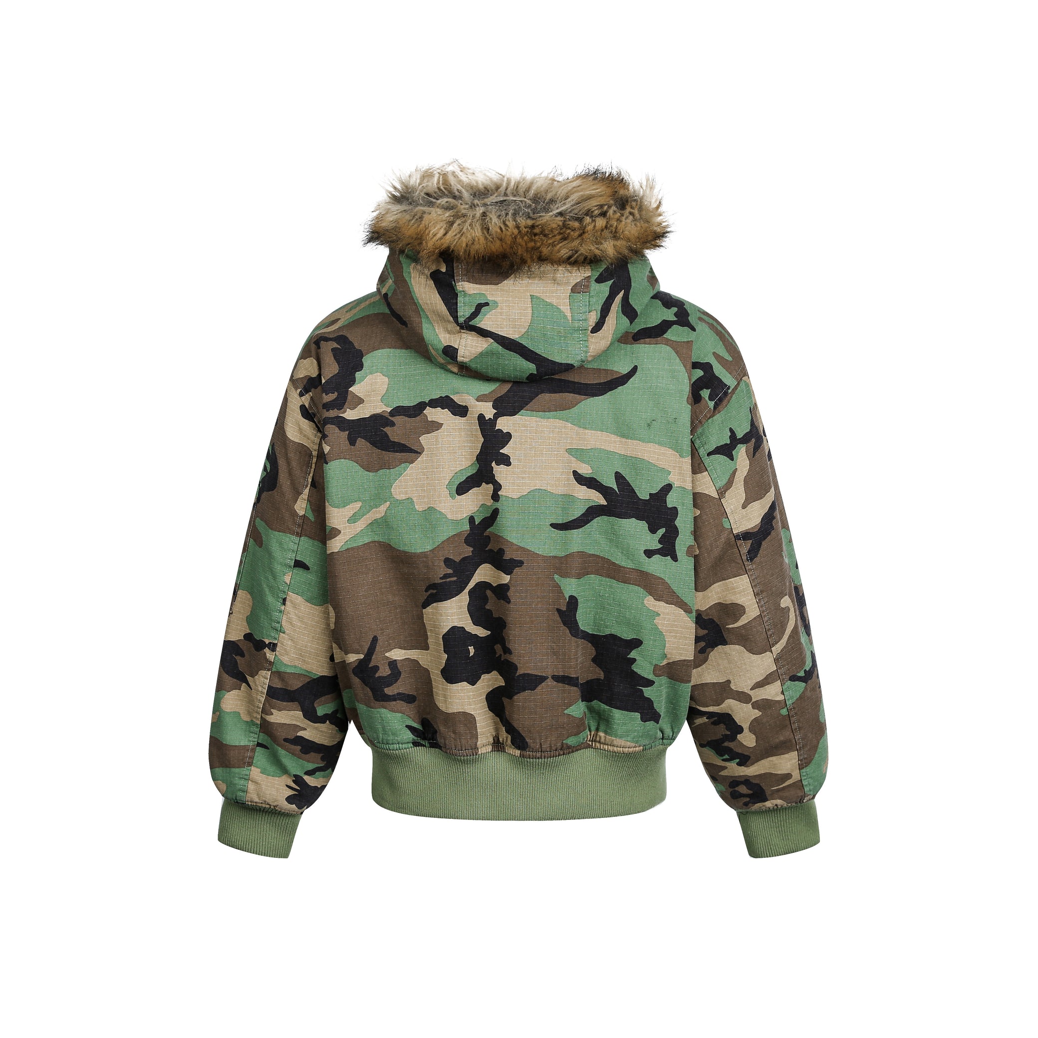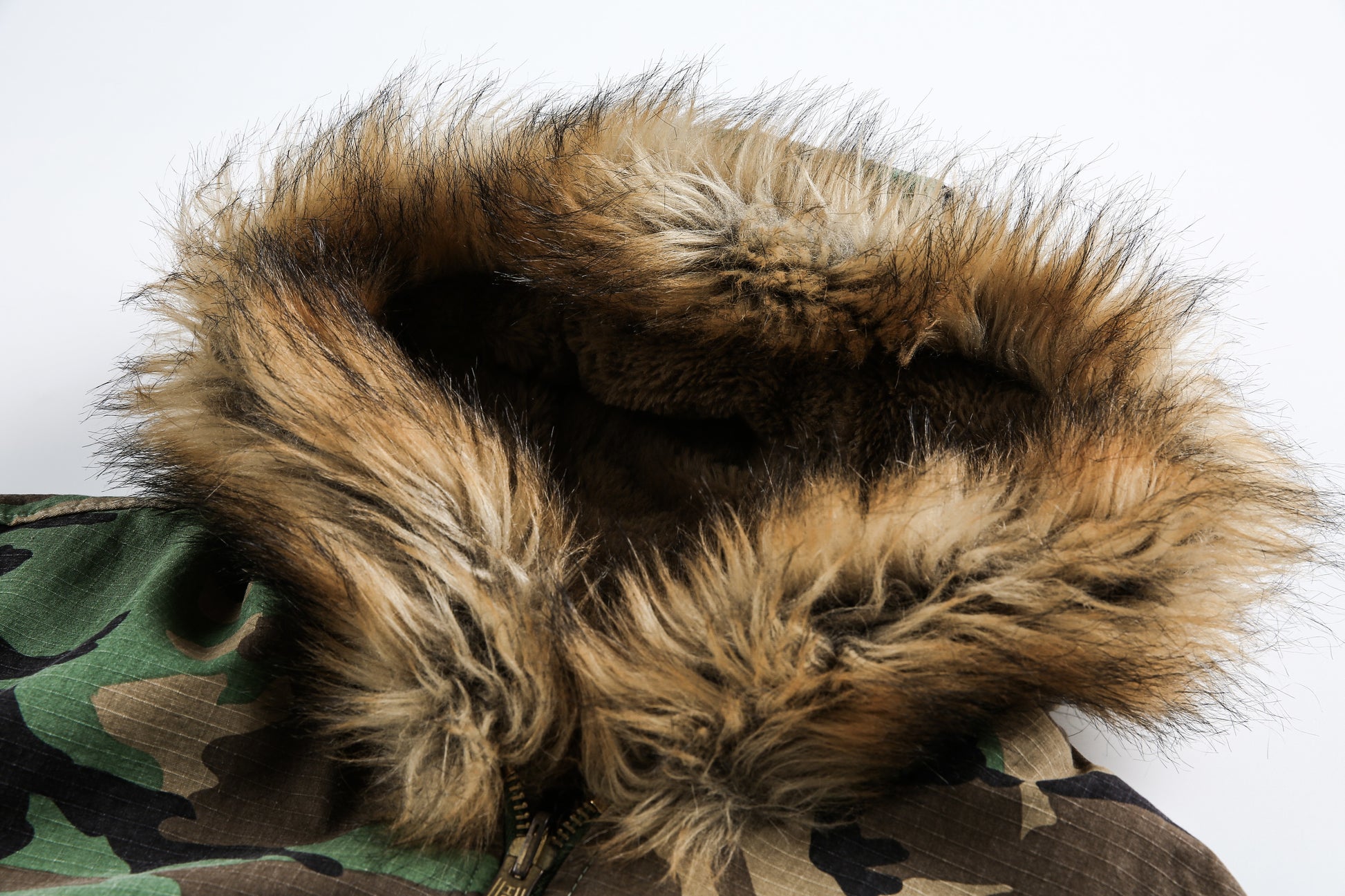 Clothing details: Detachable faux-fur hood, ribbed cuffs and hem, front flap pockets, arm zipper pocket, zip-up closure, classic woodland camouflage pattern