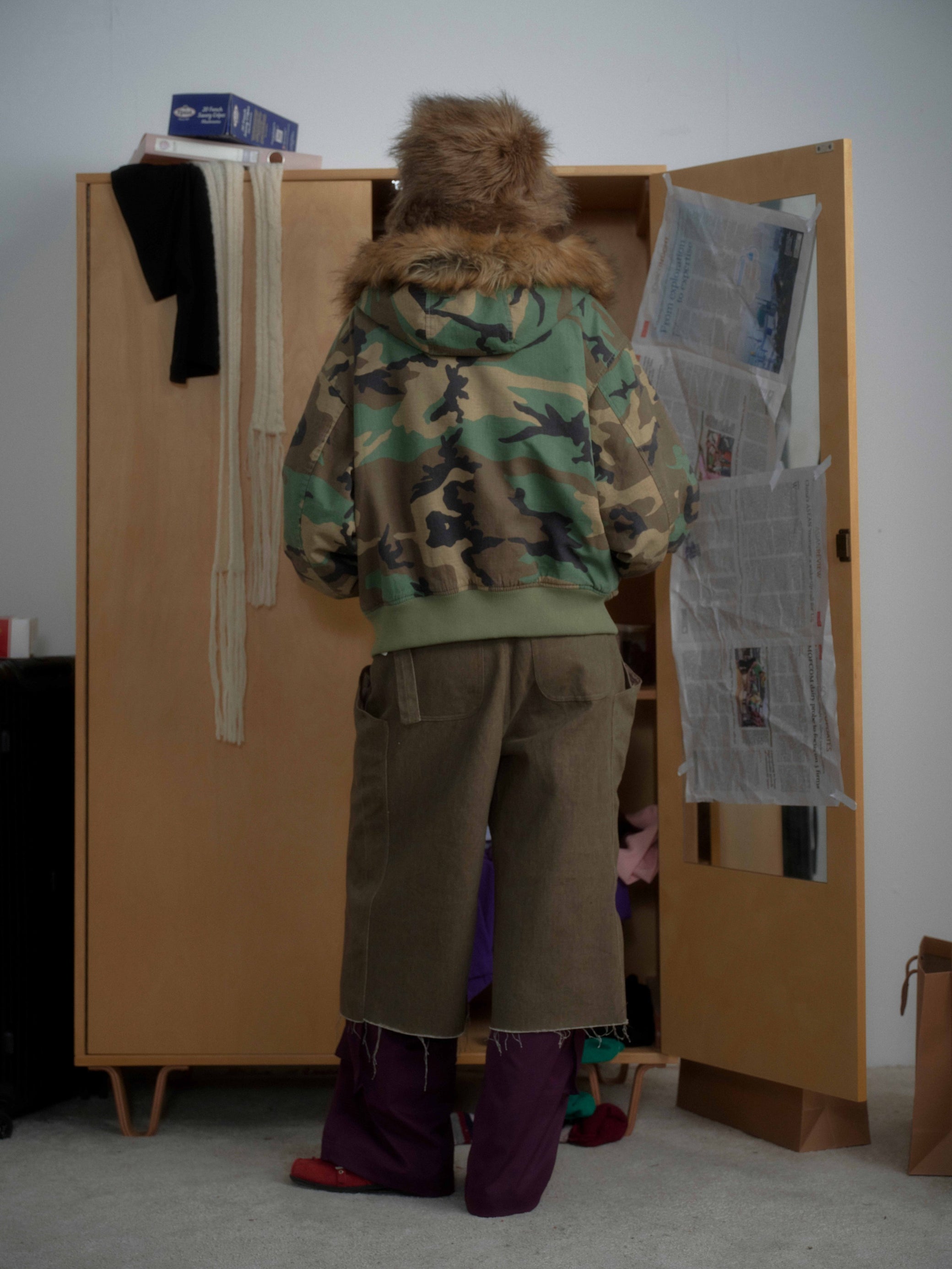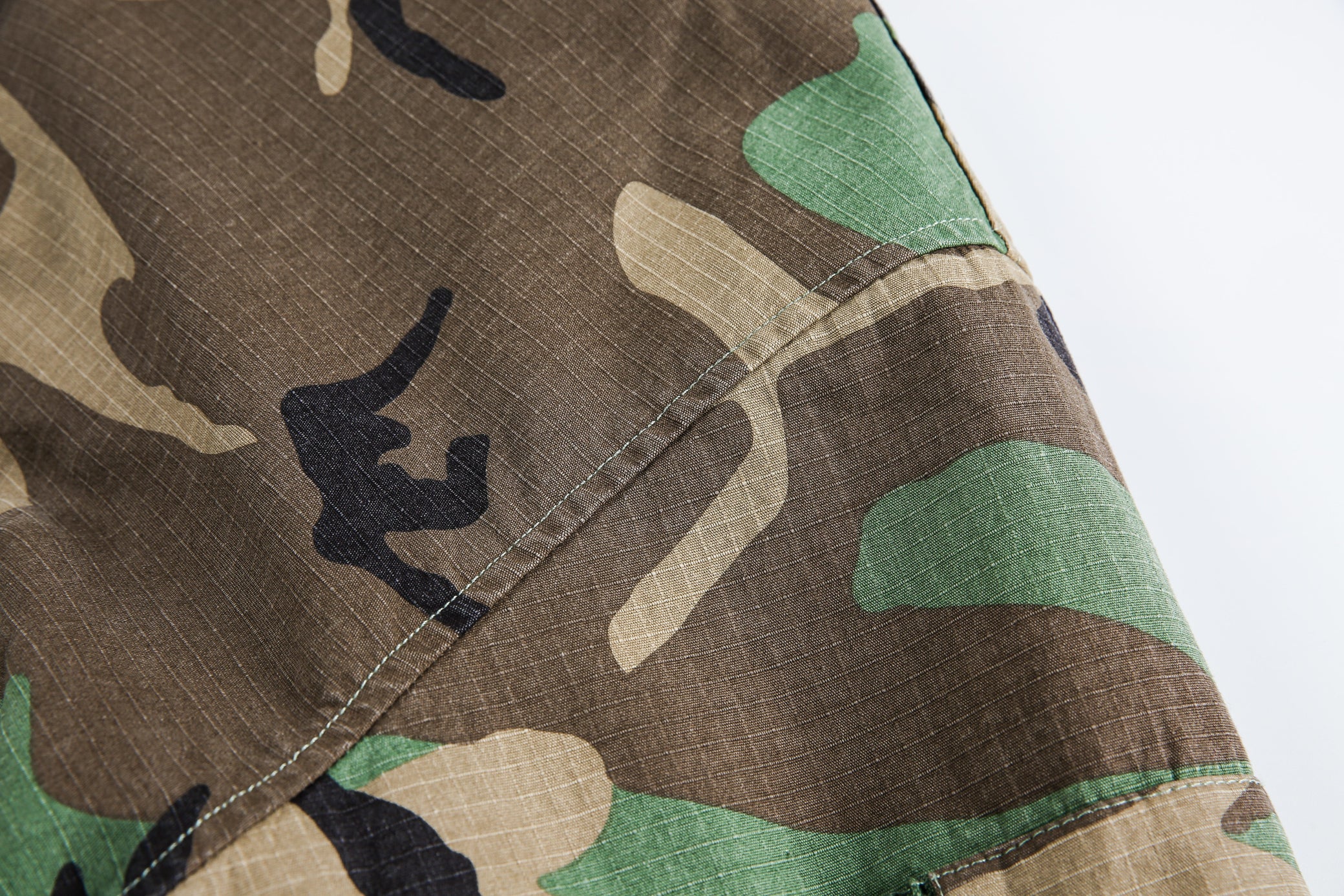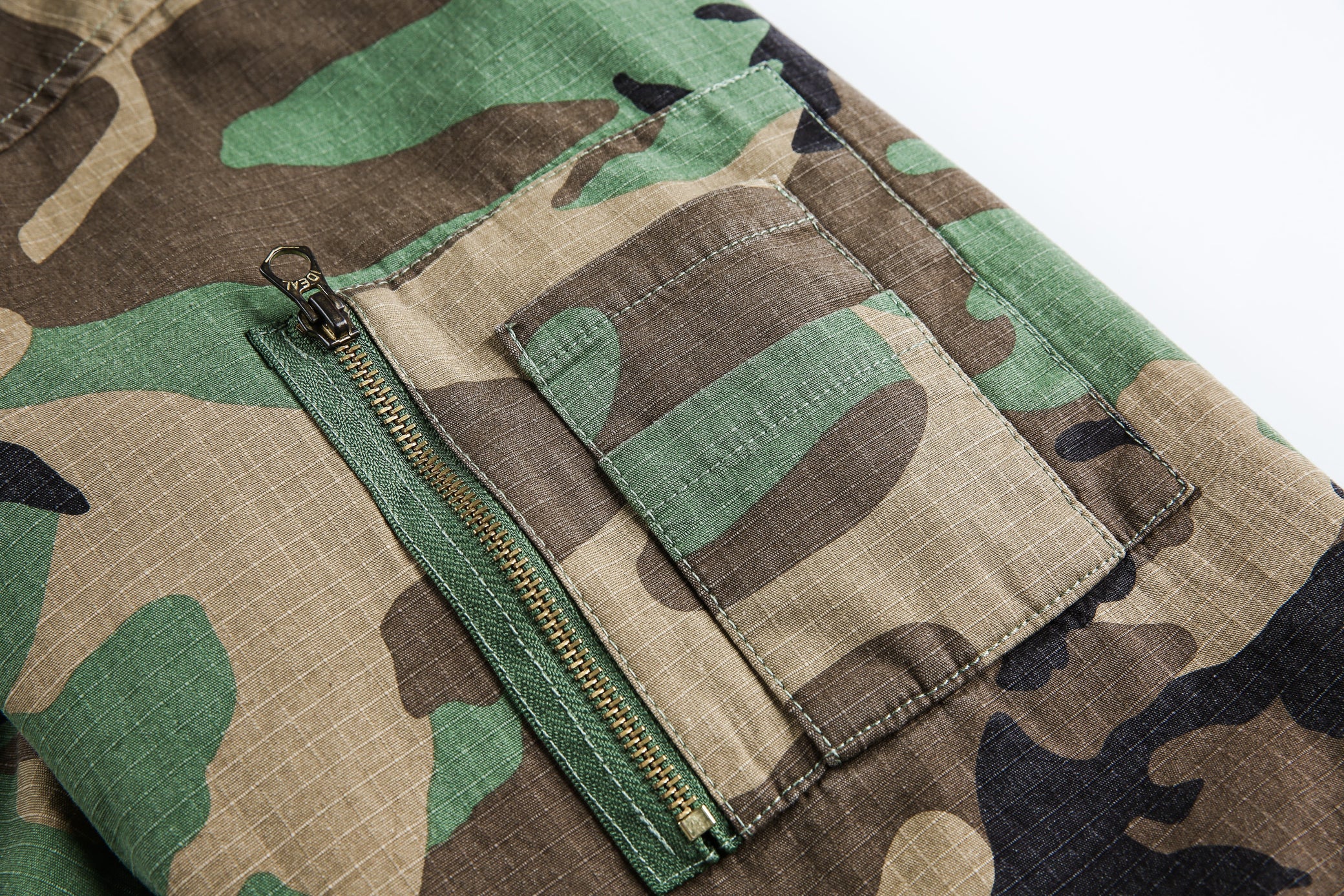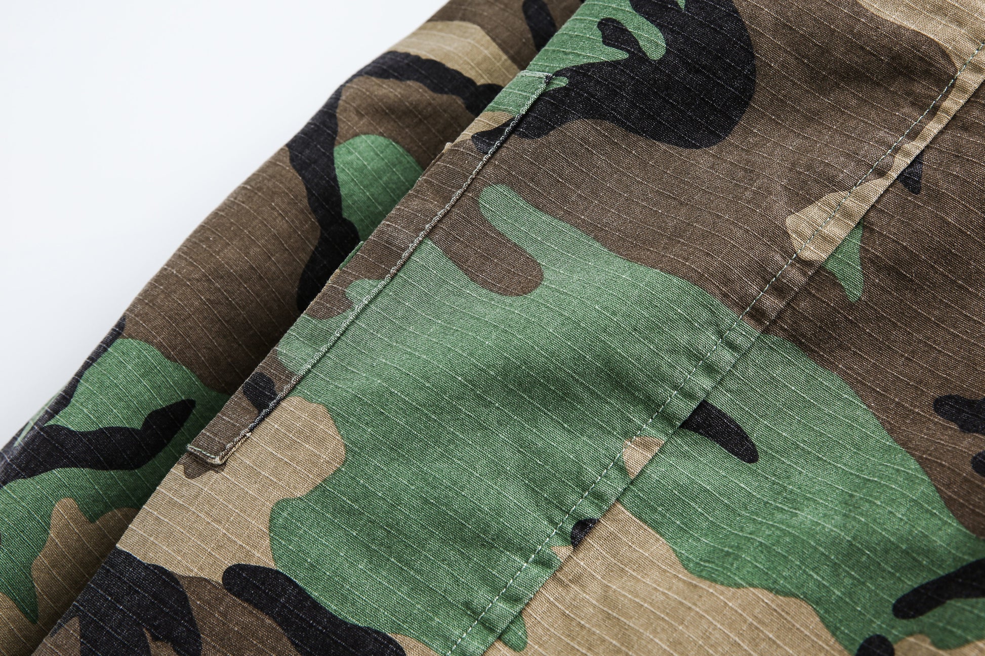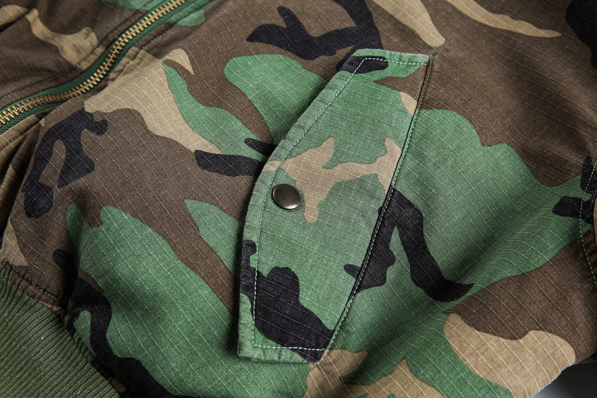 Clothing details: Detachable faux-fur hood, ribbed cuffs and hem, front flap pockets, arm zipper pocket, zip-up closure, classic woodland camouflage pattern