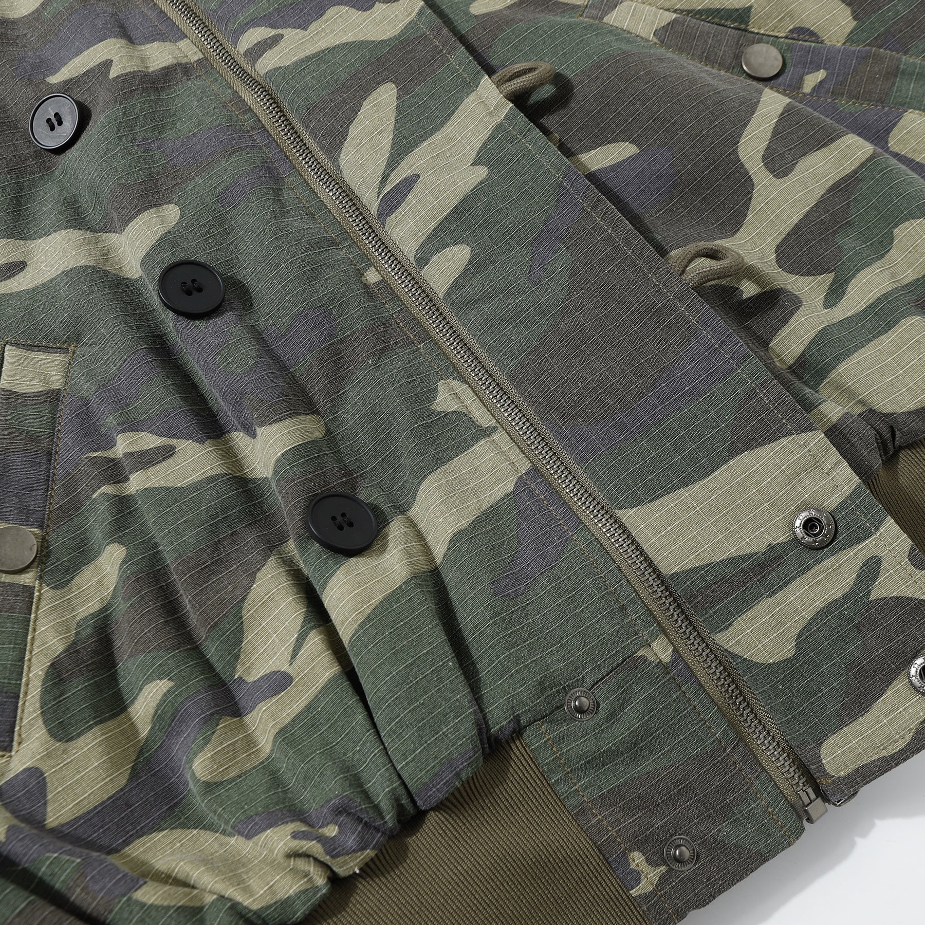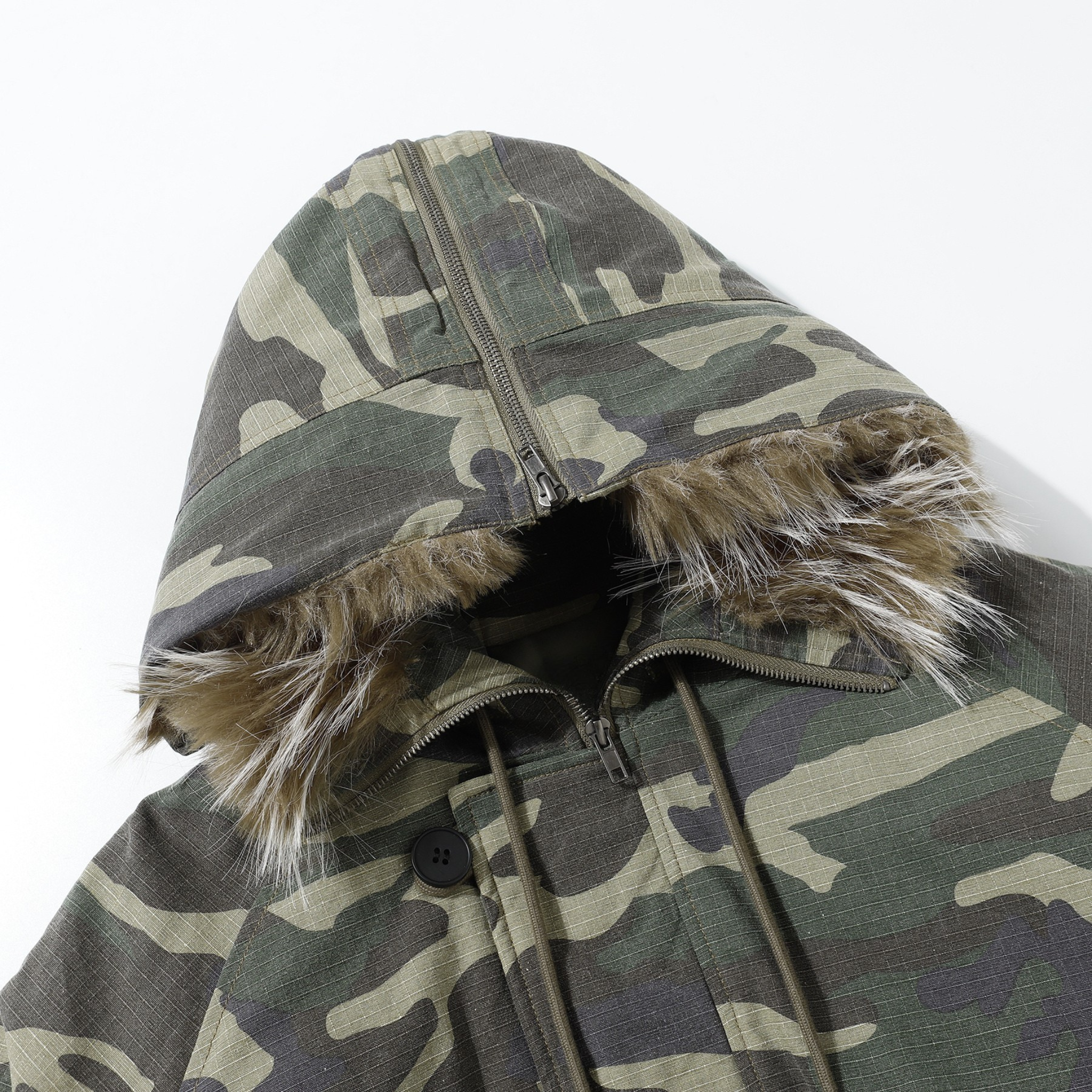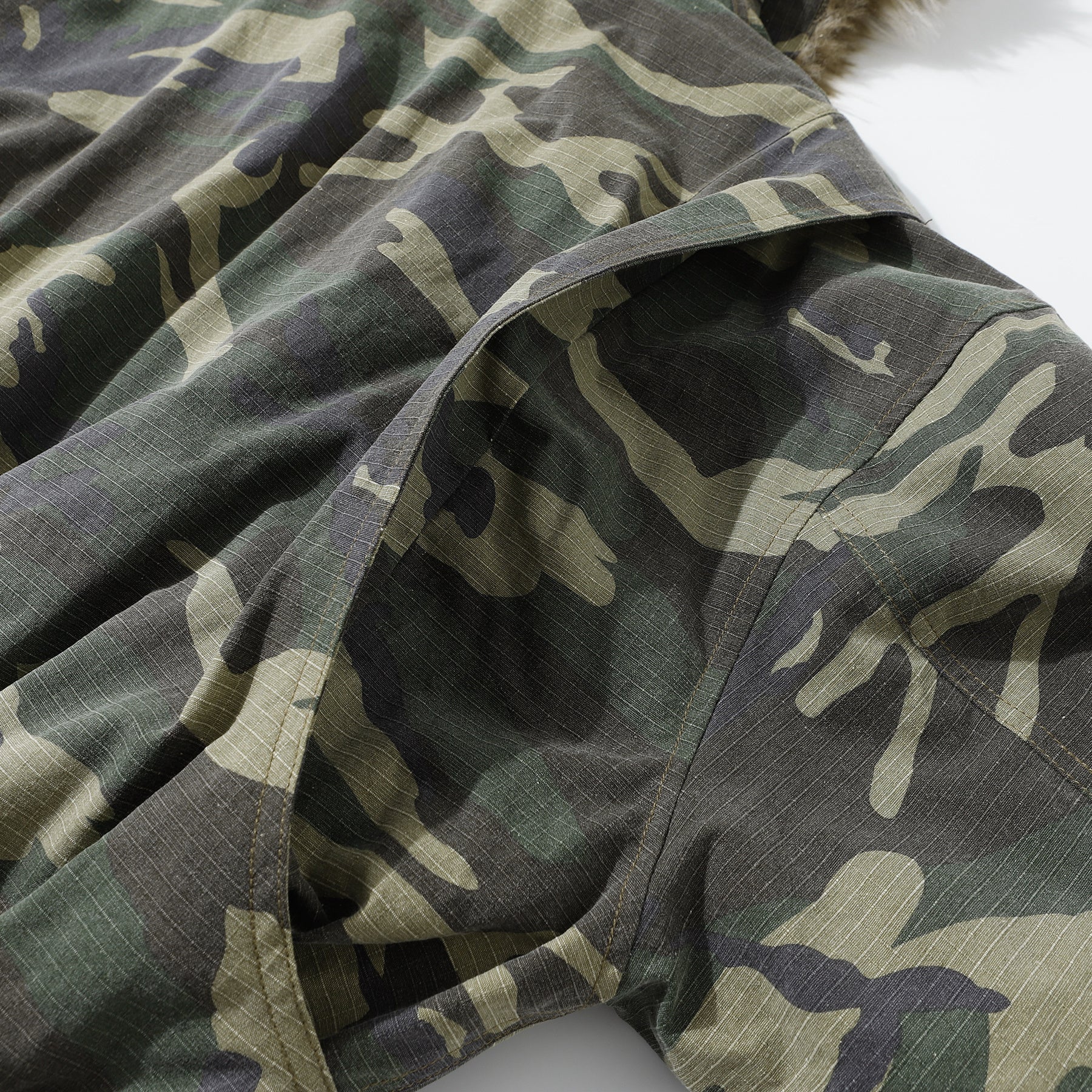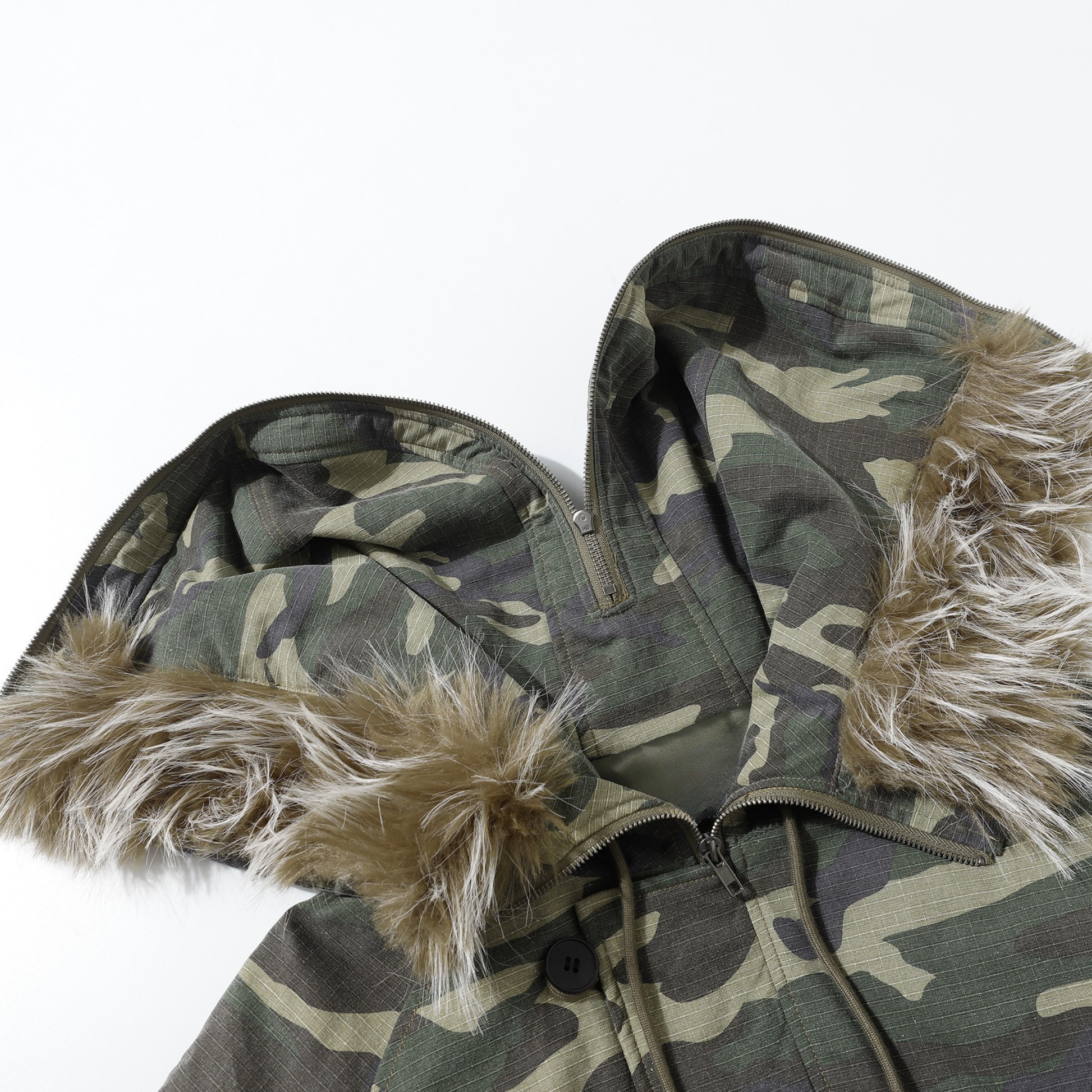 Clothing Details: Camouflage print, detachable faux fur hood, cropped puffer silhouette, button and zip closure, elastic hem and cuffs, utility sleeve pocket