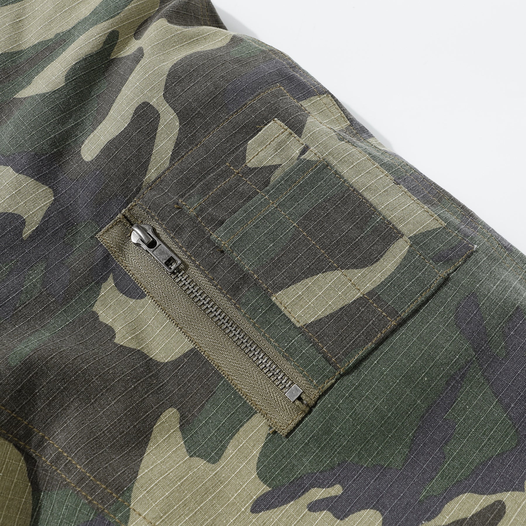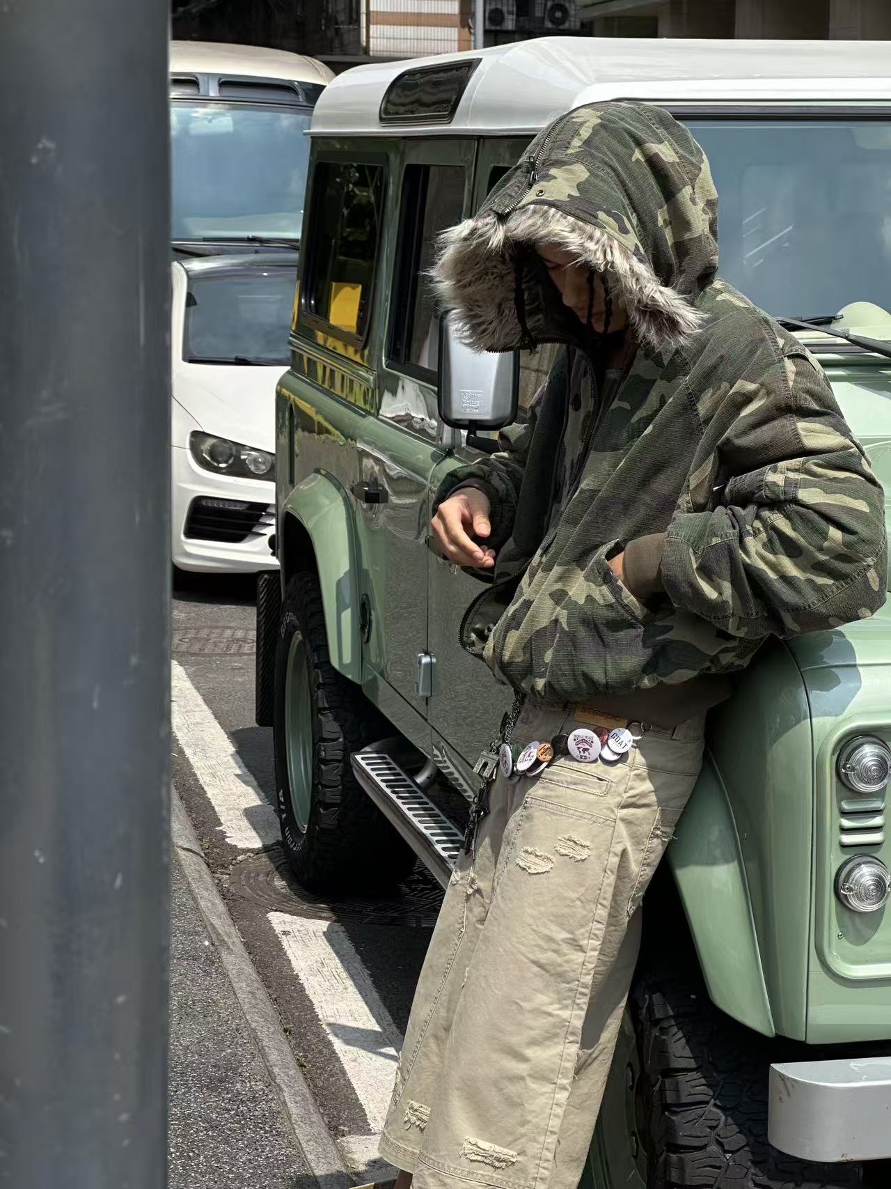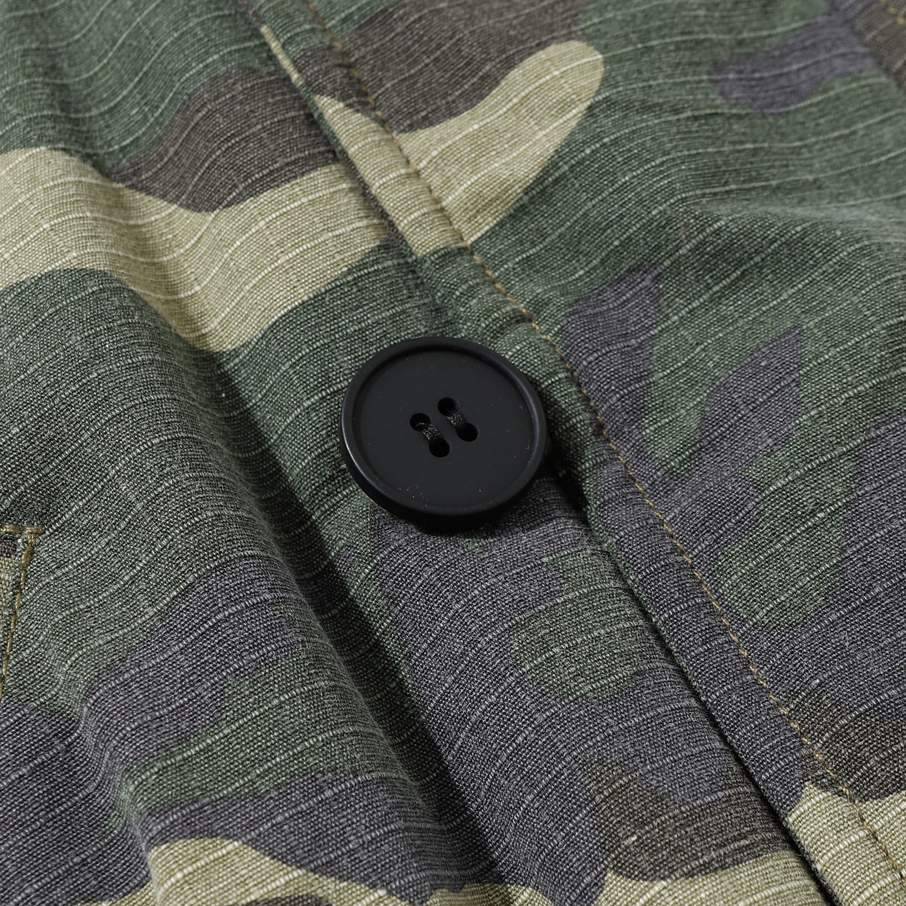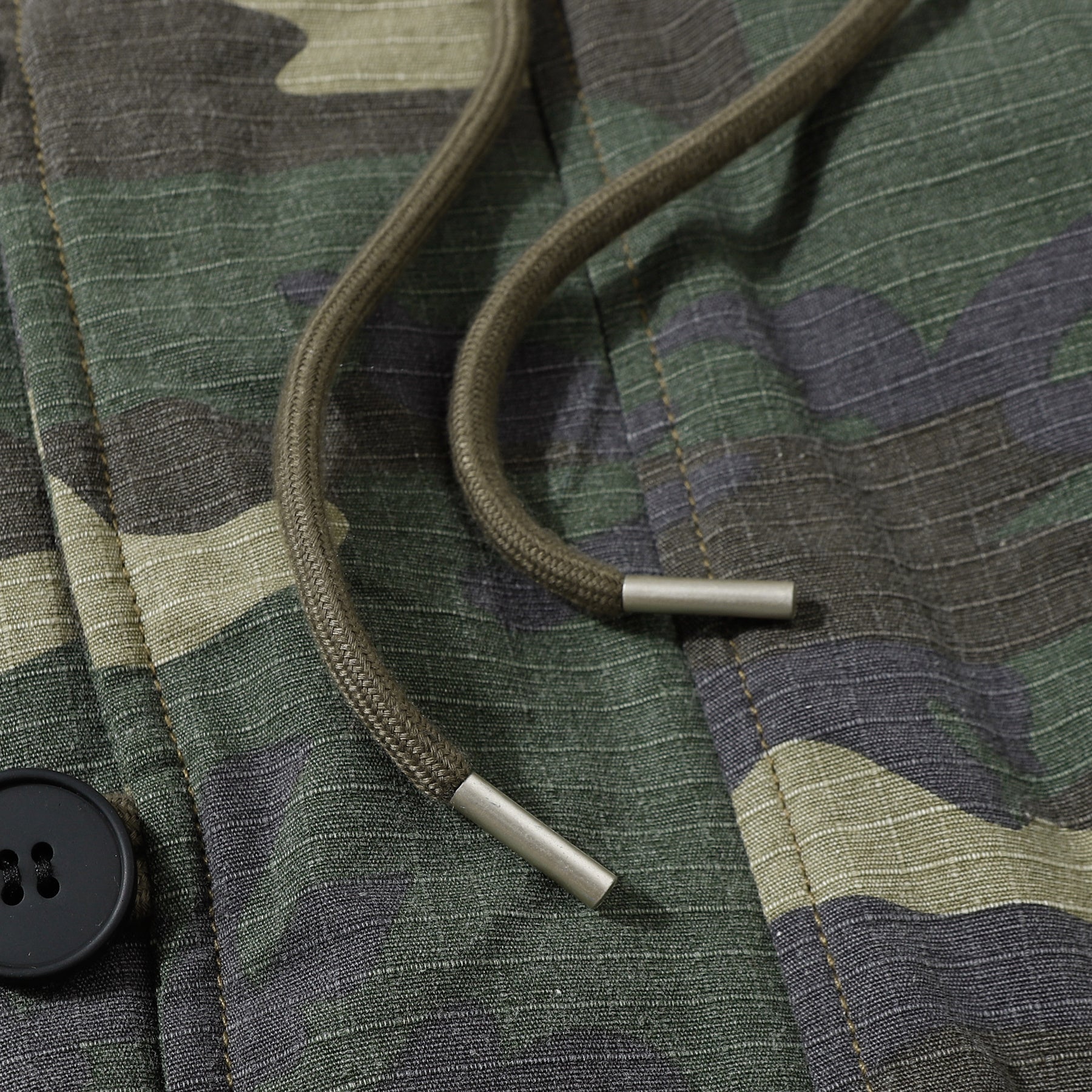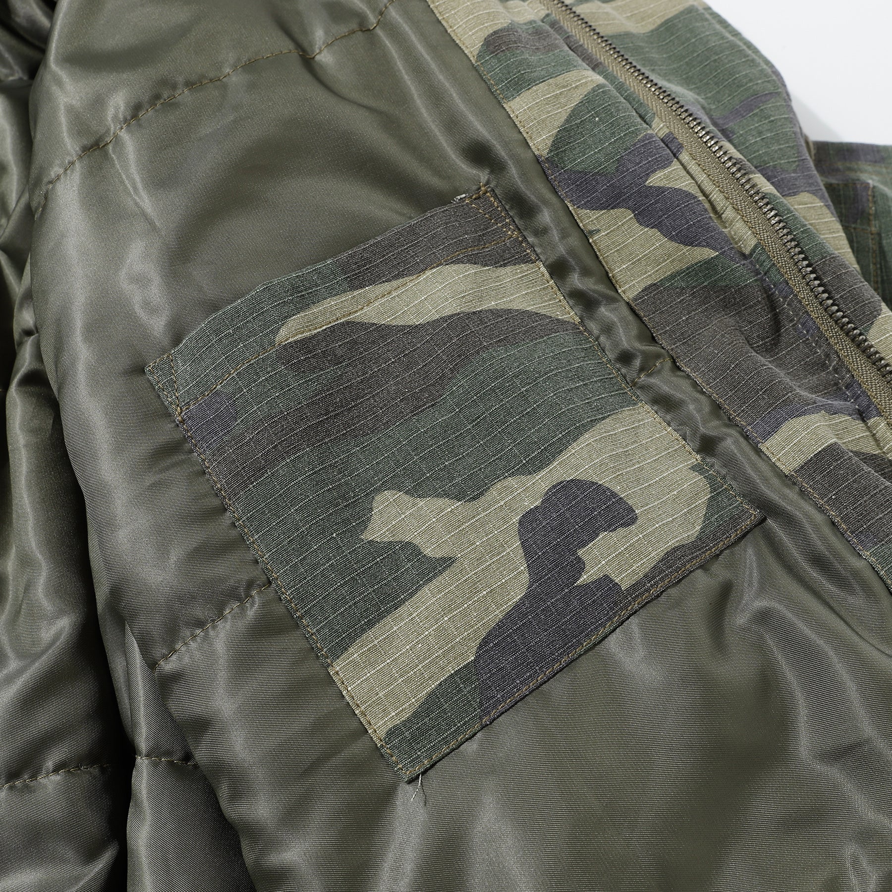 Clothing Details: Camouflage print, detachable faux fur hood, cropped puffer silhouette, button and zip closure, elastic hem and cuffs, utility sleeve pocket