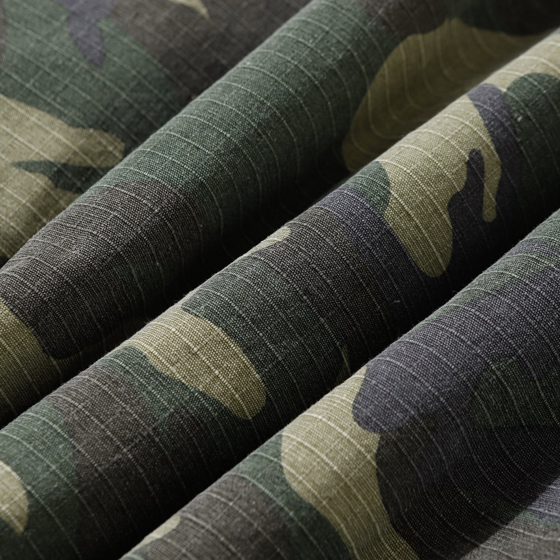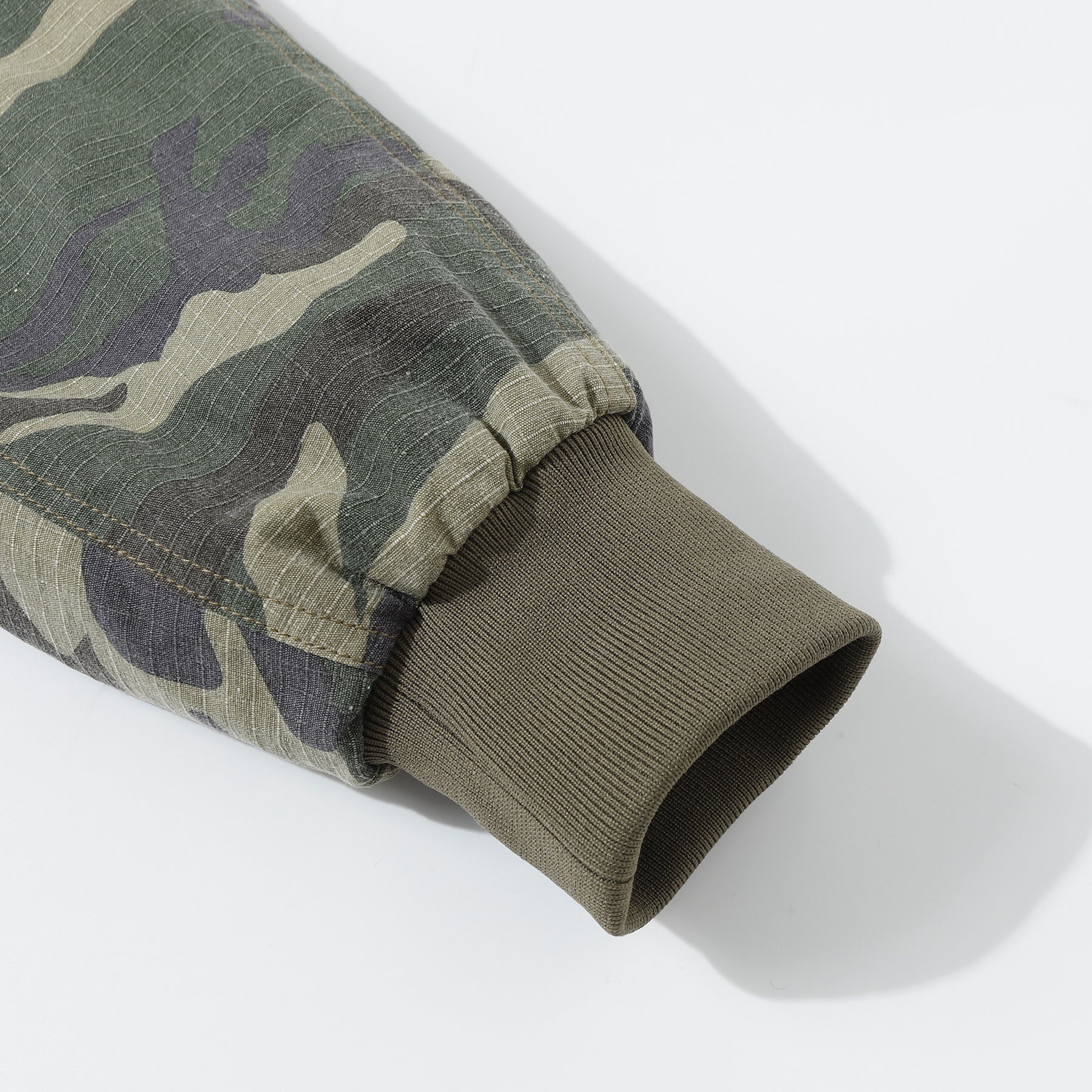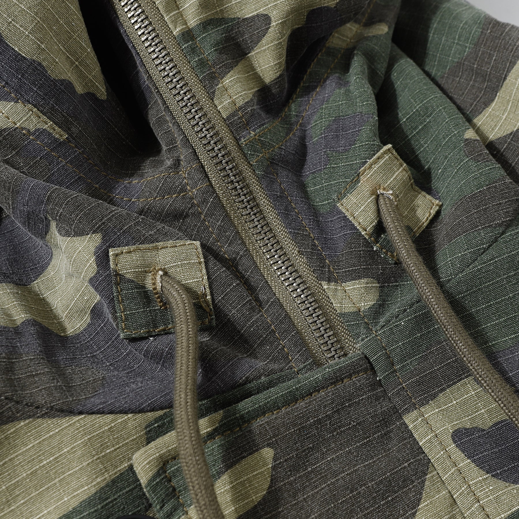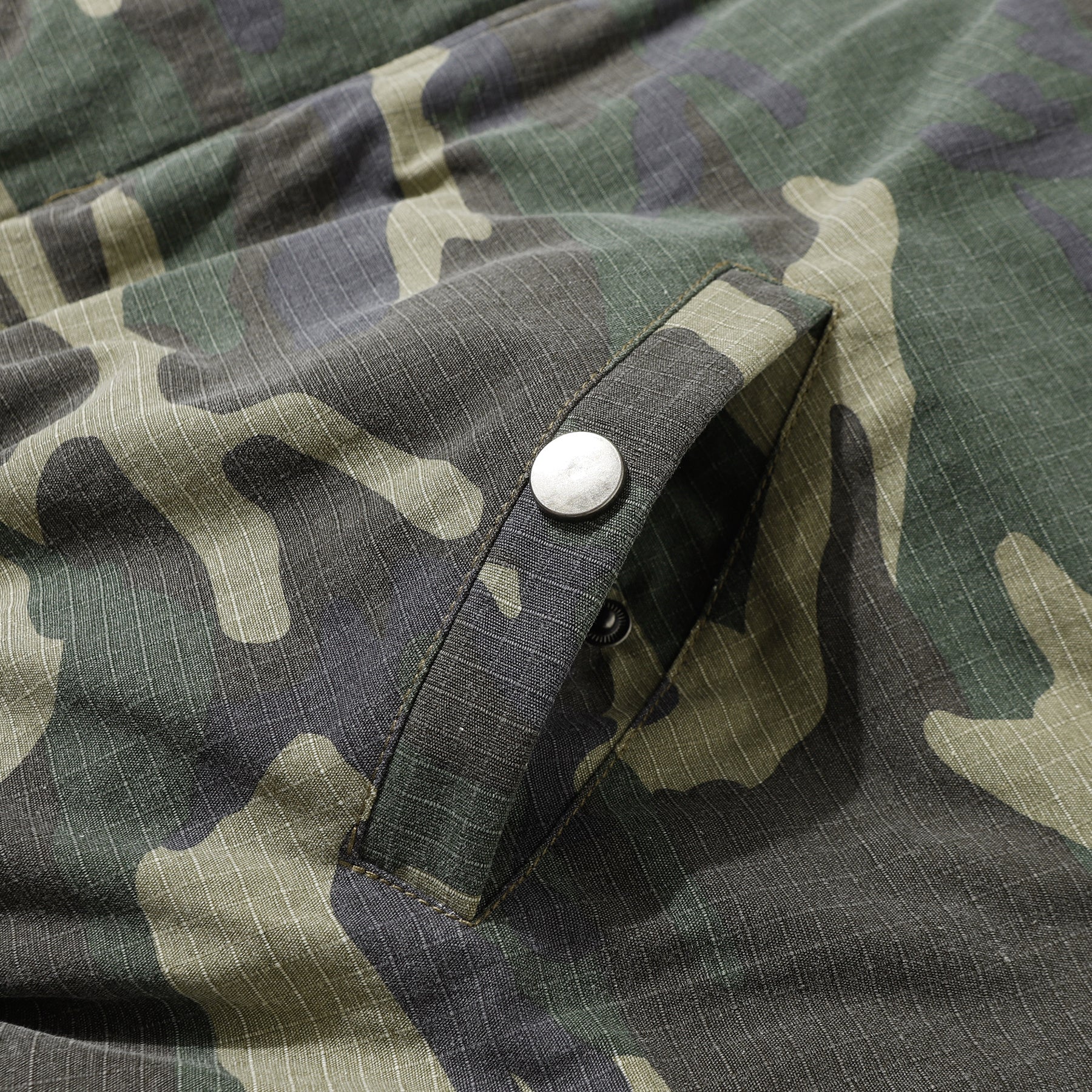 Clothing Details: Camouflage print, detachable faux fur hood, cropped puffer silhouette, button and zip closure, elastic hem and cuffs, utility sleeve pocket