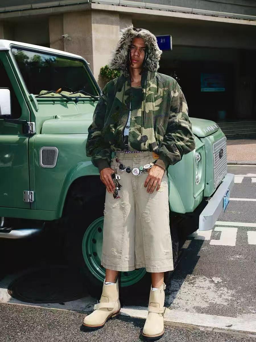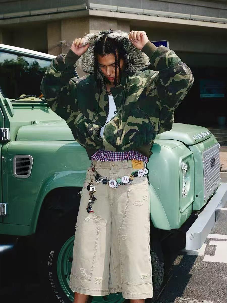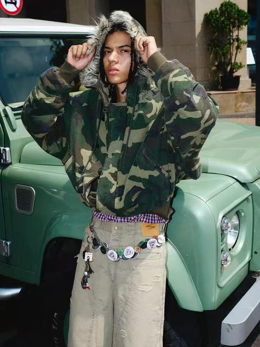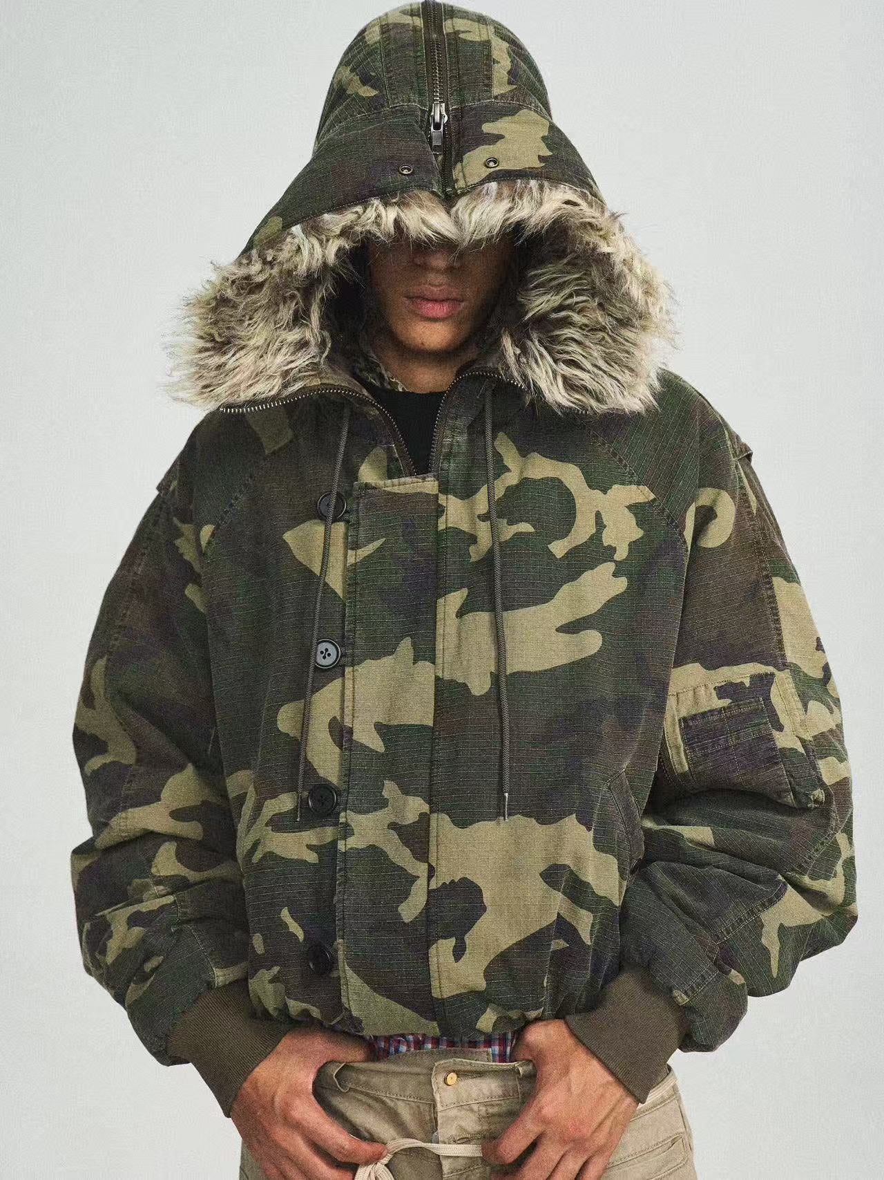 The Omirad Camo Faux Fur Hooded Puffer Jacket brings rugged military styling into modern streetwear. Made from durable cotton fabric, it features a bold camouflage print and a detachable hood with faux fur trim for added warmth and texture. The cropped, voluminous silhouette enhances its street-ready appeal, while the button and zipper double closure ensures both protection and style. Perfect for cold-weather layering with a statement edge.