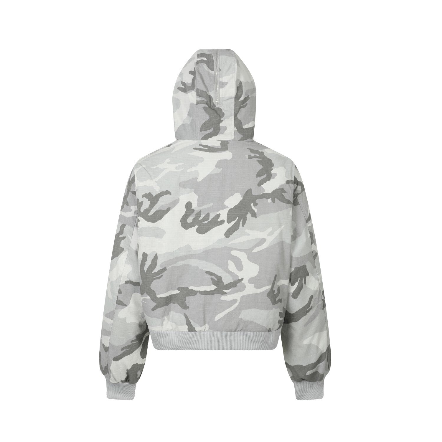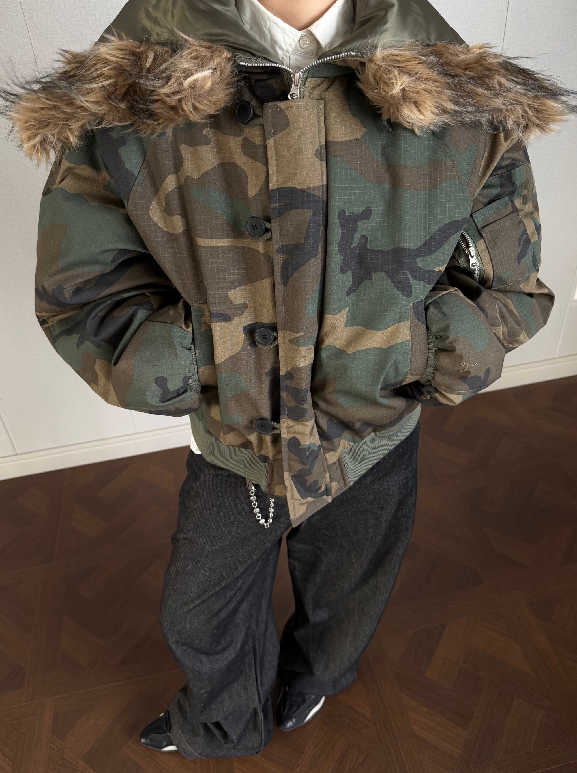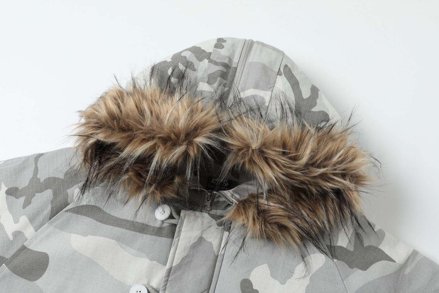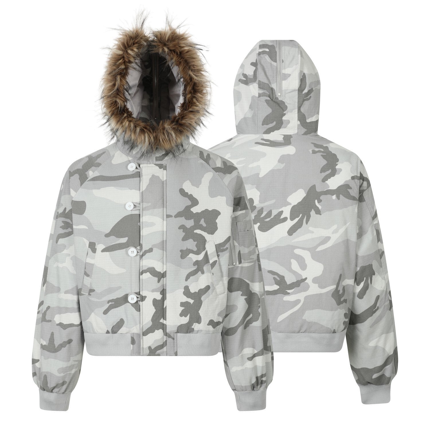 Clothing Details: Camouflage pattern, detachable faux fur hood trim, button + zipper closure, elastic cuffs and hem, sleeve utility pocket, bomber-length silhouette