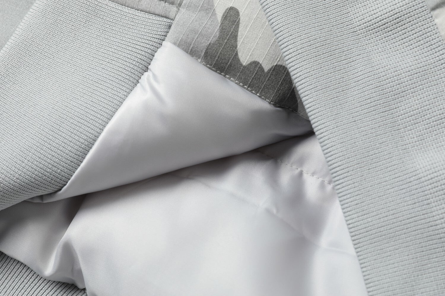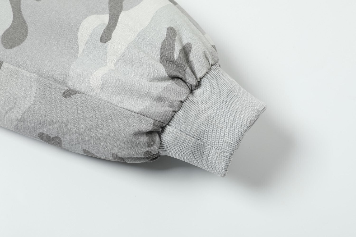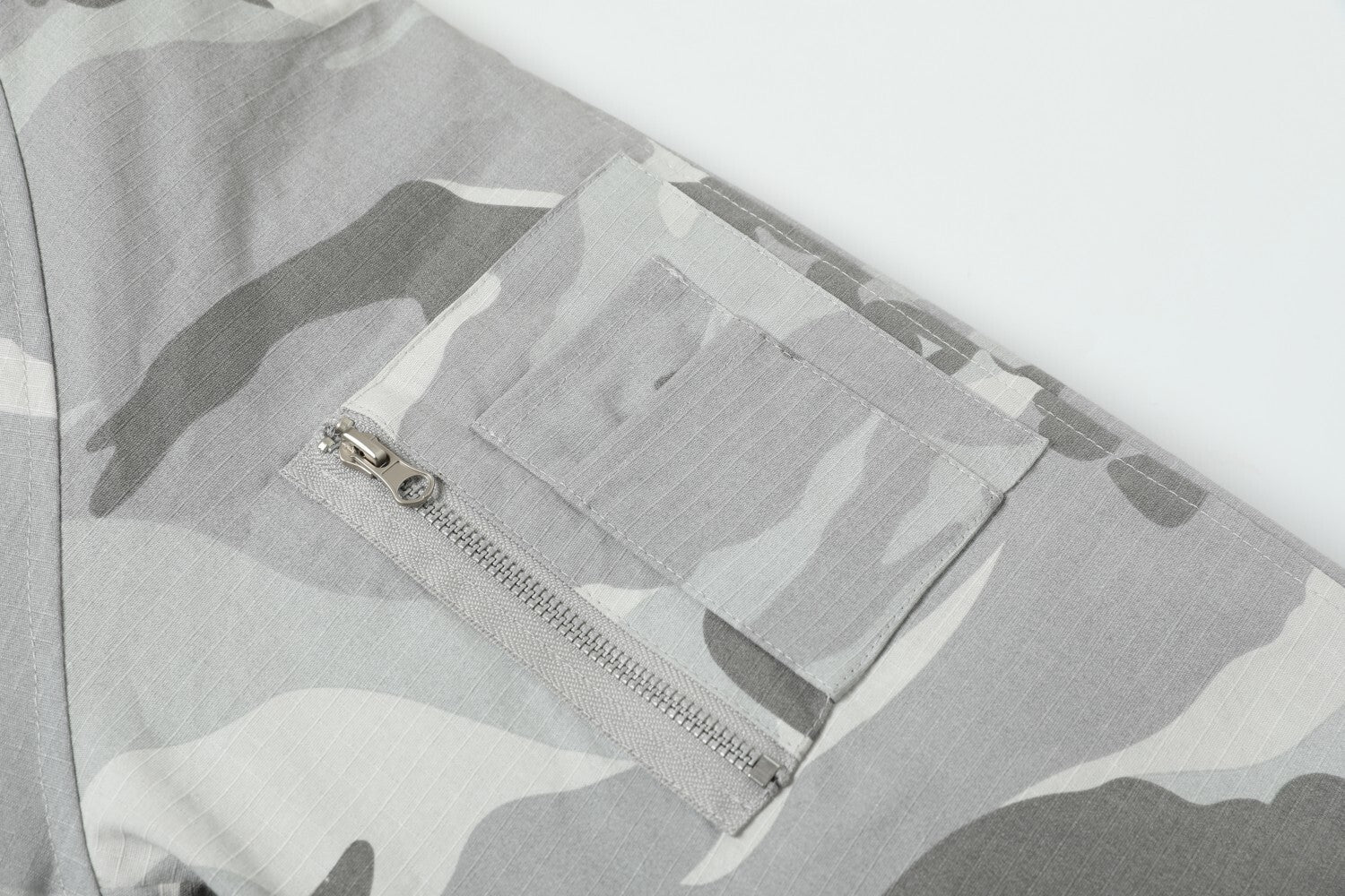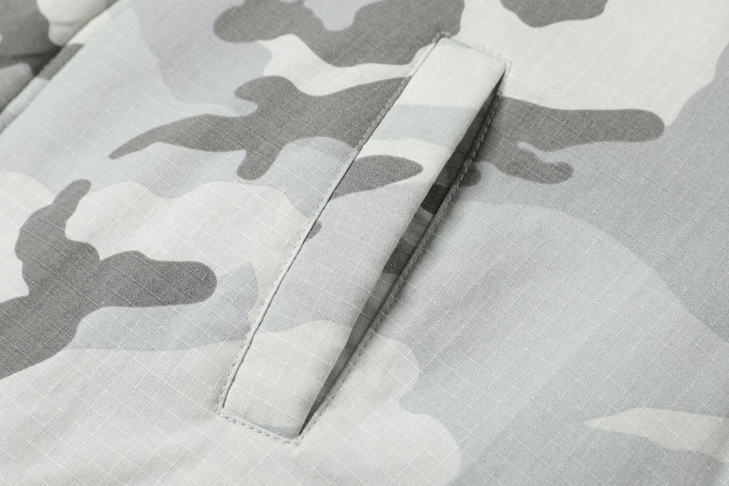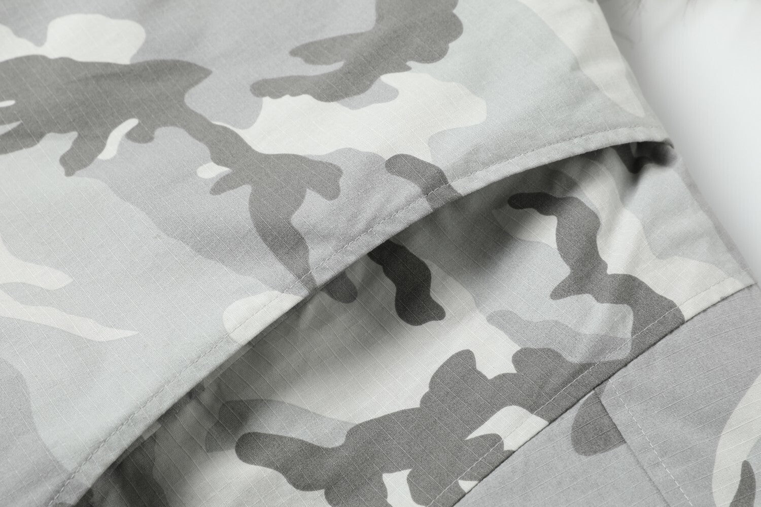 Clothing Details: Camouflage pattern, detachable faux fur hood trim, button + zipper closure, elastic cuffs and hem, sleeve utility pocket, bomber-length silhouette