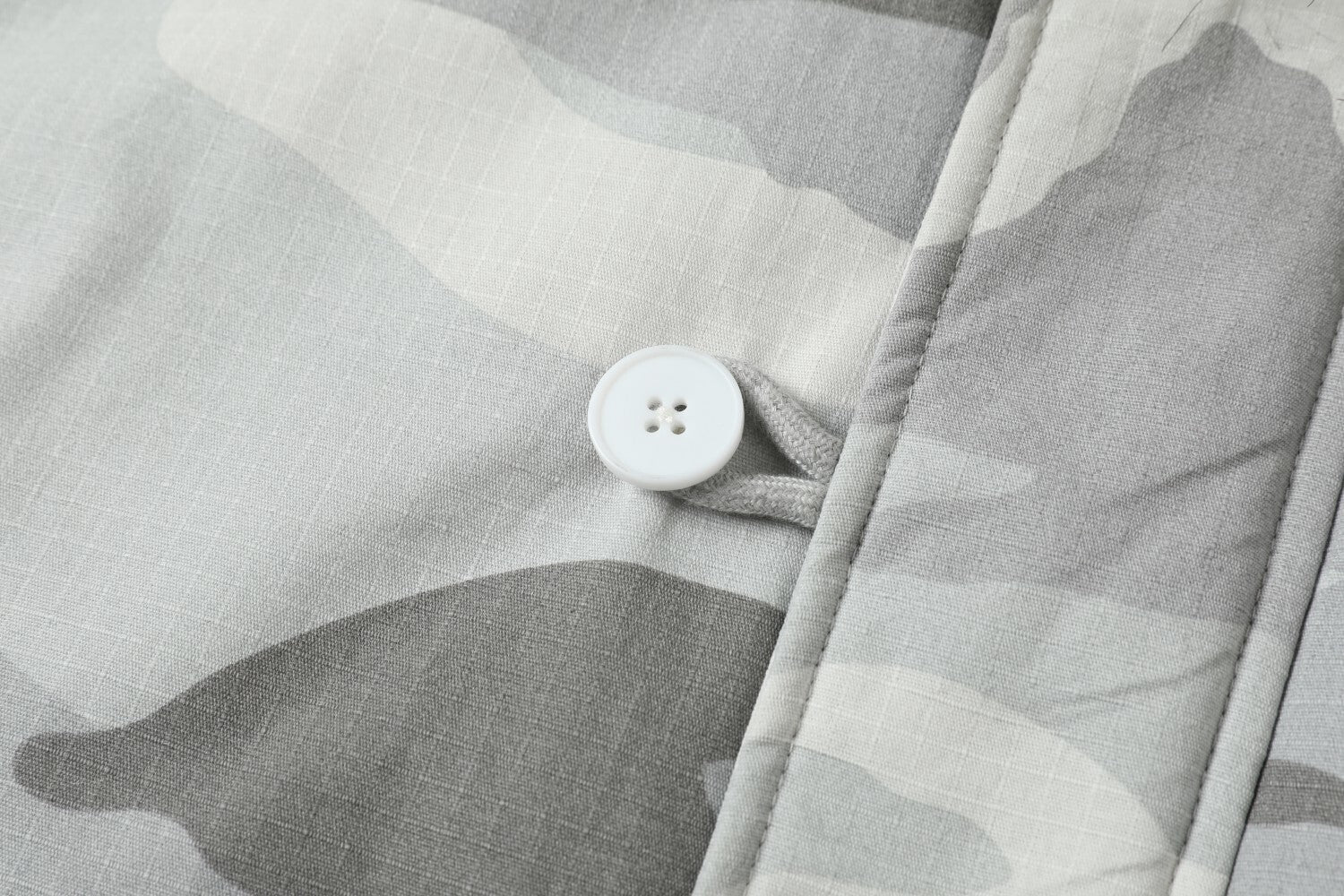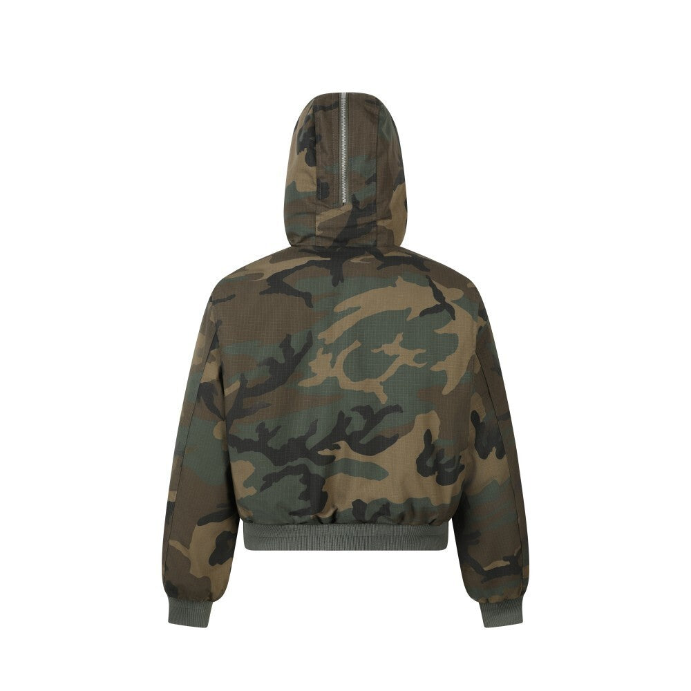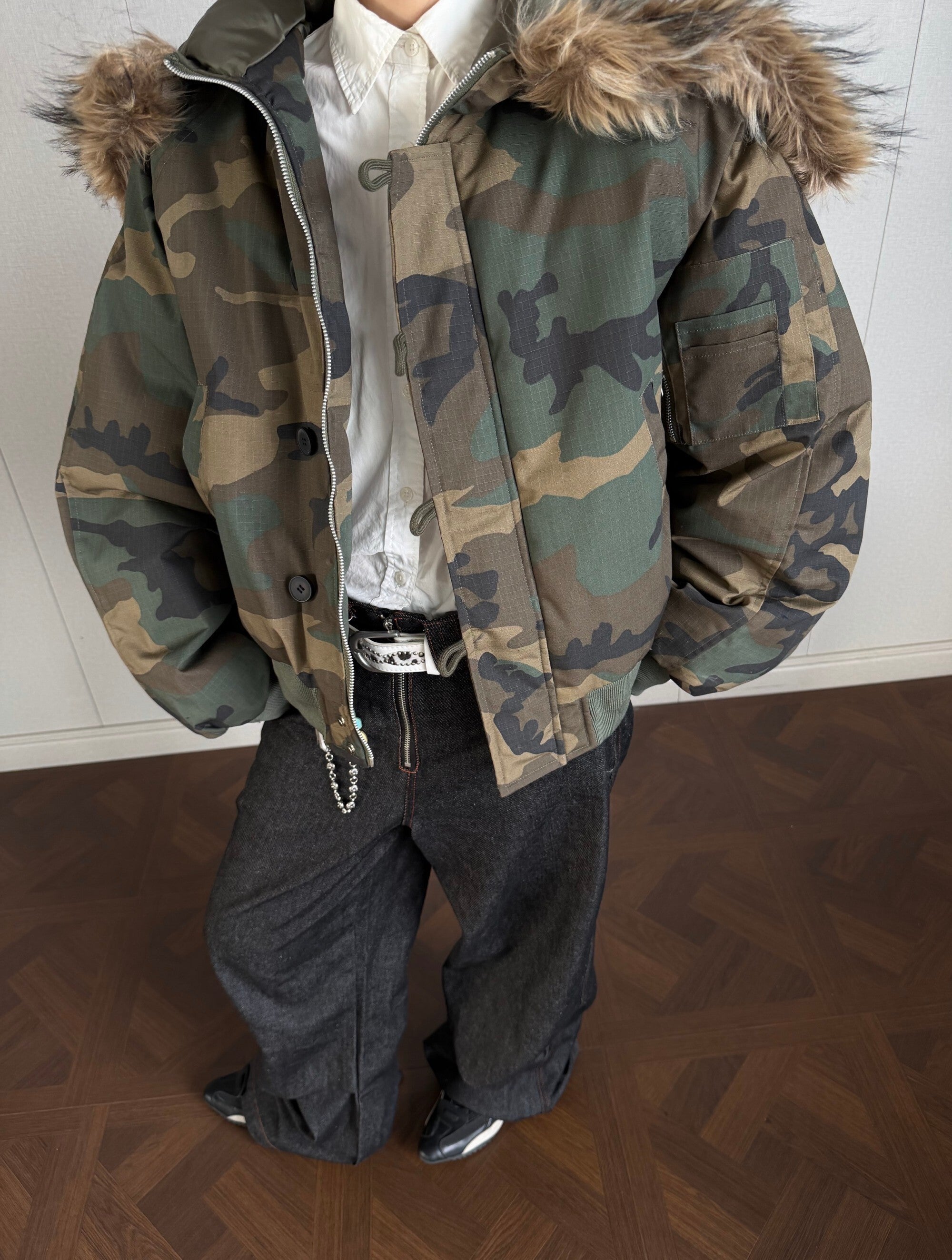 The Omirad Camo Fur-Hood Puffer Jacket reimagines classic military camouflage with a modern streetwear twist. Made from a 65% polyester and 35% cotton fabric blend, this jacket offers excellent durability, wind resistance, and comfort. The detachable faux fur hood trim adds both warmth and a bold winter aesthetic, while the cropped bomber cut gives it a structured silhouette. Functional flap and sleeve pockets enhance utility, and large front buttons with hidden zippers add depth to the design.