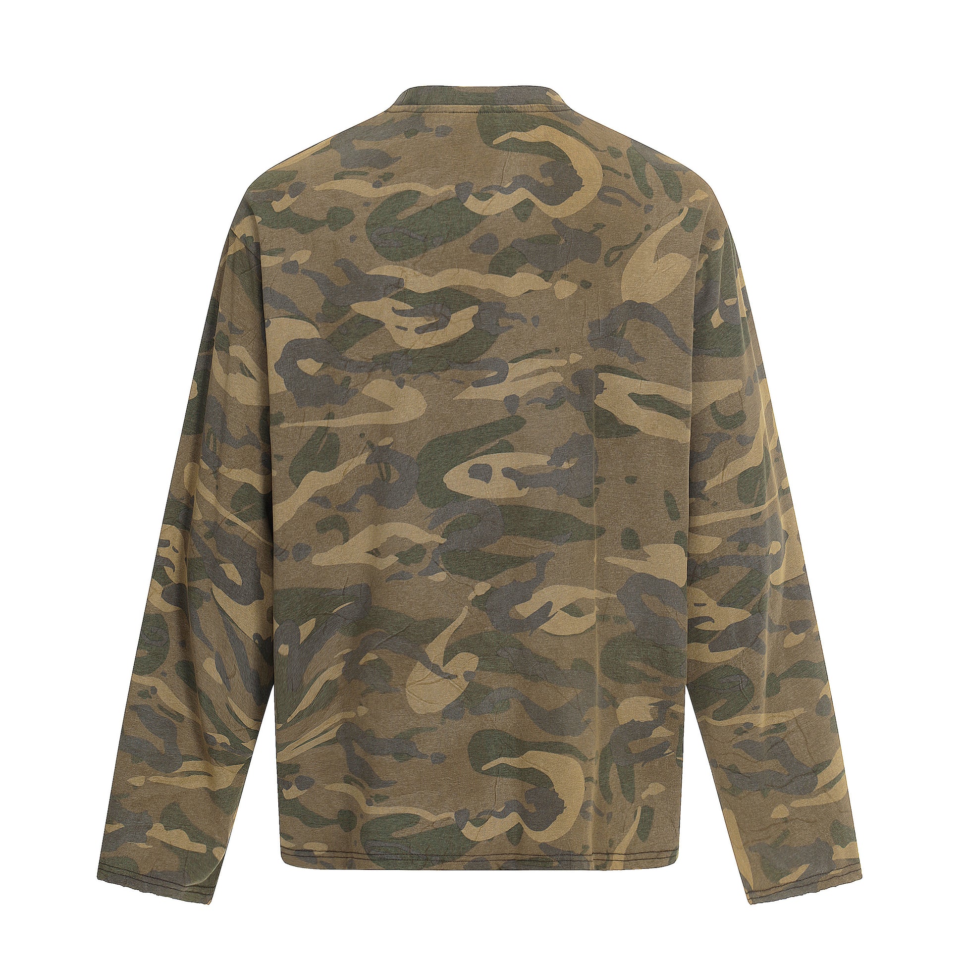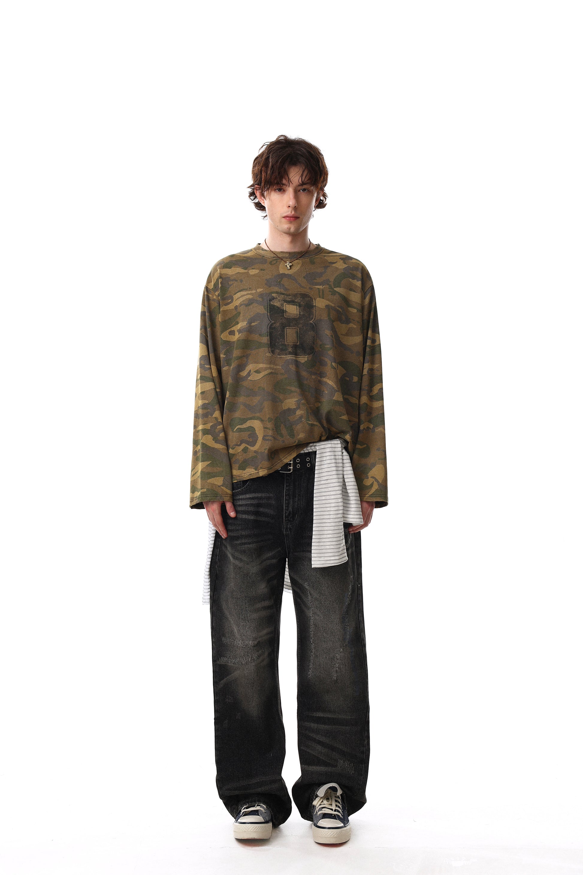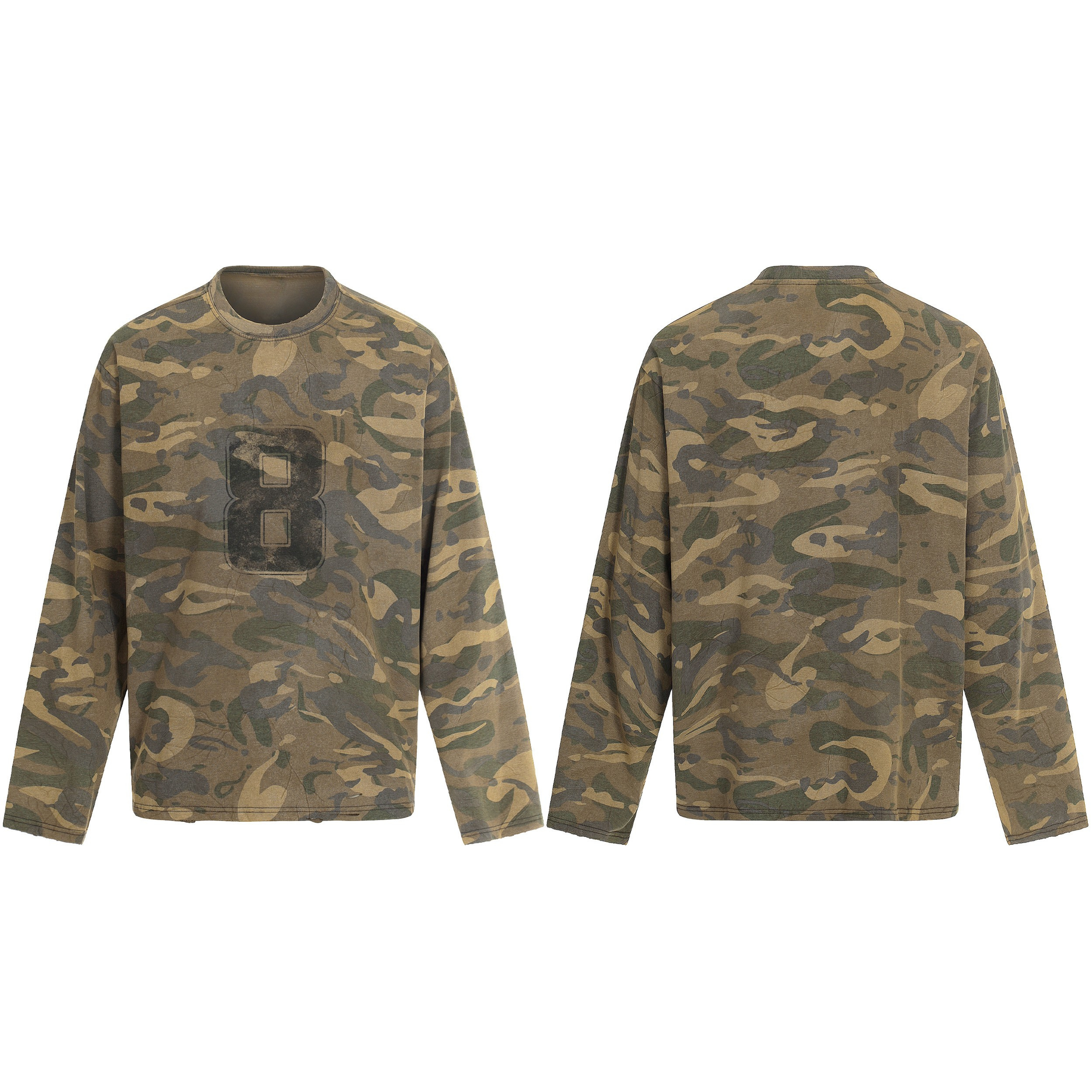 Clothing details: All-over camouflage pattern, front number graphic print, classic crew neckline, long sleeves, straight hem, relaxed fit.