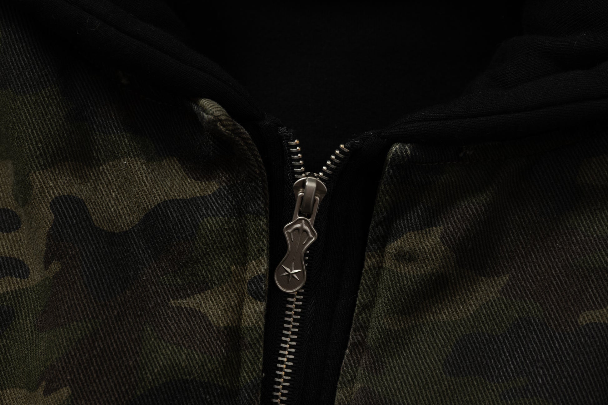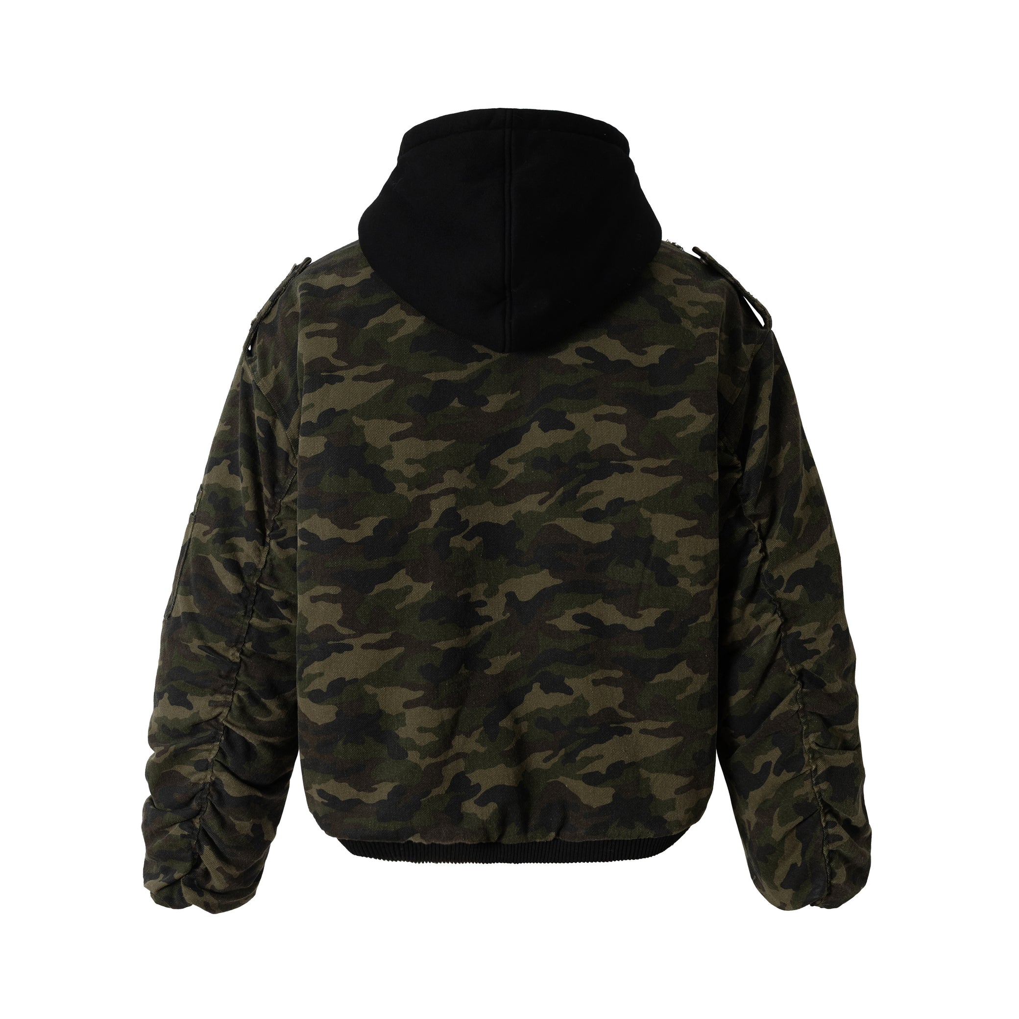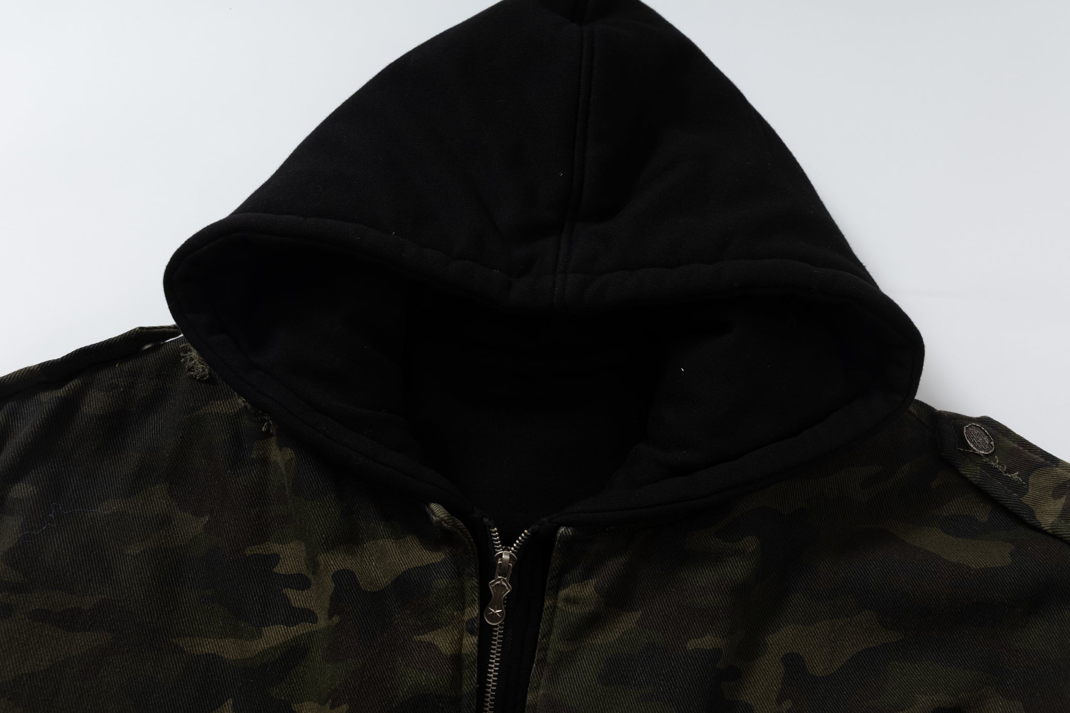 Clothing details: Camouflage print, metal hook closures, distressed detailing, layered hood design, ruched sleeves