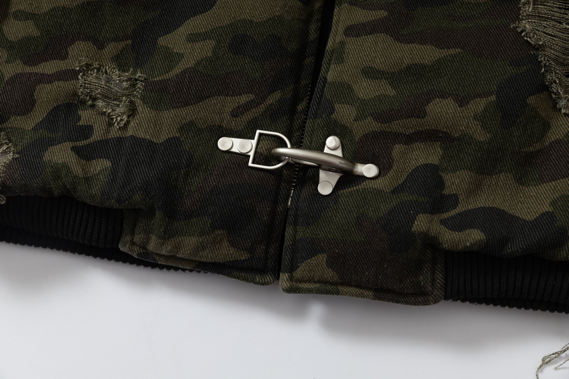 The Omirad Camo Hook Detail Distressed Jacket brings a rugged military aesthetic with a modern streetwear edge. Featuring a full camouflage pattern with raw distressed accents and metal hook closures, this piece combines rebellion and craftsmanship. The inner black hood adds depth and layering versatility, while the ruched sleeves enhance the structured silhouette. Made from a soft cotton-spandex blend, it offers both durability and comfort for any street-ready fit.