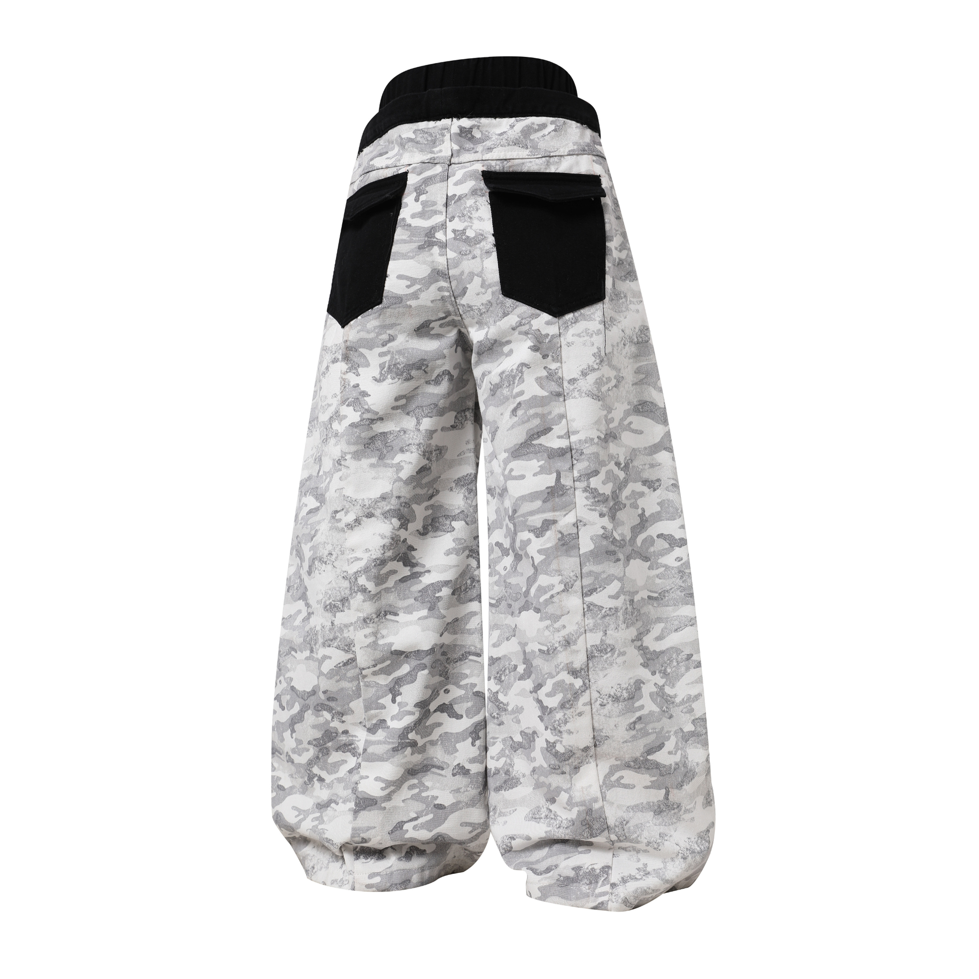 Clothing details: Camo print, contrast patch pockets, lace-up adjustable waist, curved wide-leg silhouette, stacked hem design.