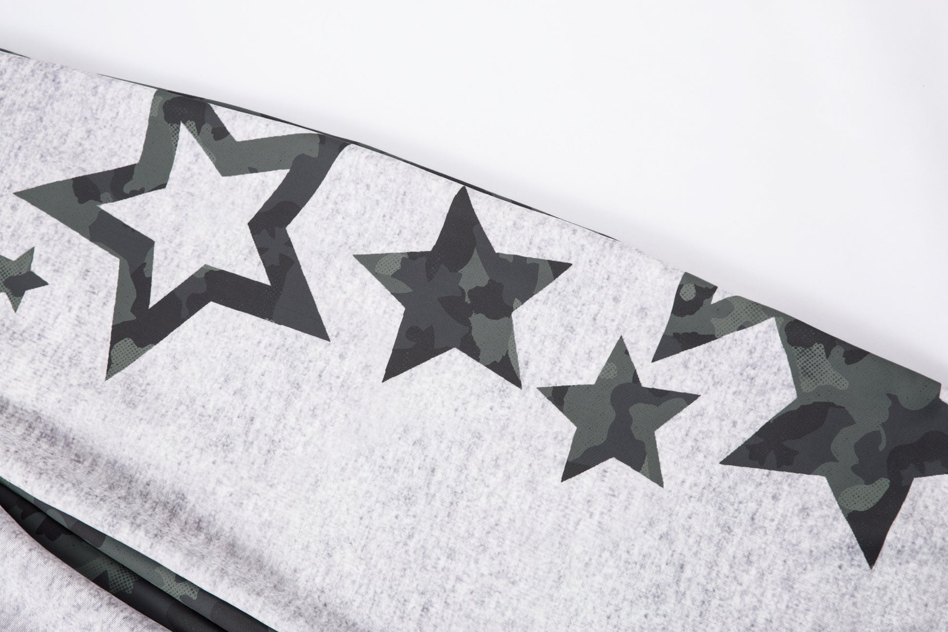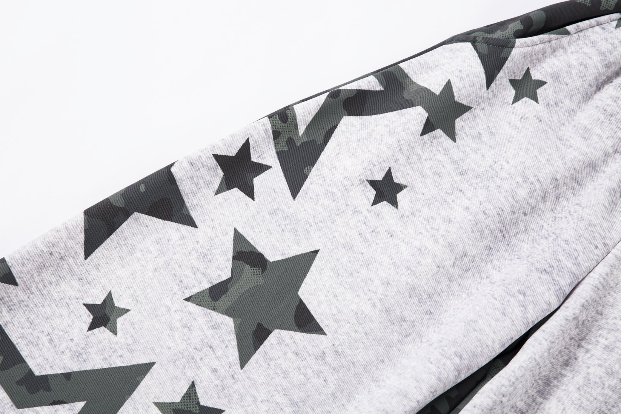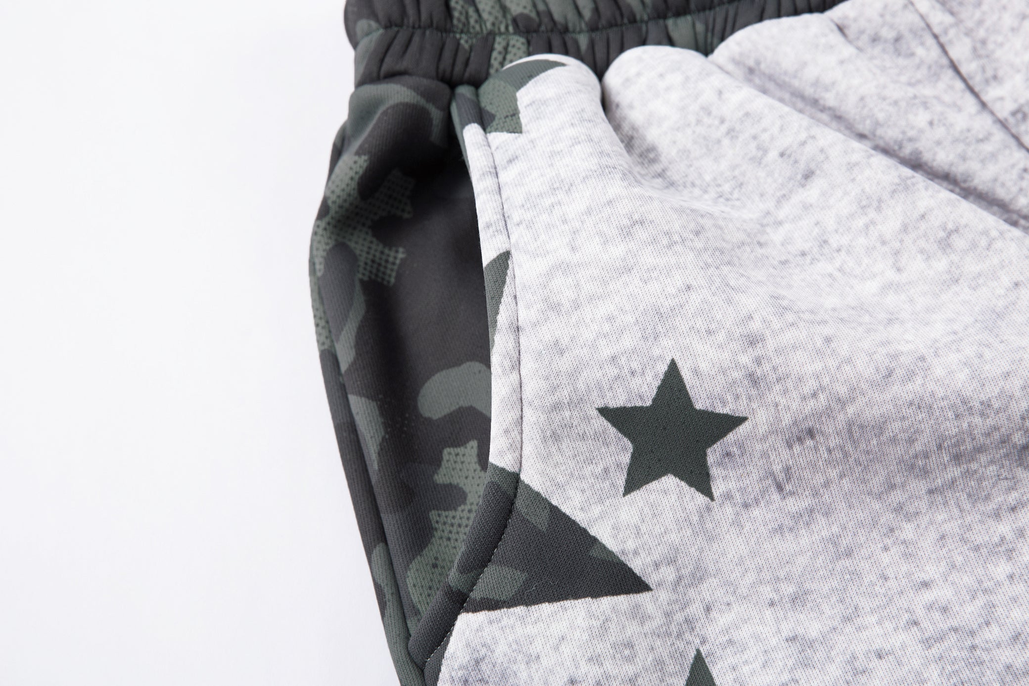 Clothing details: Star and camo patchwork design, wide-leg fit, elastic waistband
