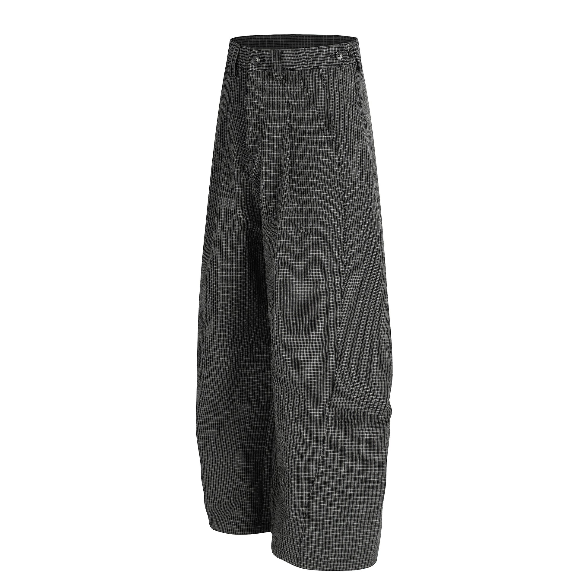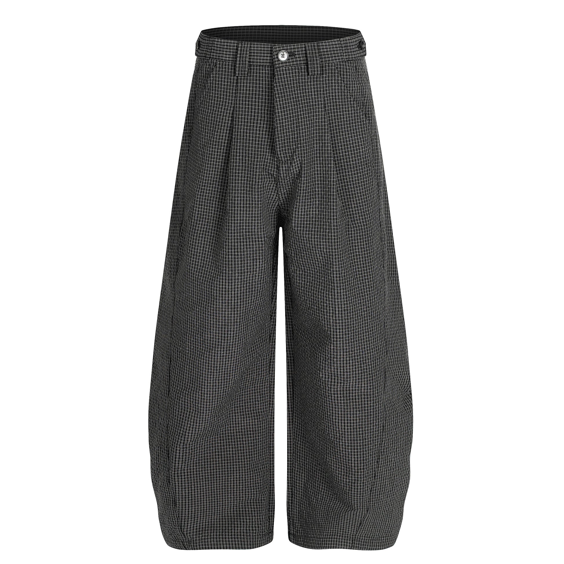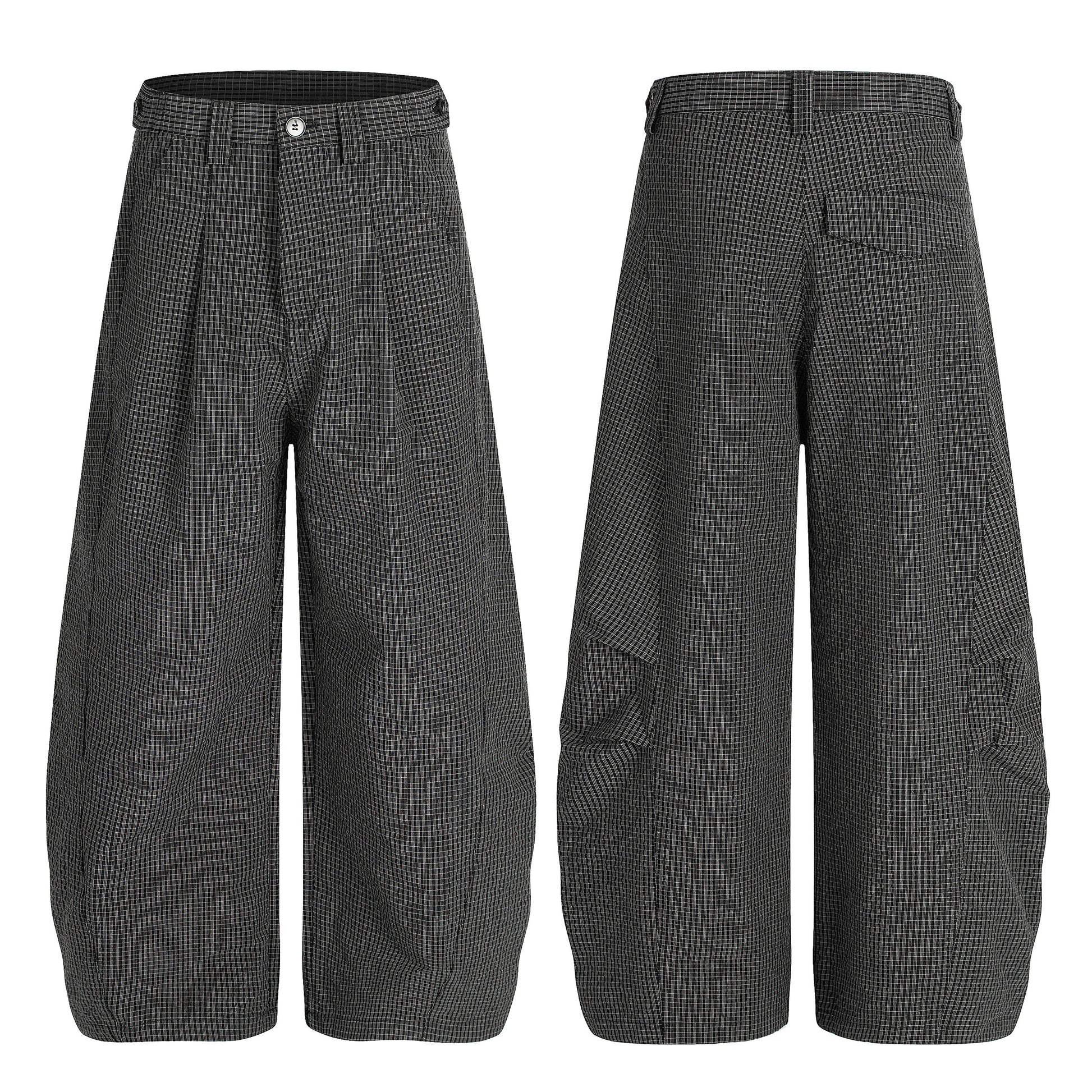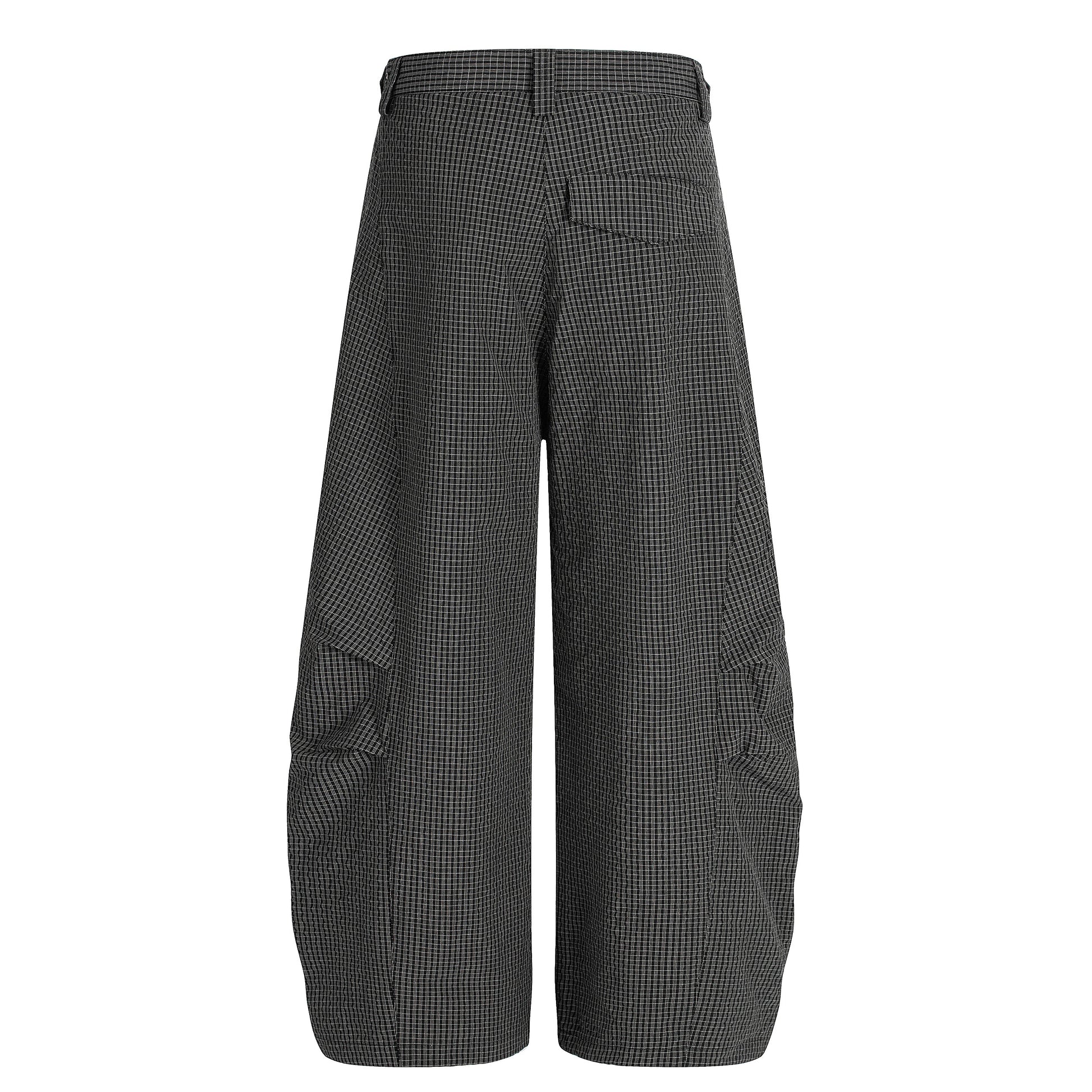 Clothing details: Checked pattern, wide curved-leg fit, pleated front, single back flap pocket, lightweight texture with structured drape.