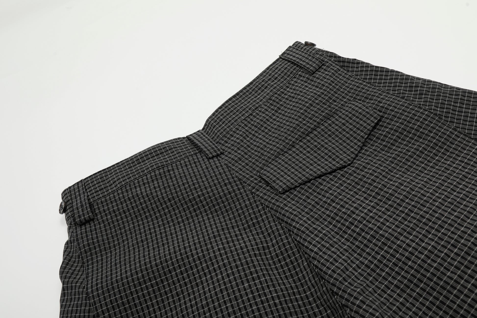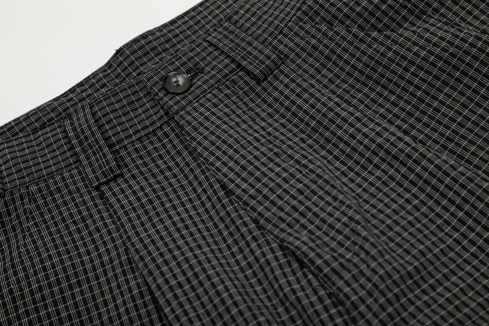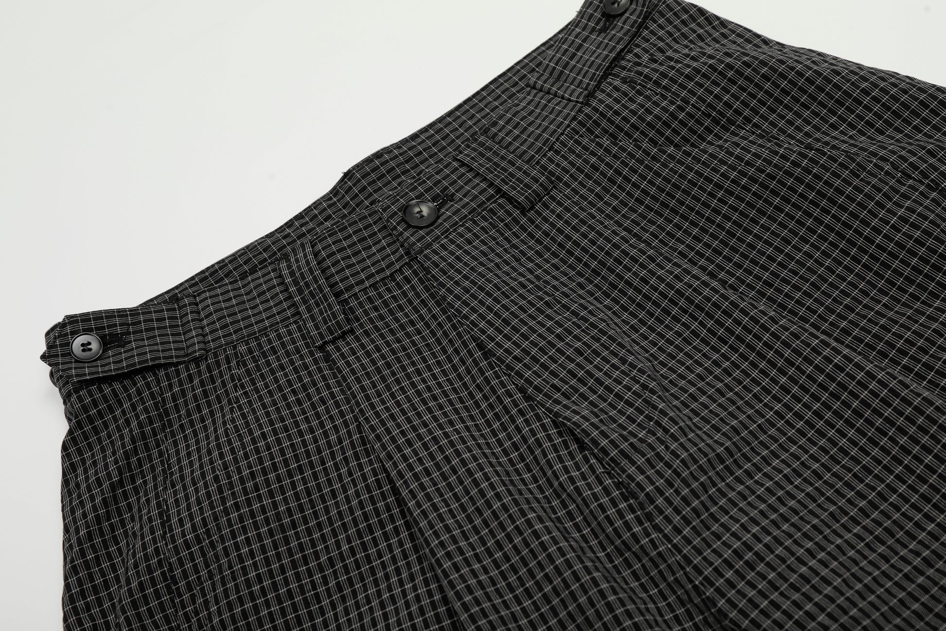 Clothing details: Checked pattern, wide curved-leg fit, pleated front, single back flap pocket, lightweight texture with structured drape.