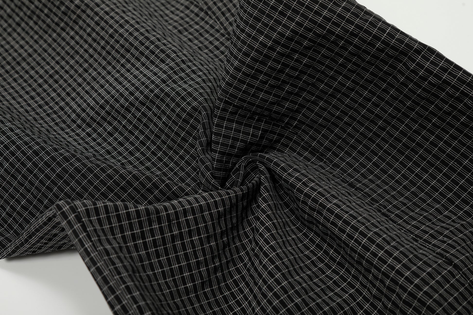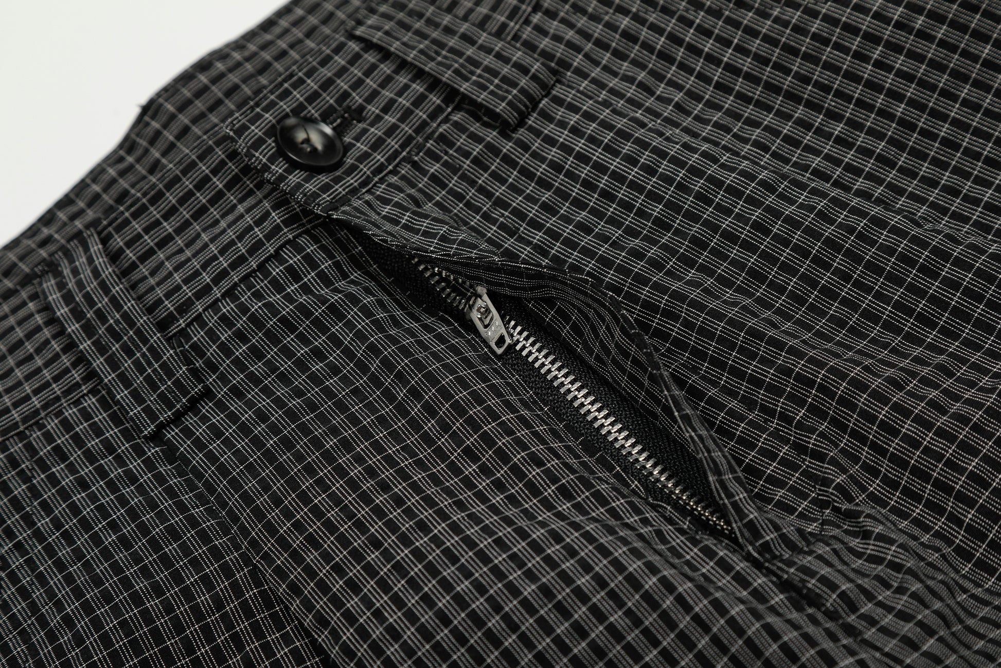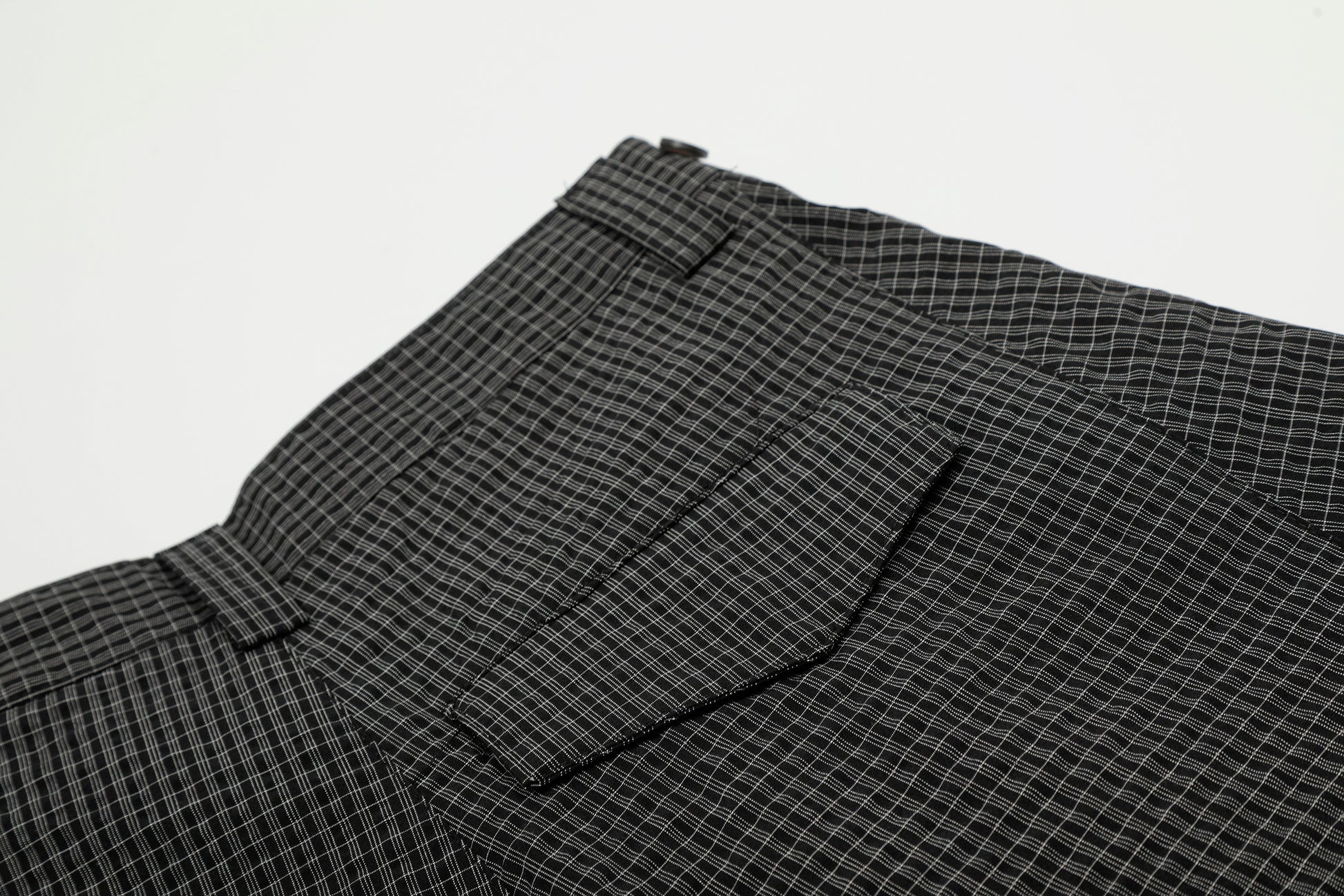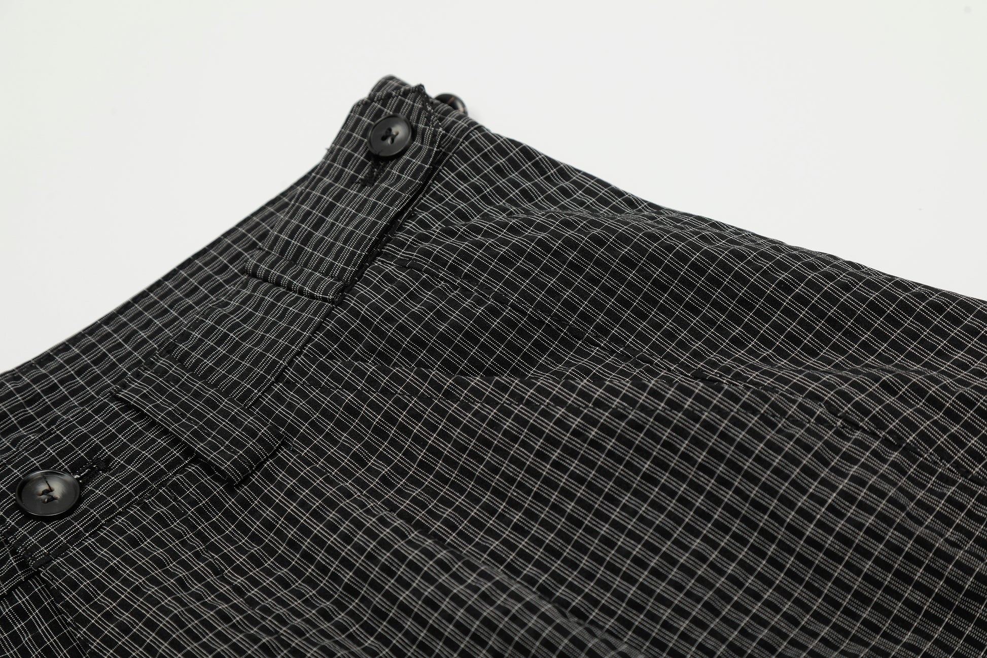 Clothing details: Checked pattern, wide curved-leg fit, pleated front, single back flap pocket, lightweight texture with structured drape.