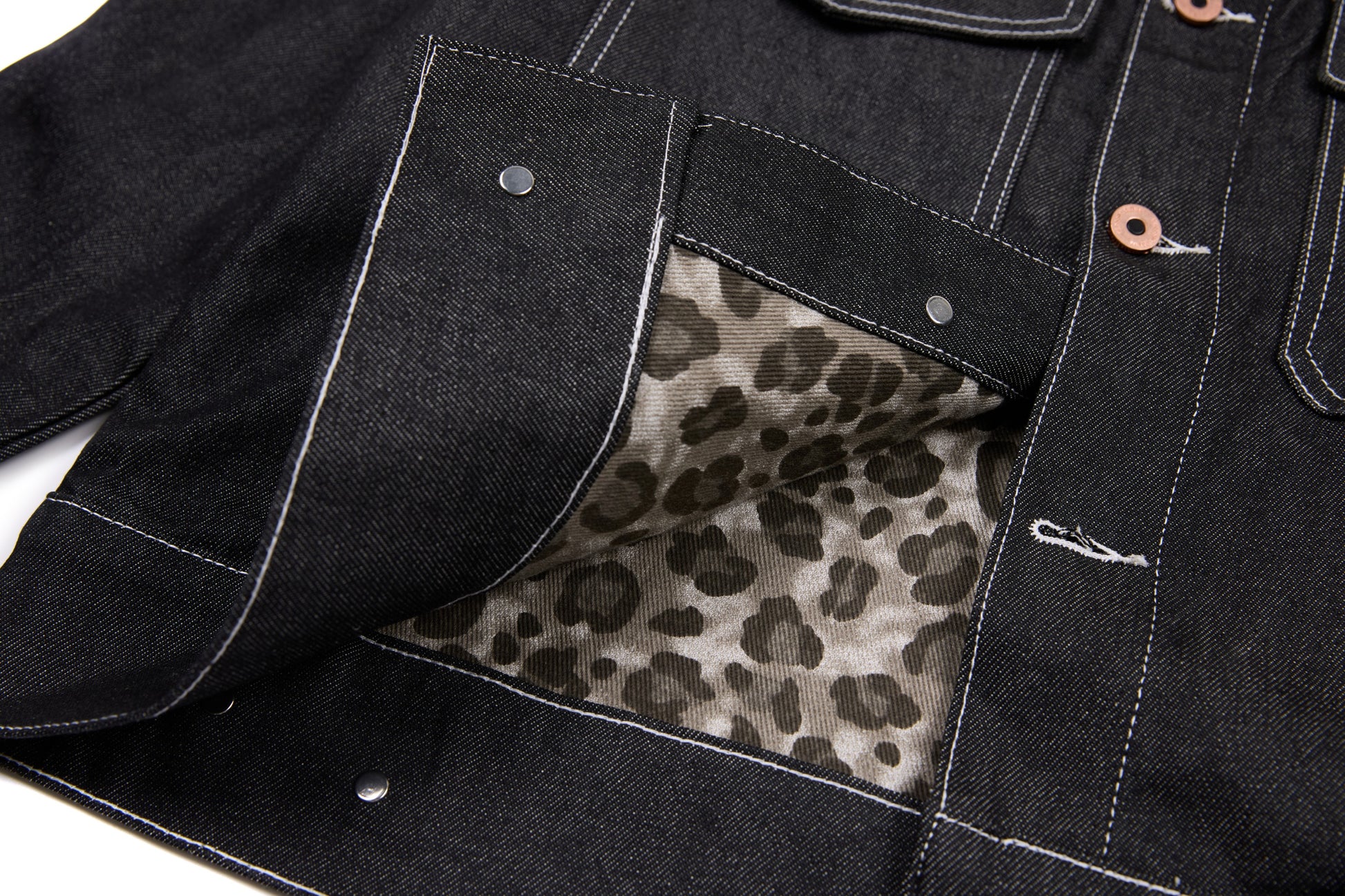 Clothing Details: Contrast stitching, double chest pockets, copper button closure, leopard-print inner lining, cropped denim fit