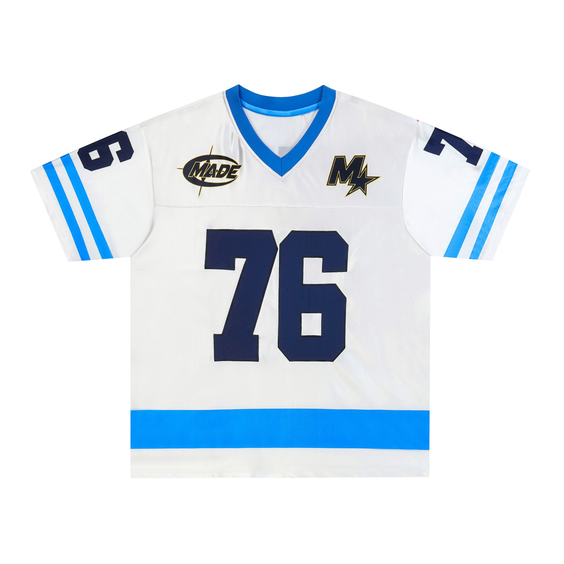 Clothing details: Oversized varsity number graphics, contrast stripe accents, clean logo detailing, breathable performance mesh construction, V-neck collar, relaxed athletic street fit