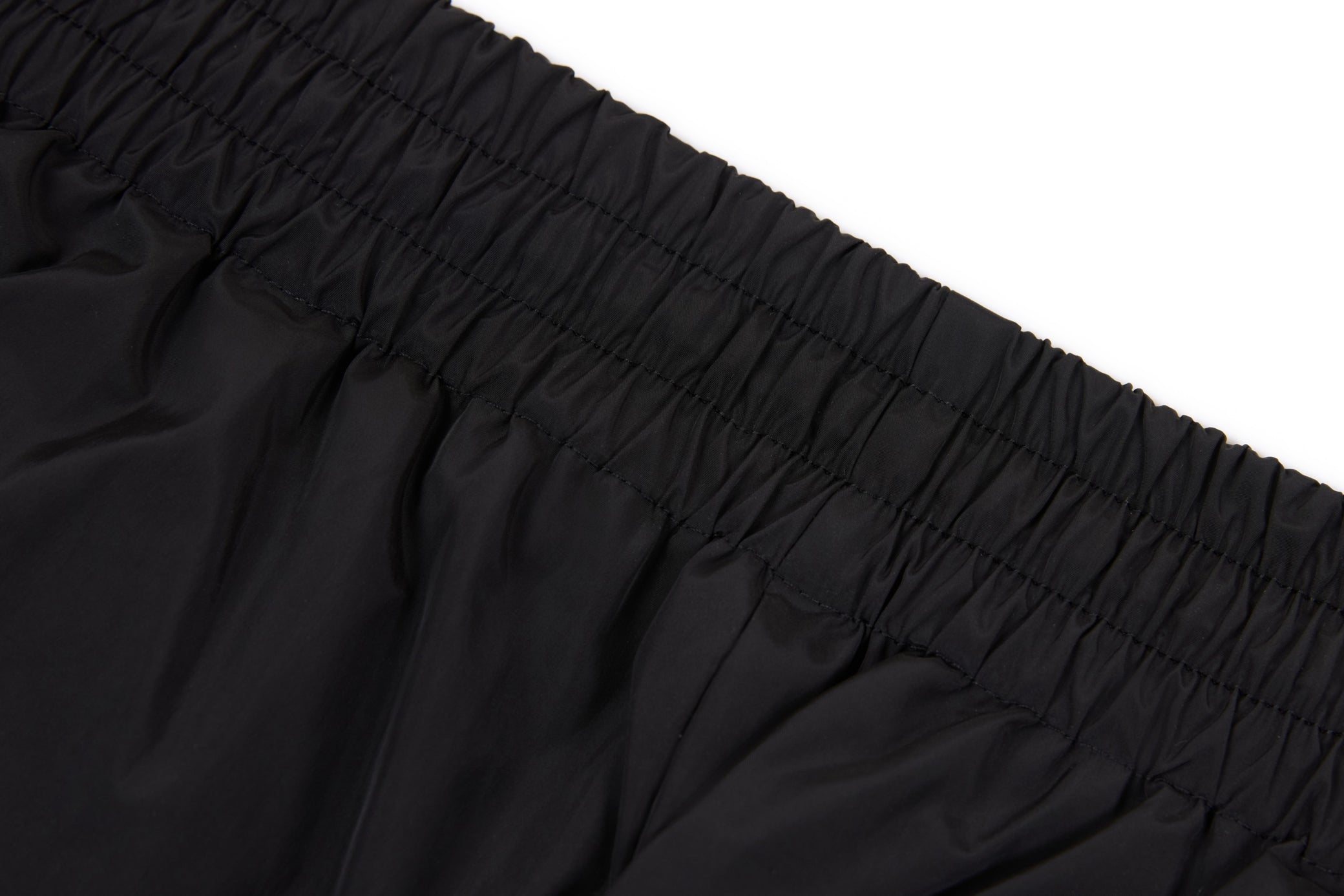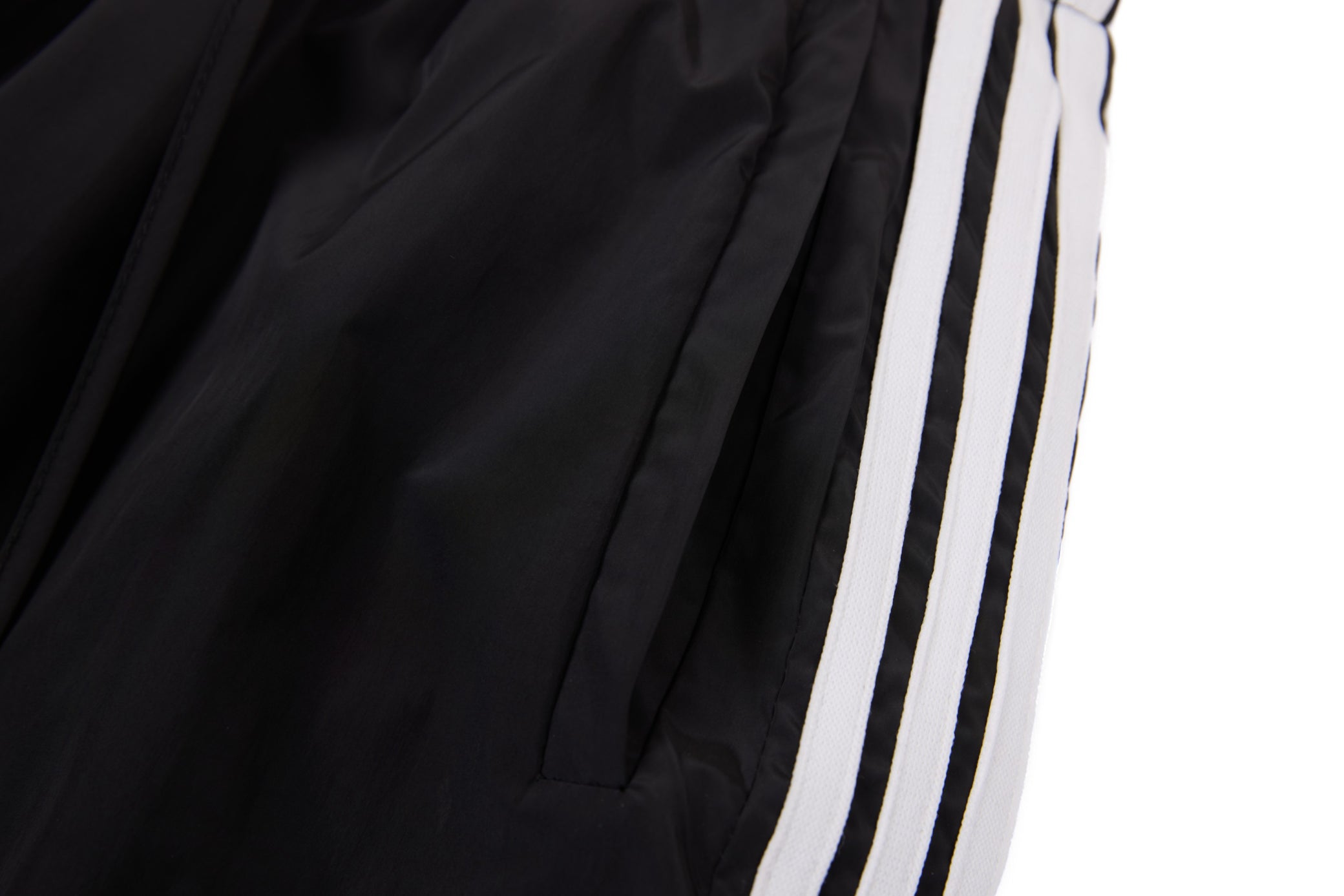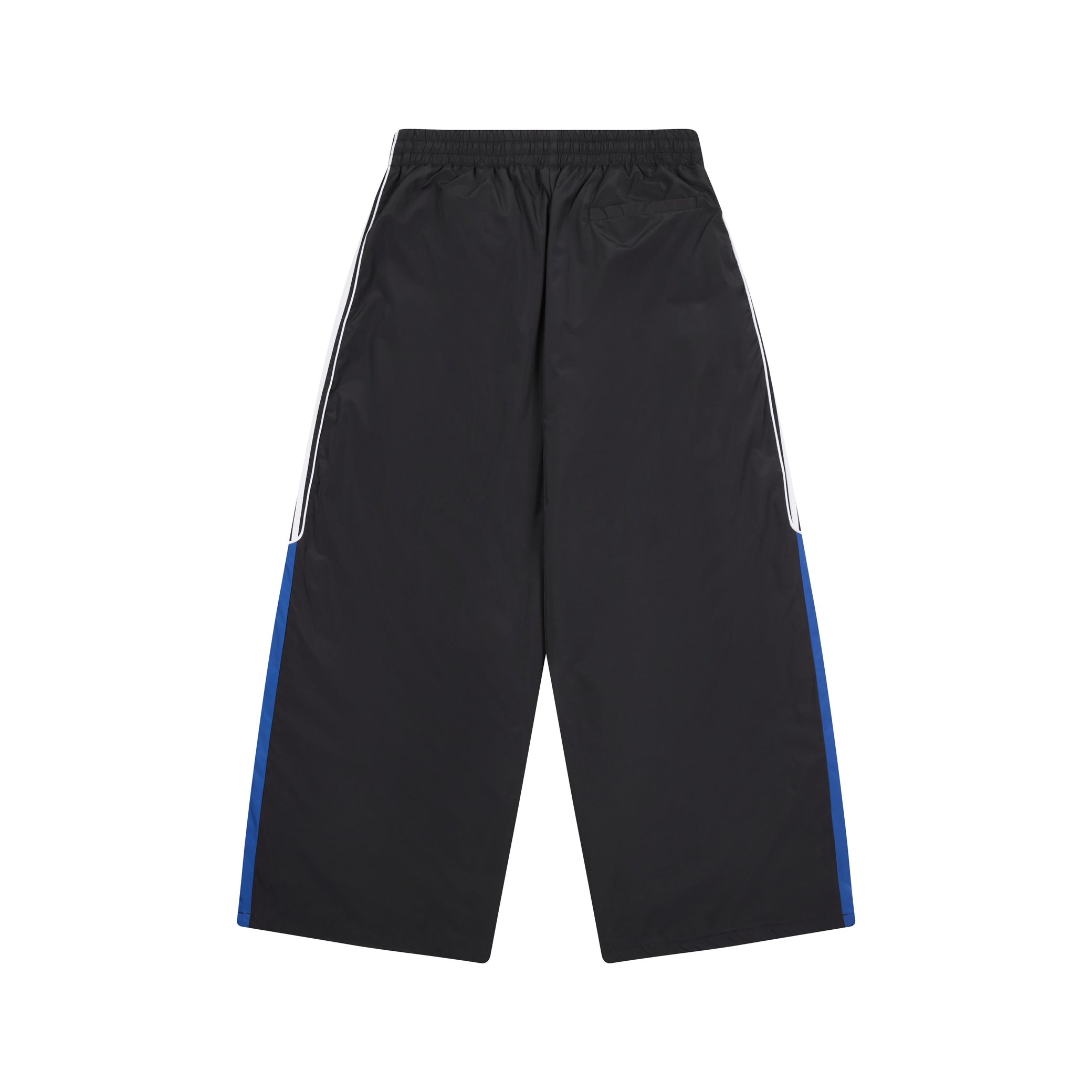 Clothing details: Elastic waistband with adjustable drawstring, contrast side stripe and panel detailing, wide-leg relaxed fit, side hand pockets, lightweight athletic construction.