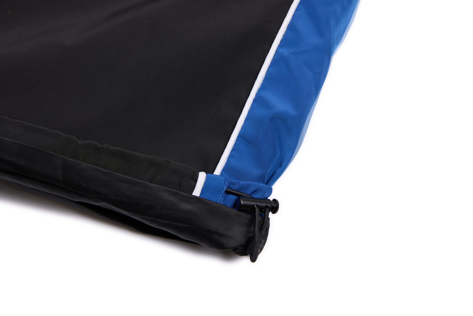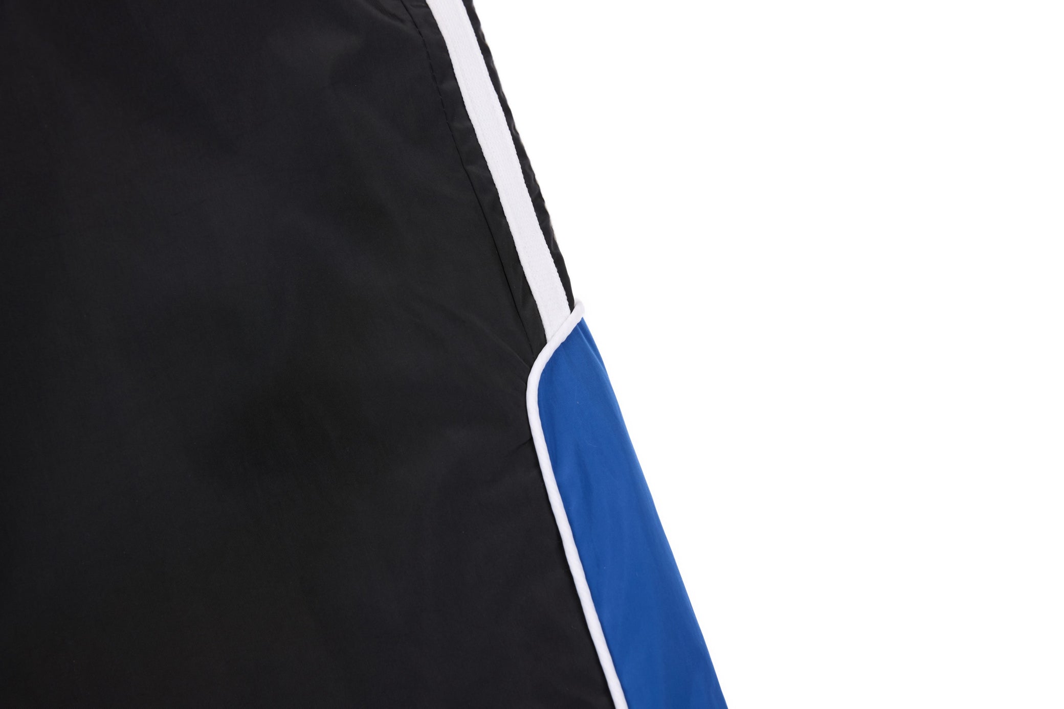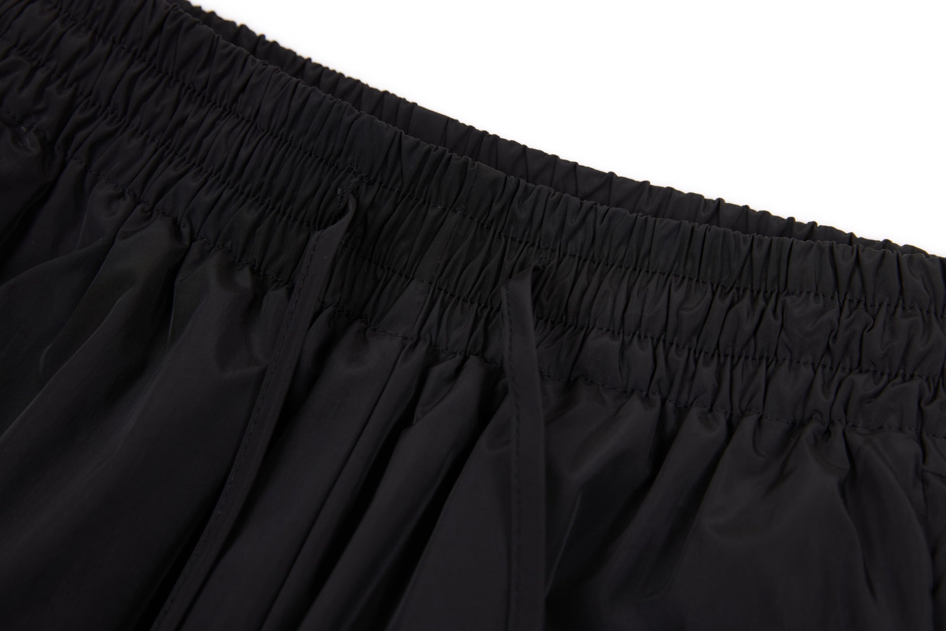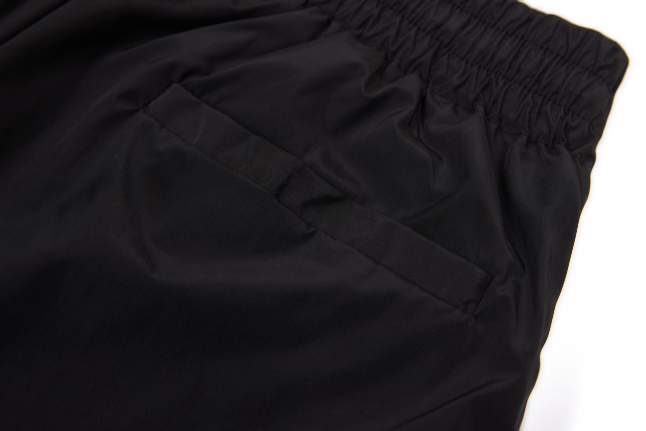 Clothing details: Elastic waistband with adjustable drawstring, contrast side stripe and panel detailing, wide-leg relaxed fit, side hand pockets, lightweight athletic construction.