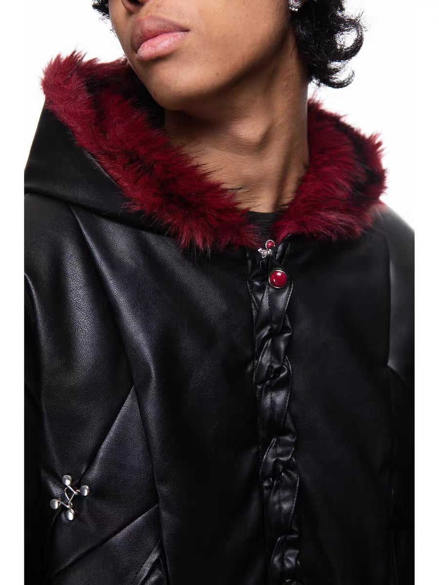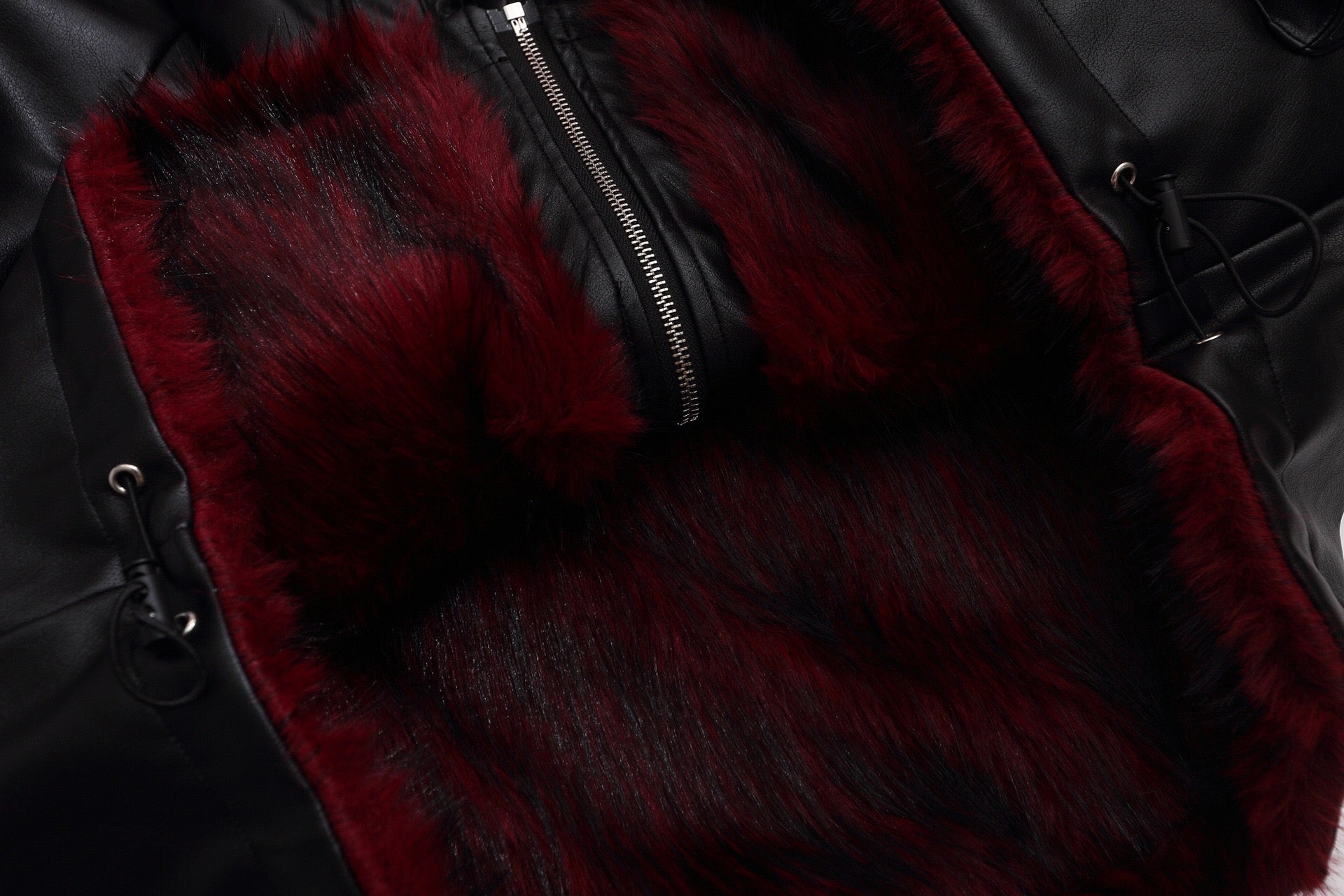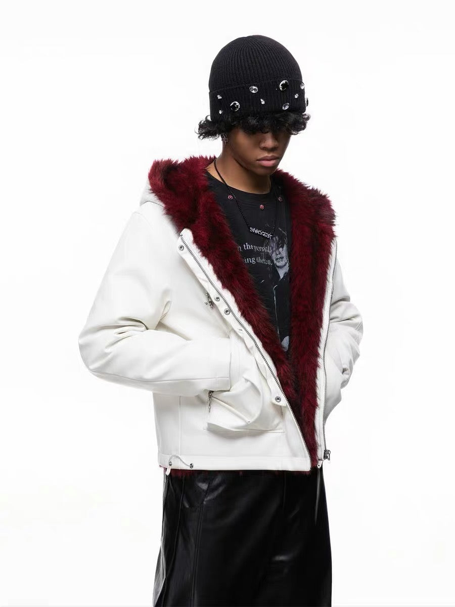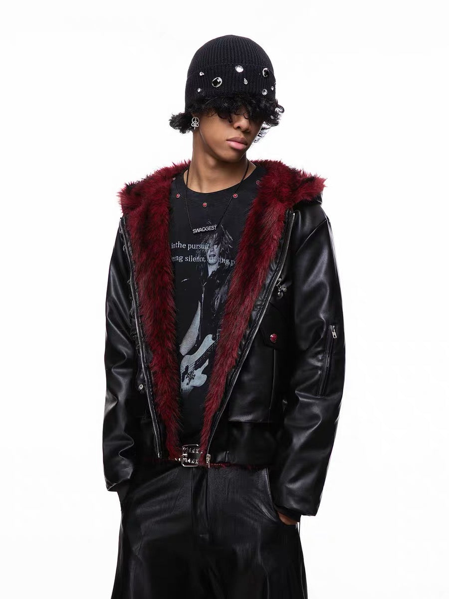 The Omirad Contrast Fur PU Jacket features a smooth faux-leather shell paired with a deep red faux-fur hood and hem for a bold winter look. Structured paneling, metal cross rivets, and oversized utility pockets add a sharp streetwear edge while keeping the fit warm and functional.