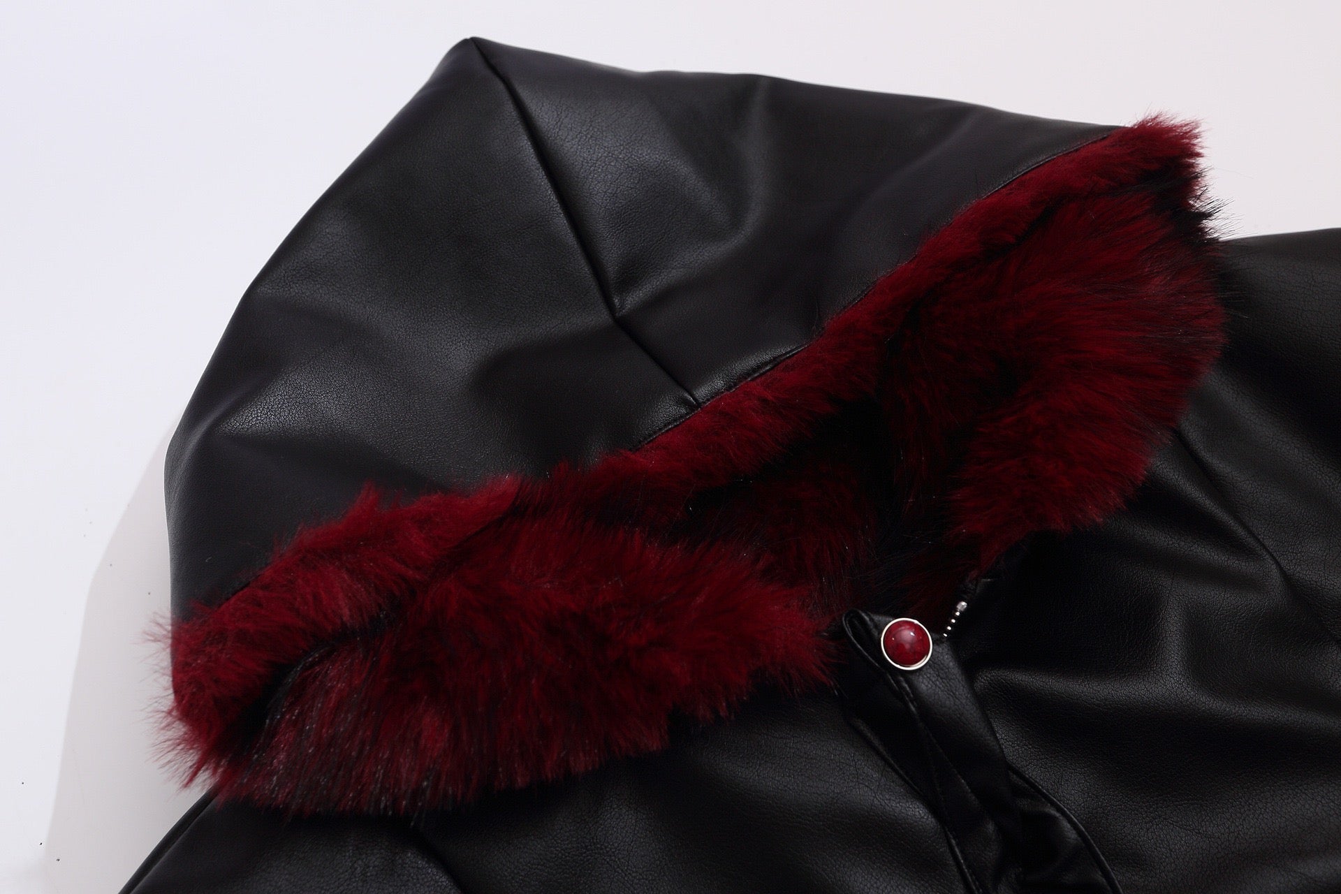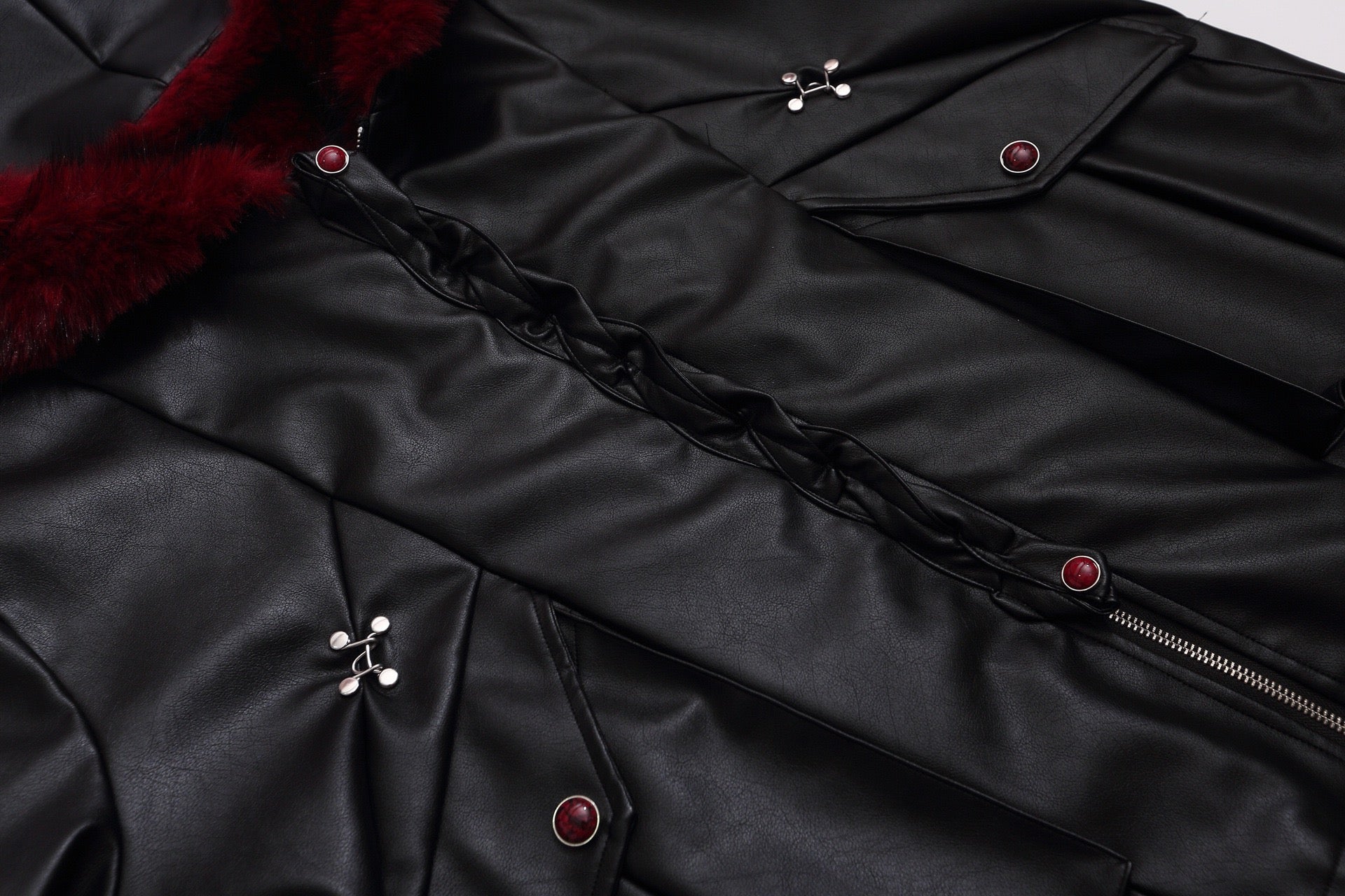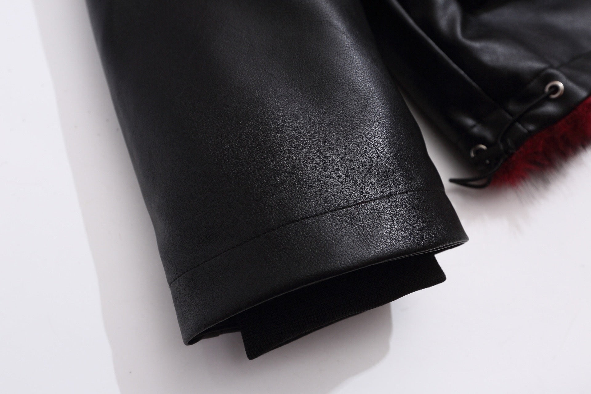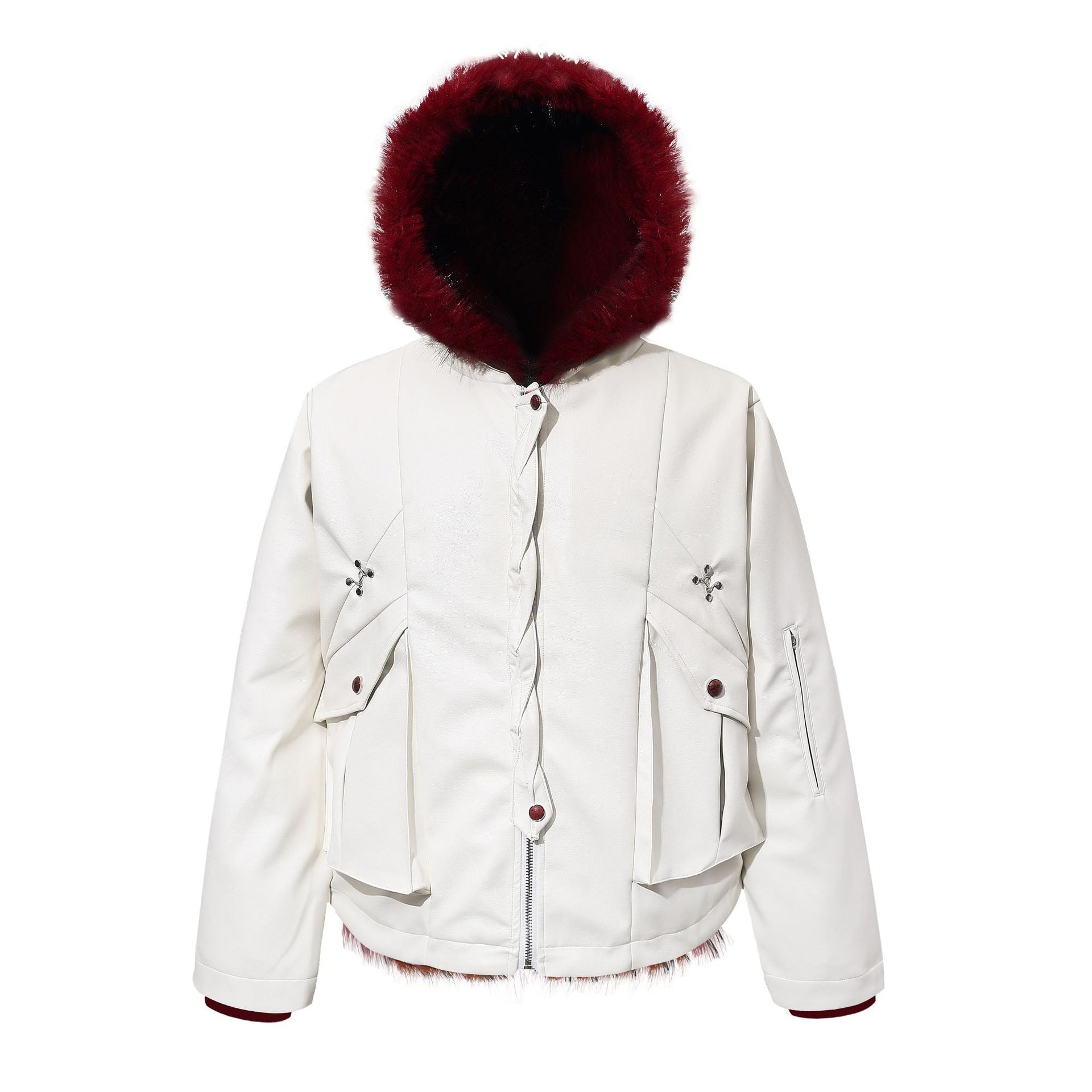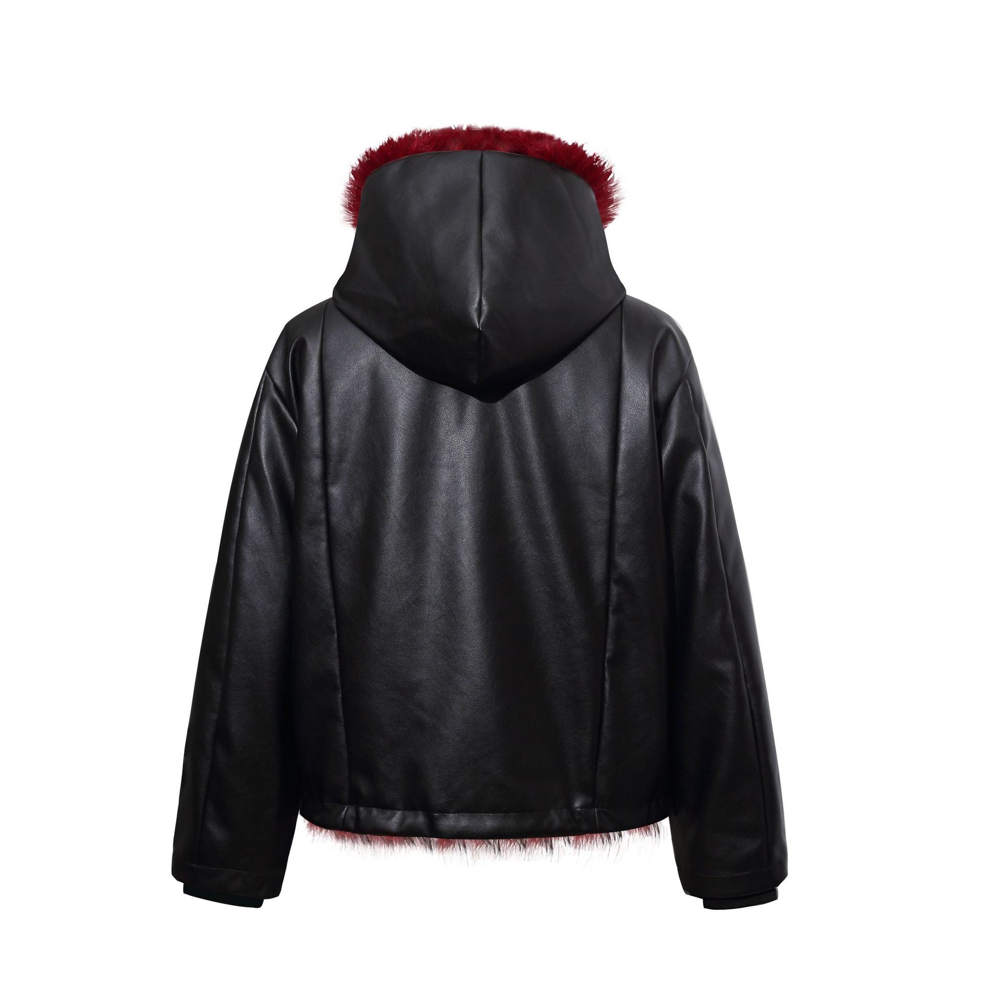 The Omirad Contrast Fur PU Jacket features a smooth faux-leather shell paired with a deep red faux-fur hood and hem for a bold winter look. Structured paneling, metal cross rivets, and oversized utility pockets add a sharp streetwear edge while keeping the fit warm and functional.
